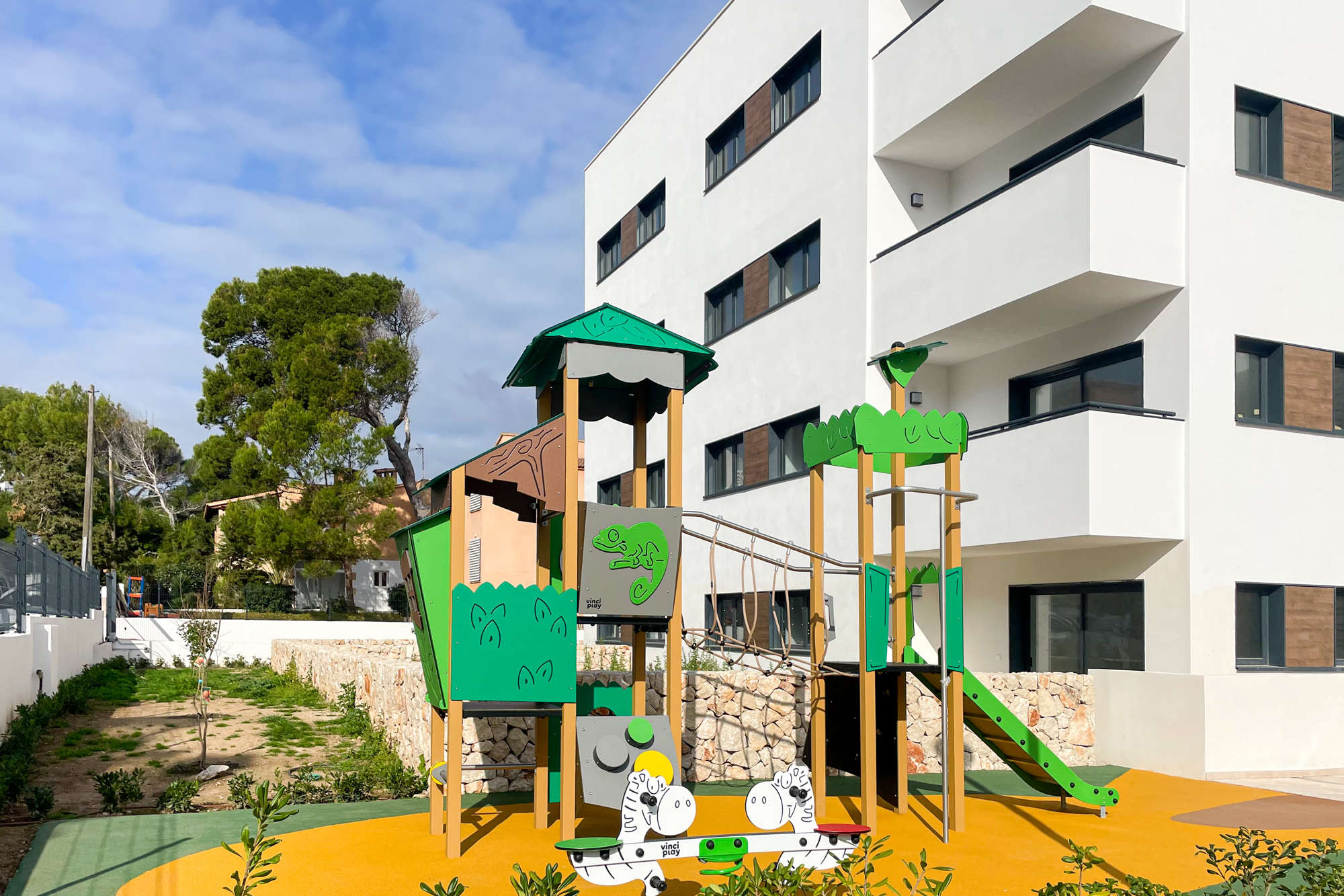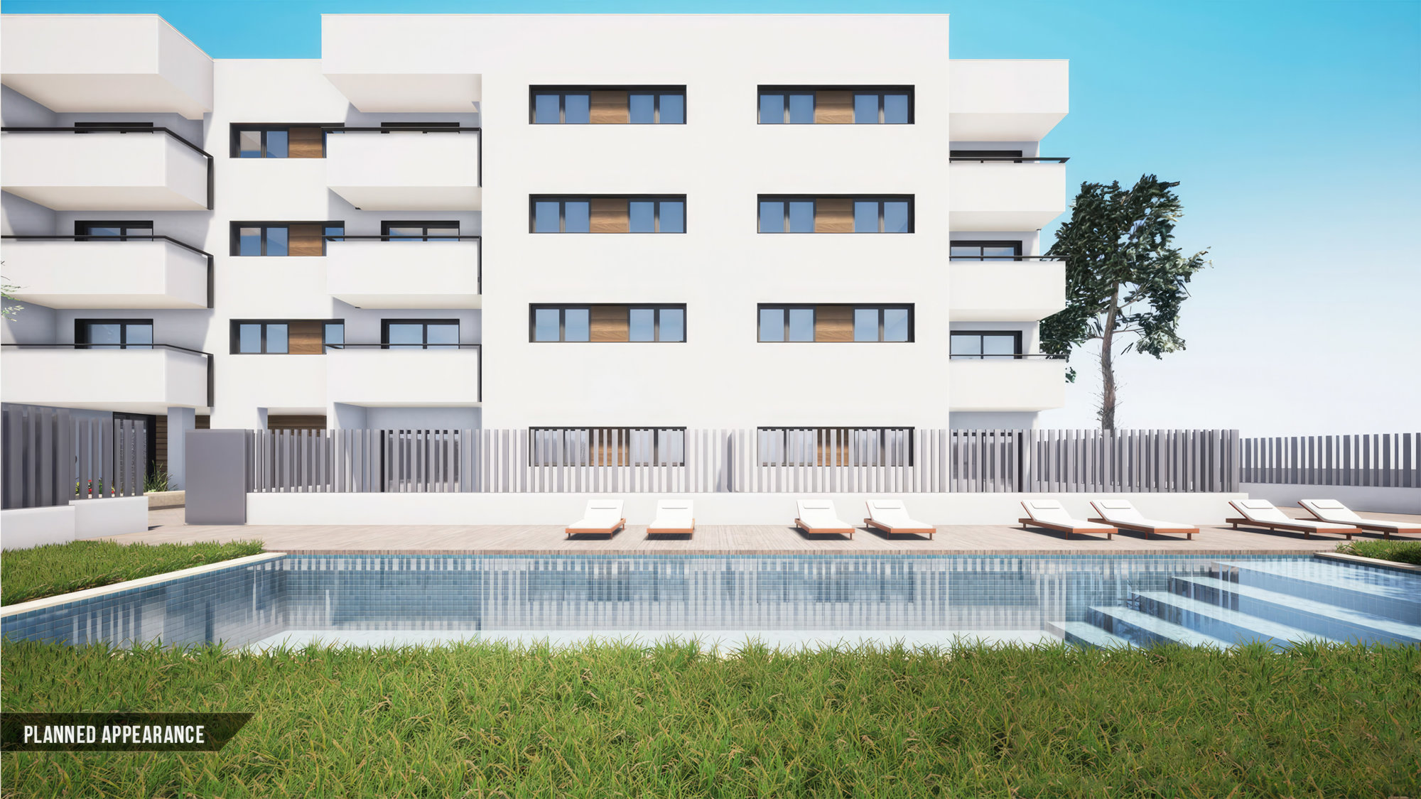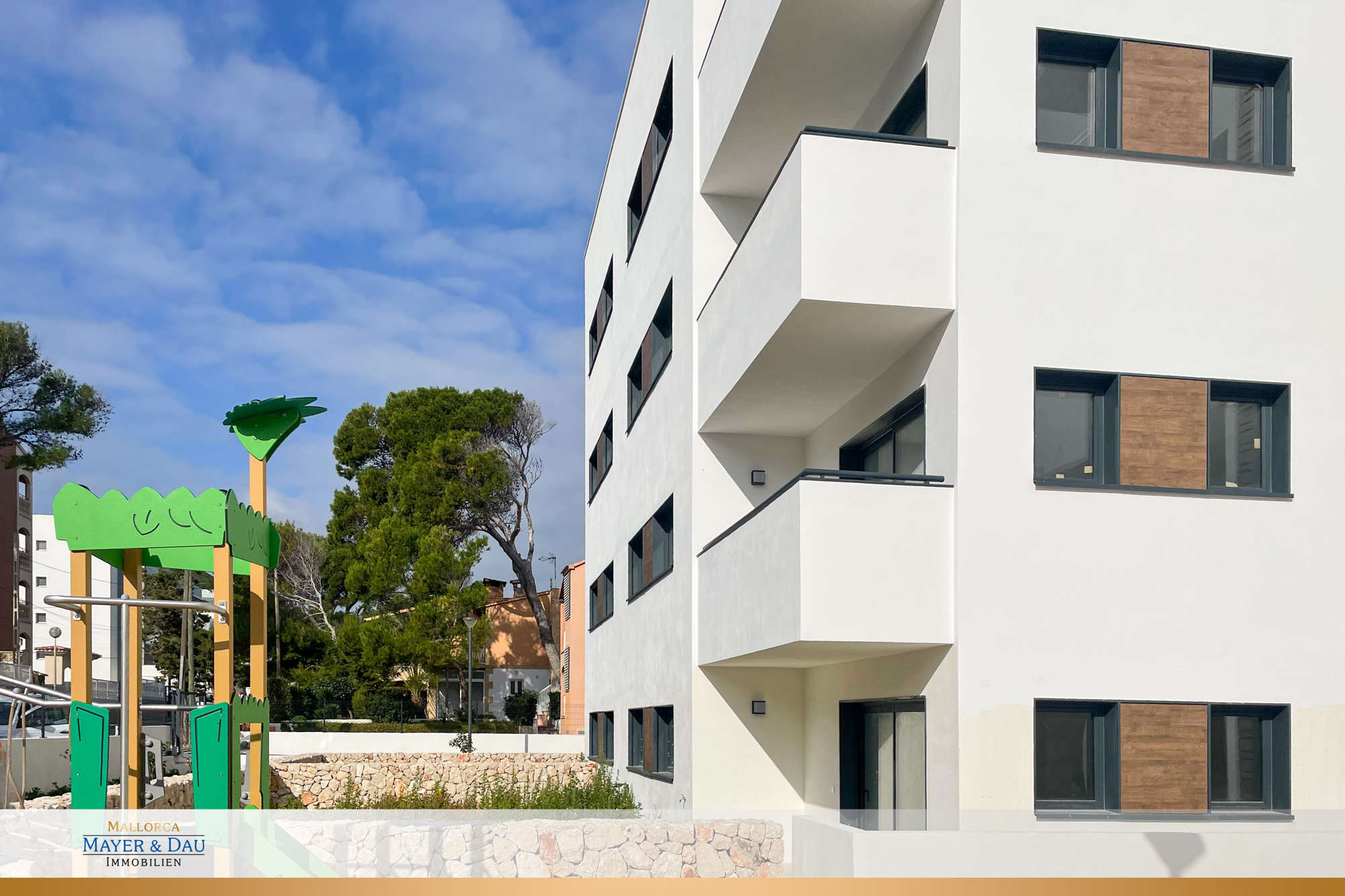 33 Außenstellplätze, ein Gemeinschaftspool mit einer Sonnenterrasse sowie ein Kinderspielplatz runden das Angebot ab. Wallboxen für Elektroautos sind ebenfalls vorinstalliert.