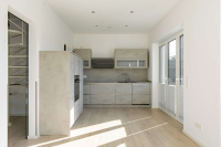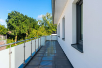 Das Herzstück des Penthouses ist der offene Wohn- und Küchenbereich: lichtdurchflutet und perfekt für gesellige Stunden oder entspannte Abende zuhause. Die stilvolle Einbauküche ist mit allen notwendigen Geräten ausgestattet und bietet direkten Zugang zu einem großzügigen doppelten Eckbalkon mit Markise – der perfekte Platz für einen Freisitz, Frühstück im Freien oder einfach nur, um die herrliche Aussicht auf die gepflegte Nachbarschaft und das grüne Umfeld zu genießen.