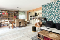 Schon beim Betreten des Hauses empfängt Sie eine elegante Wendeltreppe, die den dezenten Landhausstil unterstreicht. Das Herzstück bildet der offene Wohn- und Essbereich mit einer stilvollen Einbauküche samt Mittelinsel. Ein dekorativer Kamin sorgt hier für behagliche Momente, während das angrenzende, schön gestaltete Gästebad mit besonderer Tapete Akzente setzt.