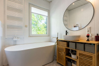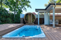 Das Herzstück des Außenbereichs ist der malerische rund 7.000 m² große See. Ob ein erfrischendes Bad im Wasser, inspirierende Stunden im idyllischen Seehaus oder ein Glas Wein bei Sonnenuntergang am Ufer – hier kommt die Seele zur Ruhe. Begleitet wird das Naturerlebnis von einer privaten Wellness-Oase: Ein sprudelnder Swimspa unter freiem Himmel, eine urige Fasssauna und eine großzügige Terrasse mit Weitblick ins Grüne laden zum Entspannen und Genießen ein.