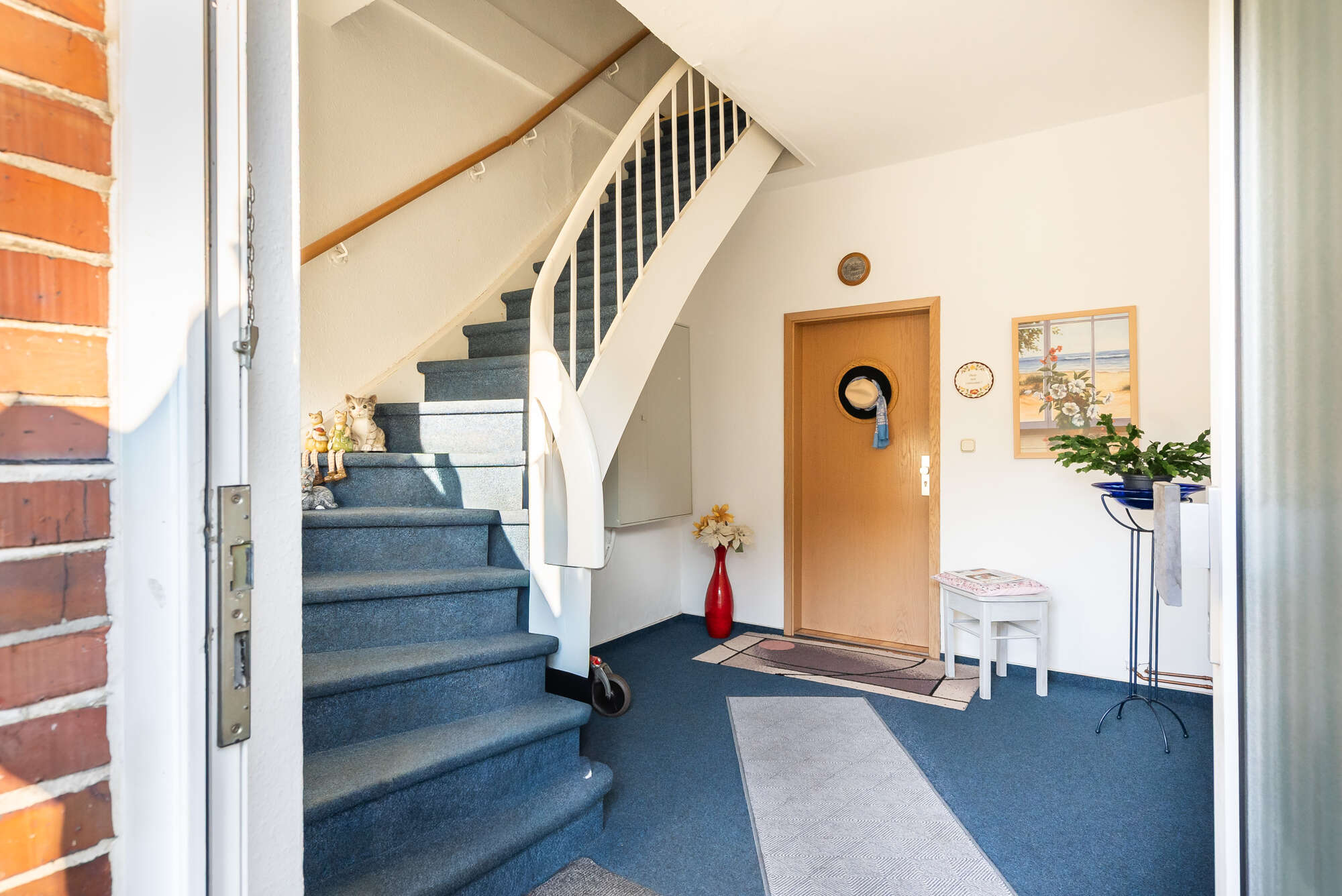 Über den gemeinsamen Hauseingangsbereich gelangen Sie über das Treppenhaus zur Wohnungstür dieser kompakten Wohnung.