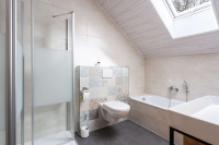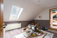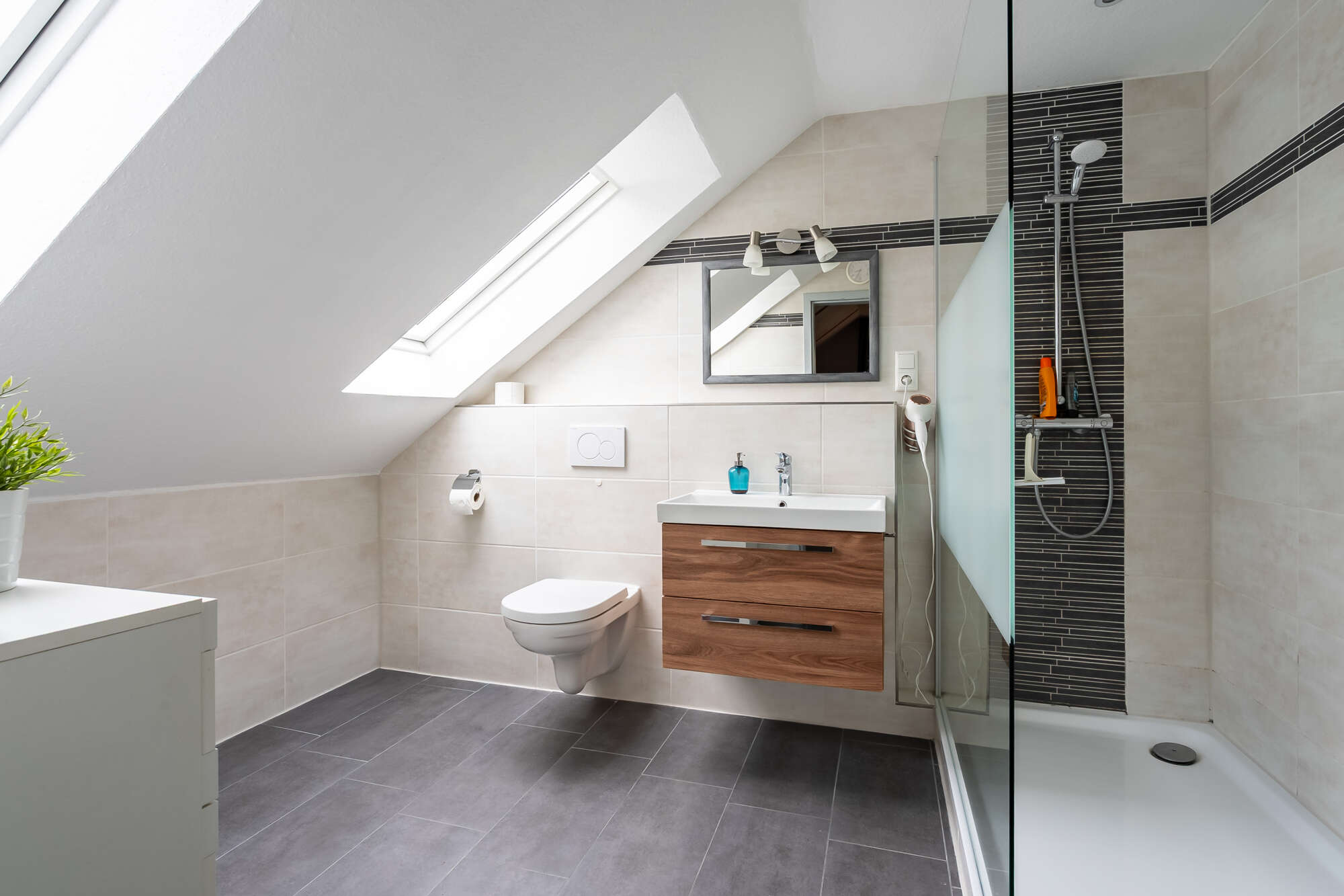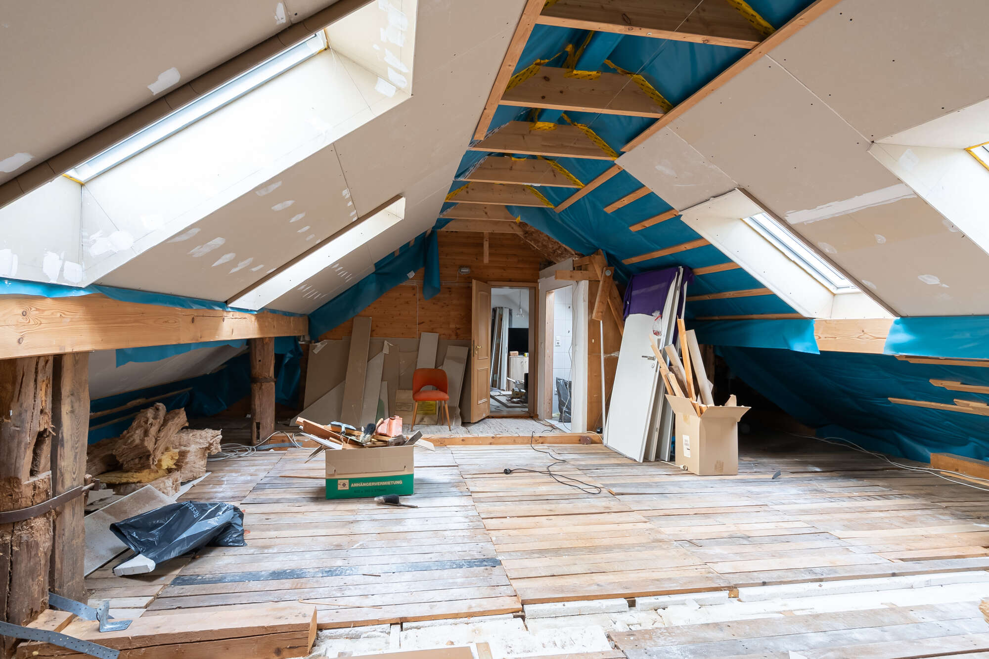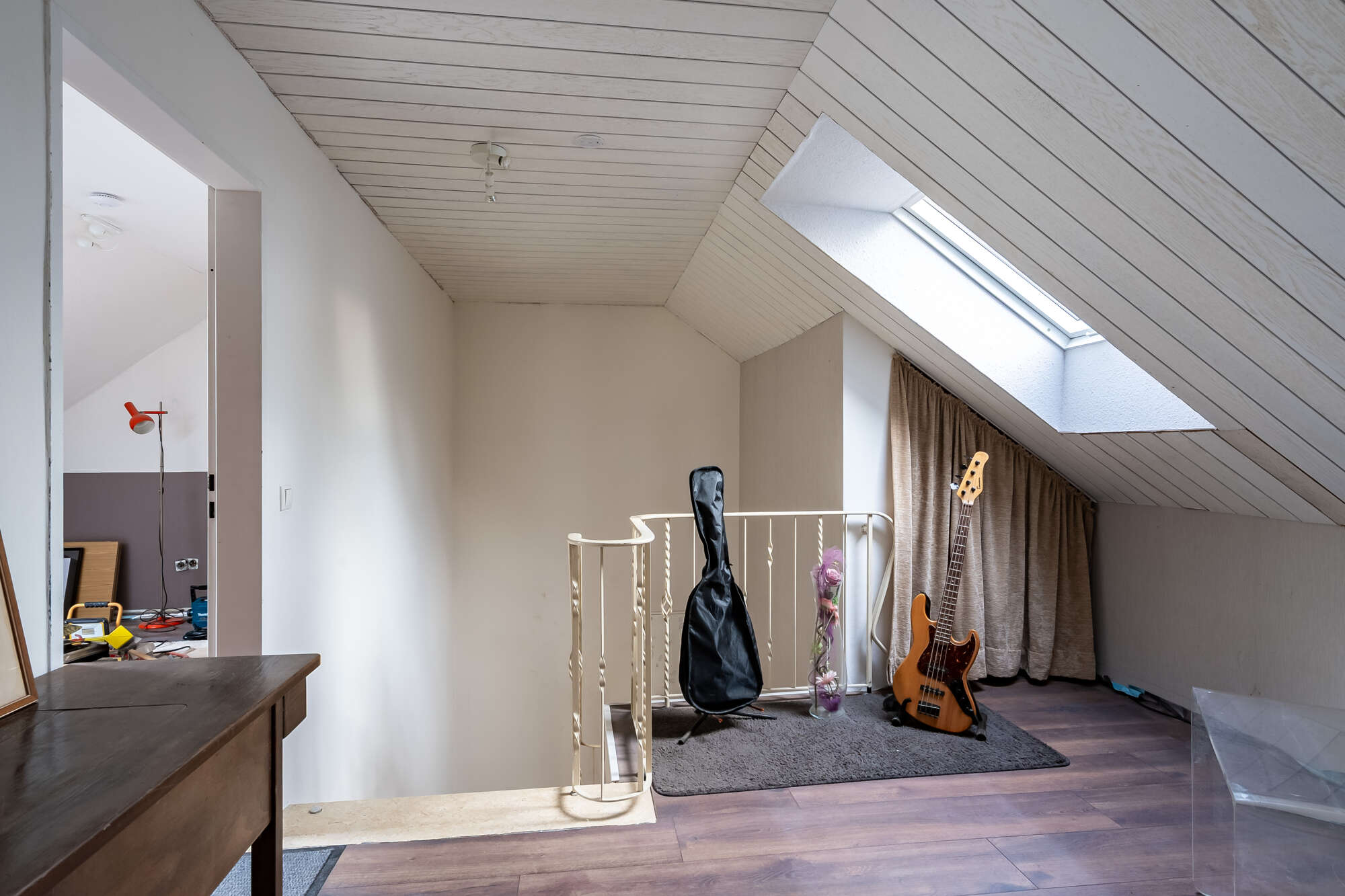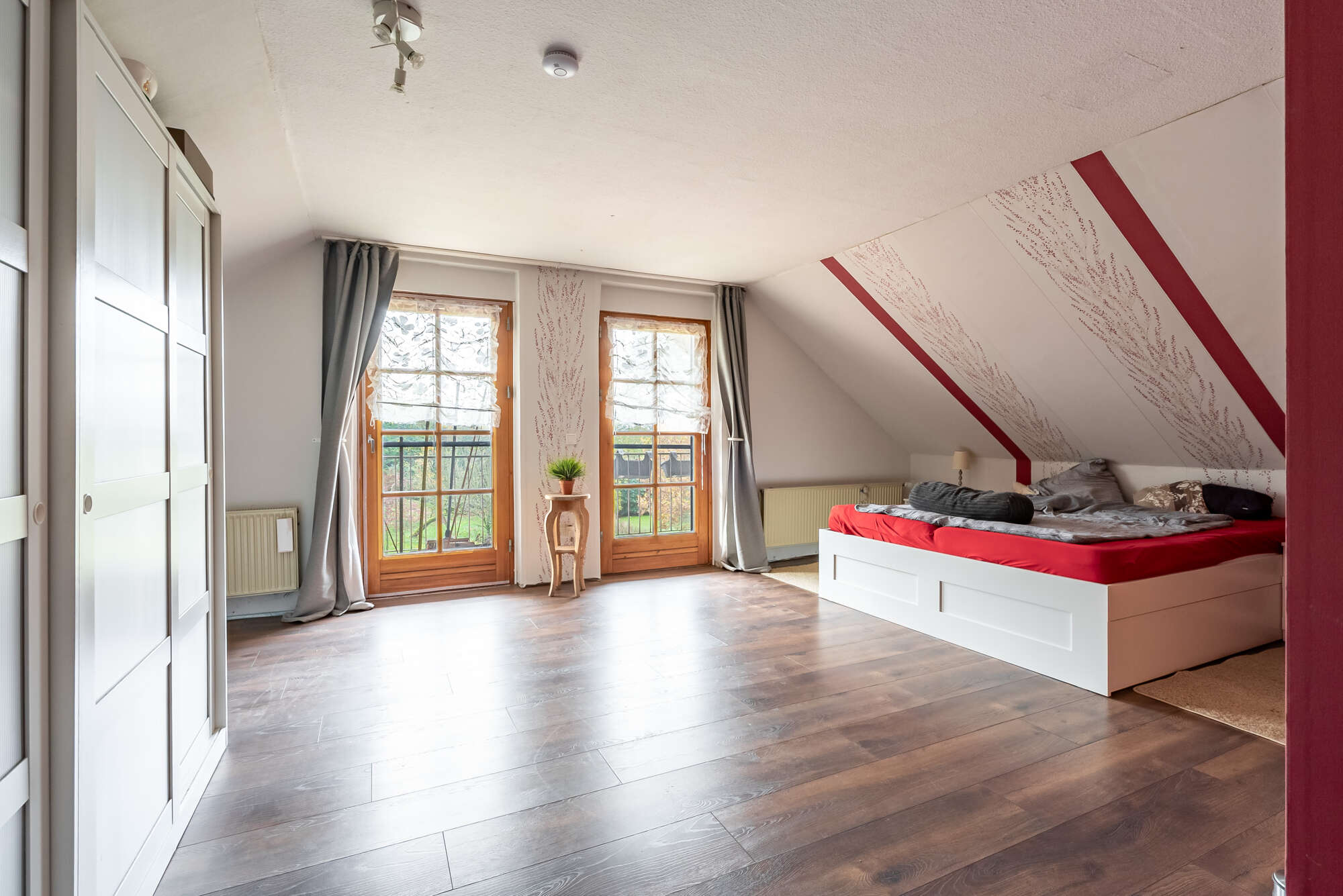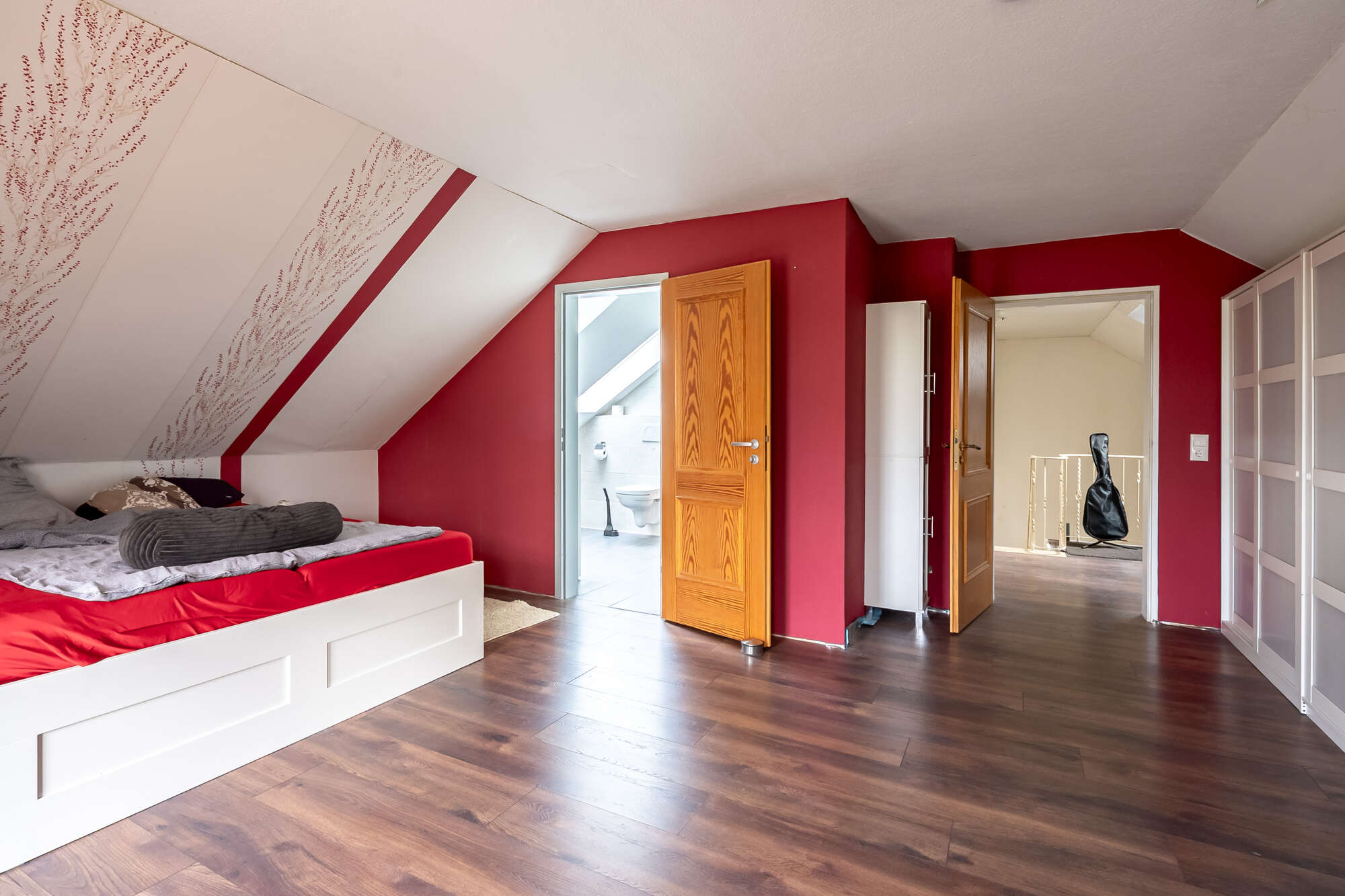 Das Obergeschoss überzeugt mit einem großzügigen Schlafzimmer, welches über ein angrenzendes Badezimmer und direkten Zugang zum Balkon verfügt. Ein weiteres Gästezimmer führt zu einer umfassenden Ausbaureserve, die vielfältiges Potenzial für zusätzlichen Wohnraum bietet.