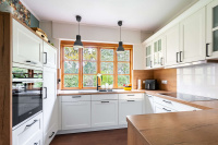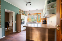 Vom Eingangsbereich wie auch vom Esszimmer gelangt man in die voll ausgestattete Küche. Die moderne Einbauküche aus dem Jahr 2020 bietet reichlich Platz für gemeinsames Kochen. Im Erdgeschoss befinden sich zudem ein gut nutzbares Arbeitszimmer sowie ein voll ausgestattetes Badezimmer mit Dusche und Badewanne. An der Garderobe vorbei gelangt man zum Abstell-und in den Hauswirtschaftsraum, der praktische Stau- und Abstellmöglichkeiten bietet.