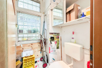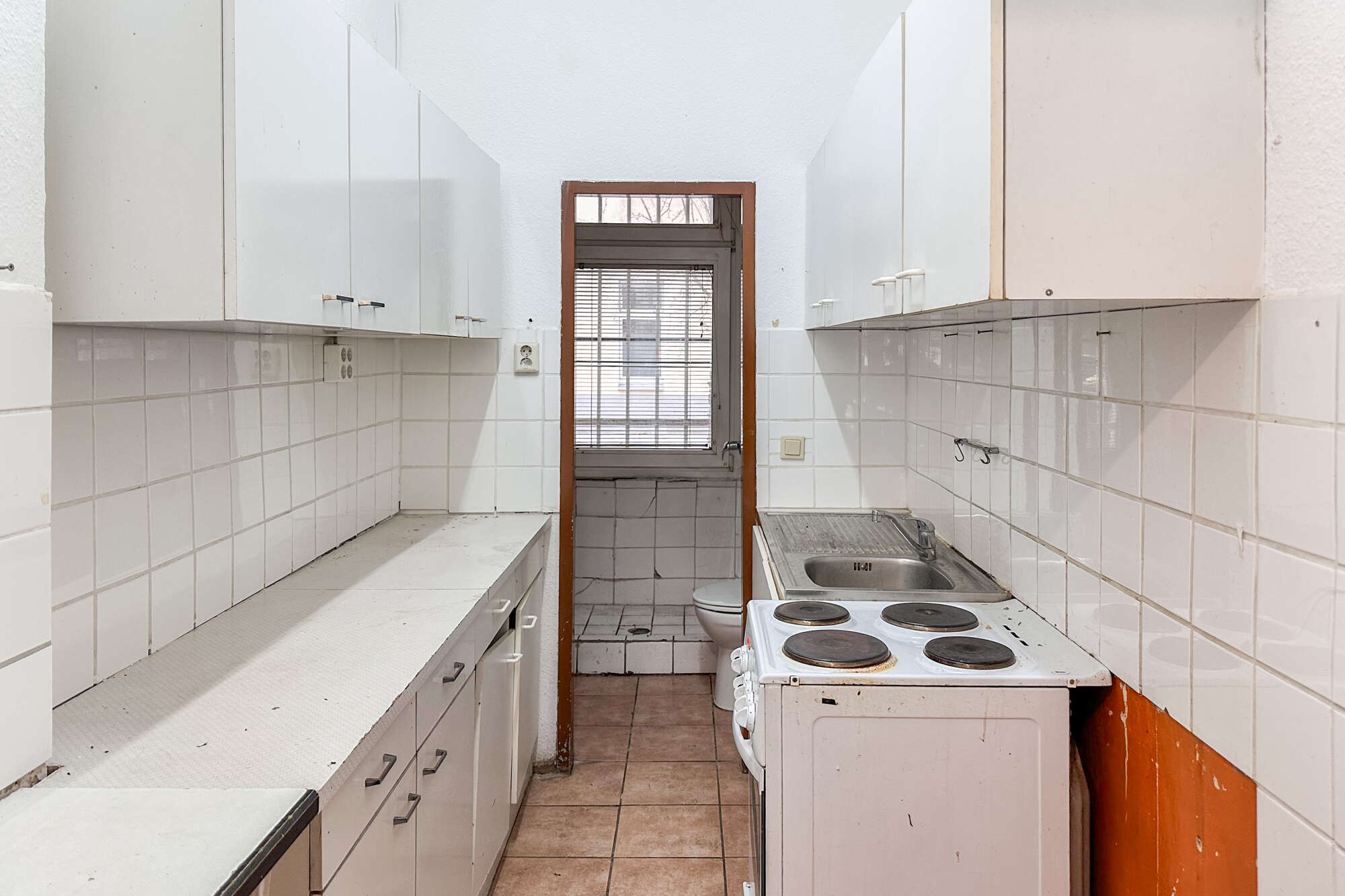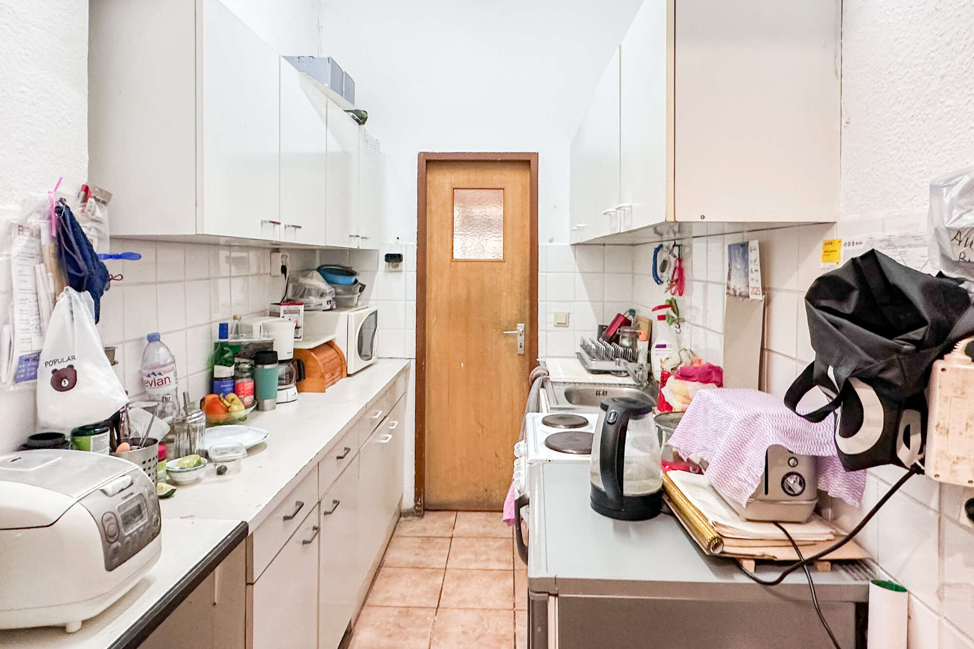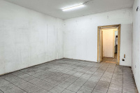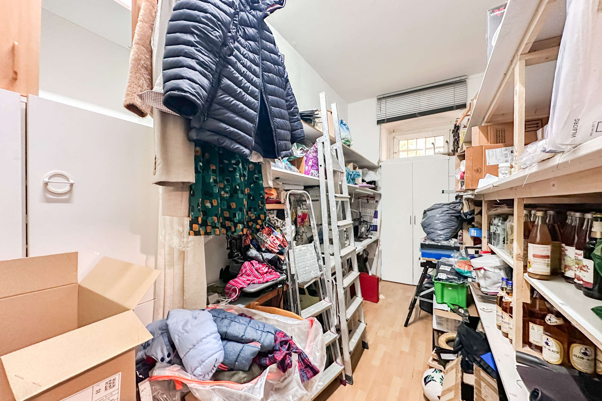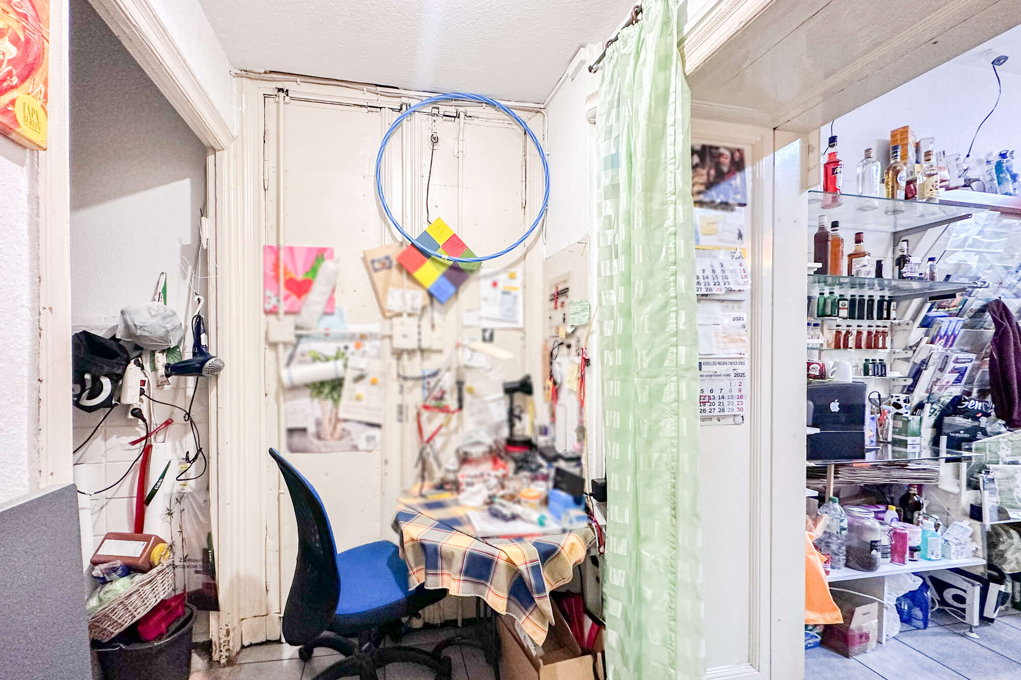 Angrenzend befindet sich eine kompakte Küche mit Einbauküche sowie ein kleines Badezimmer. Die Einheit verfügt zusätzlich über einen zweiten Zugang über das Treppenhaus, was besonders für ruhige Anlieferungen, Personal oder interne Abläufe attraktiv ist. Ein Kellerabteil rundet das Angebot ab und bietet wertvolle Stau- und Lagerfläche.