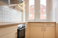 Die Küche bietet ausreichend Platz für eine kompakte Einbauküche. Das kleine Badezimmer ist funktional gestaltet und verfügt über ein Fenster.