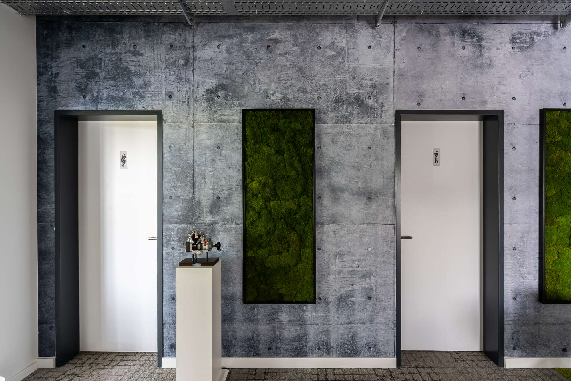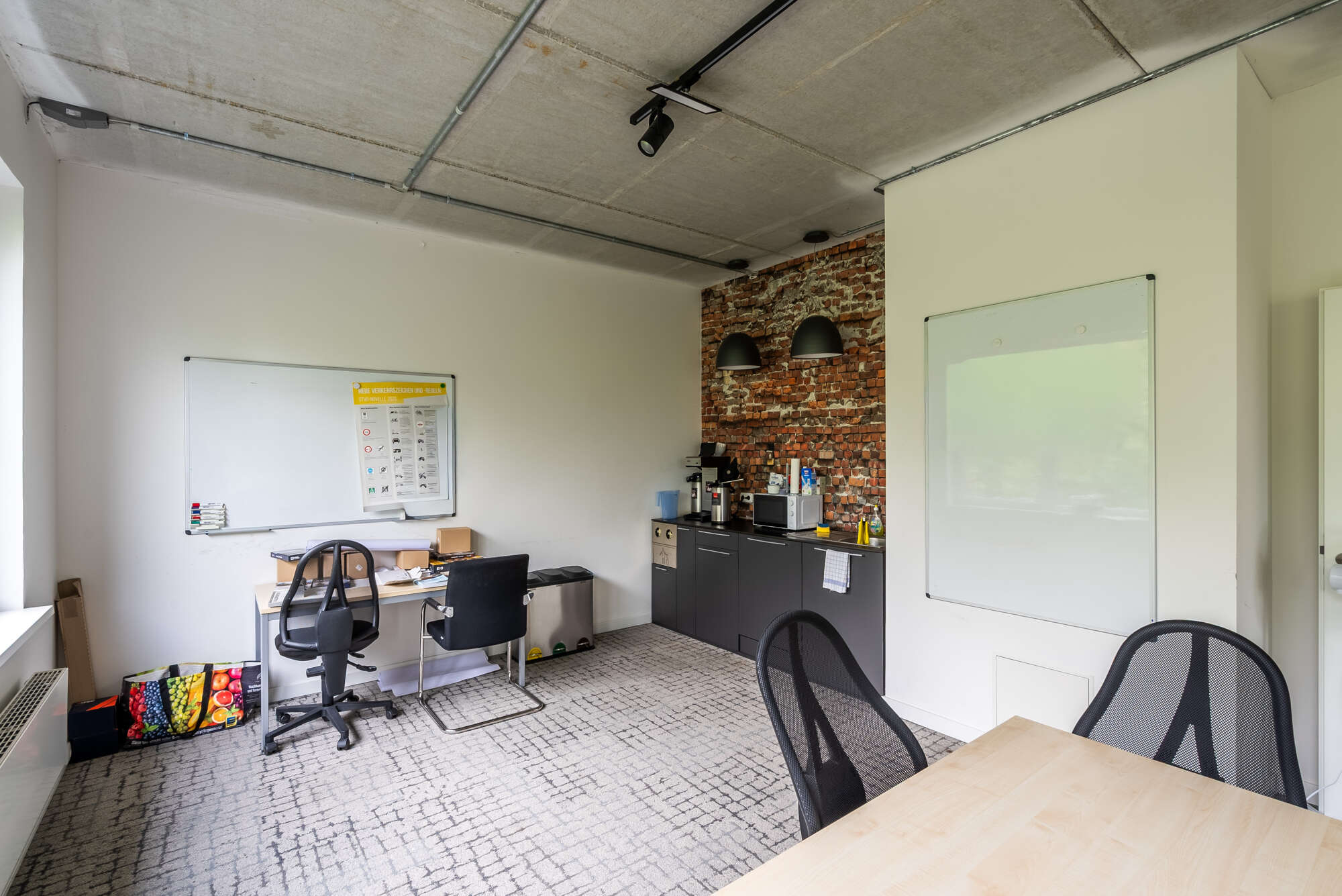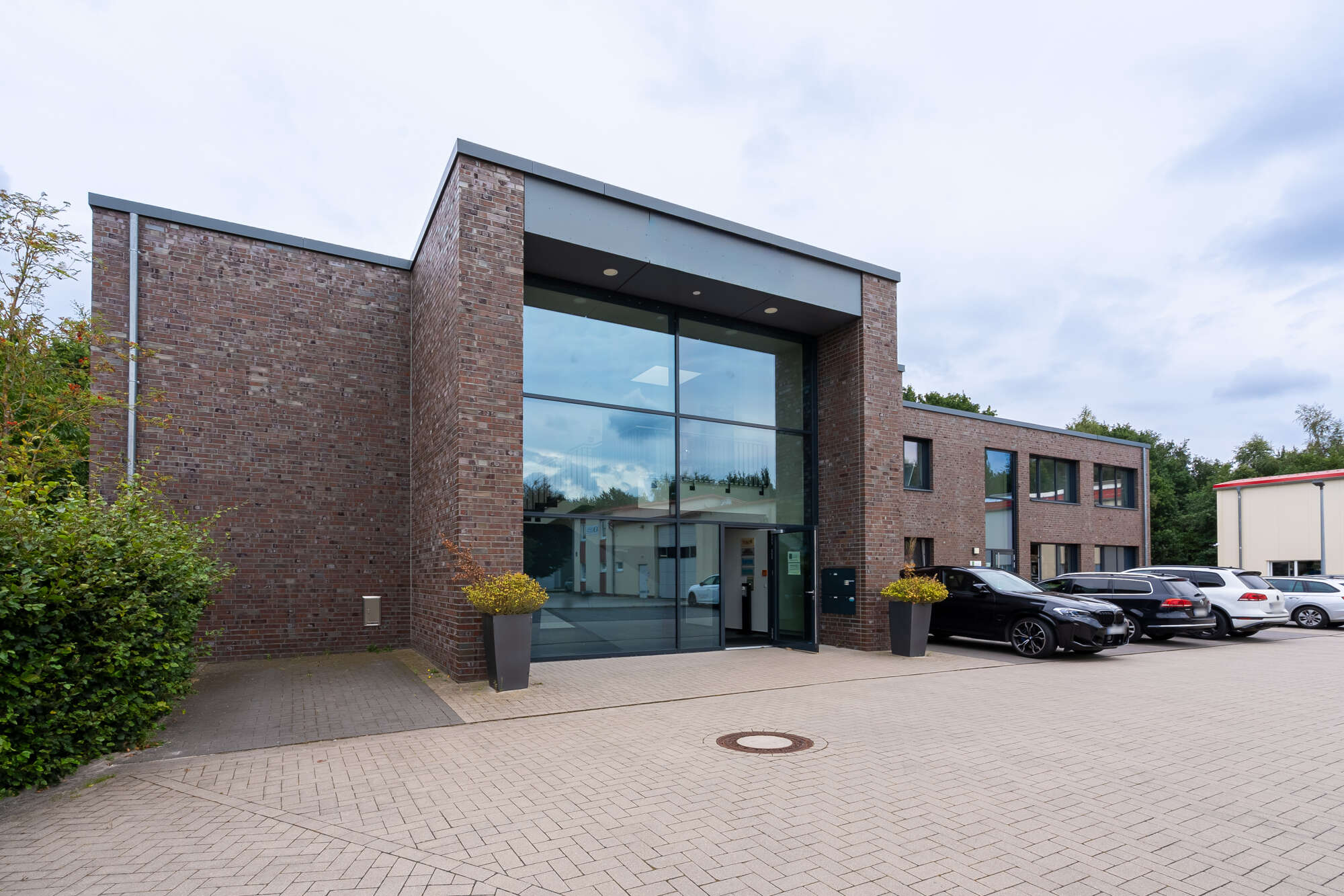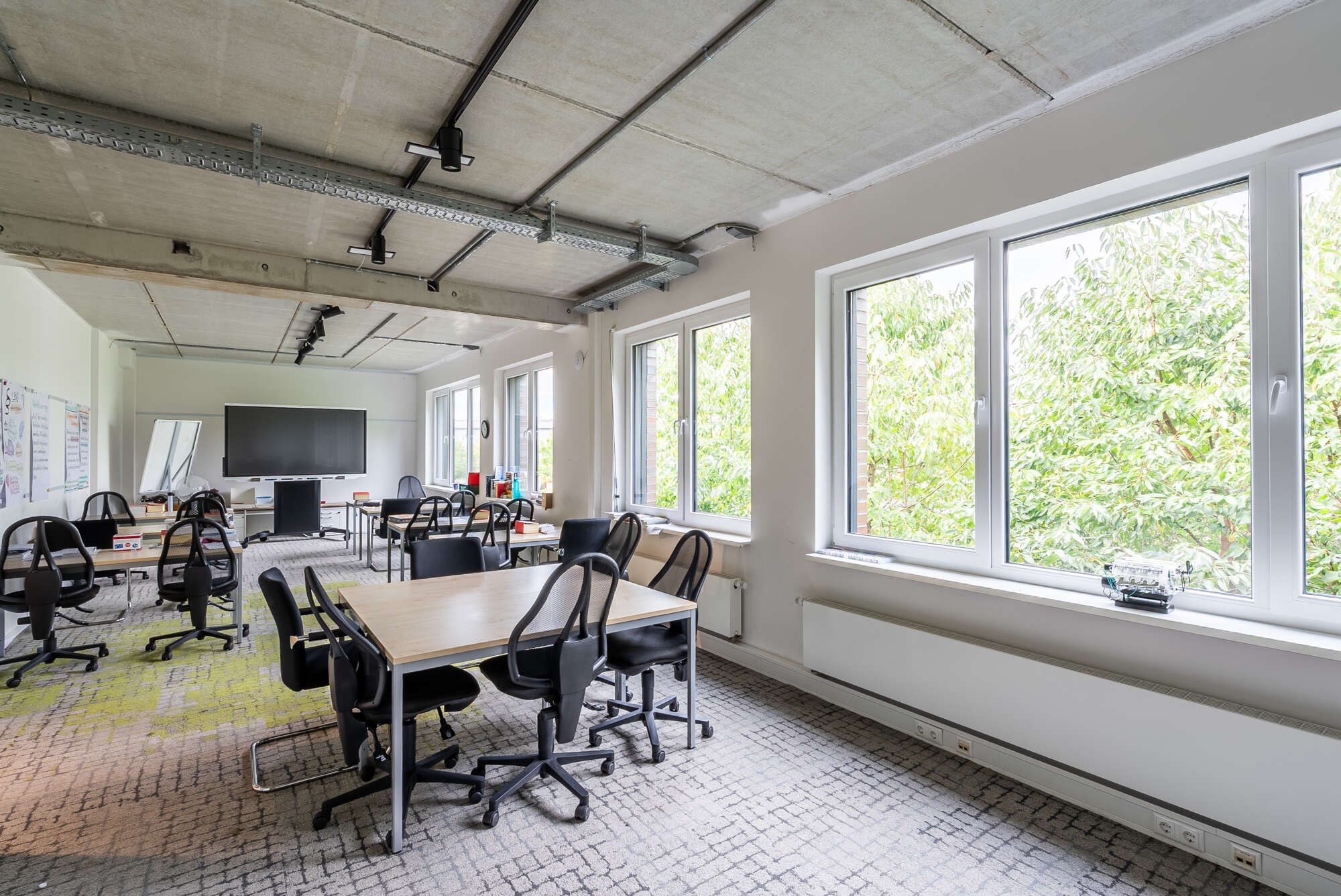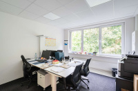 Die Büroräume sind mit Kunststofffenstern und Dreifachverglasung sowie elektrisch bedienbaren Raffstores ausgestattet. Eine Rasterdecke mit integrierter Beleuchtung sorgt für ein angenehmes Arbeitsumfeld.