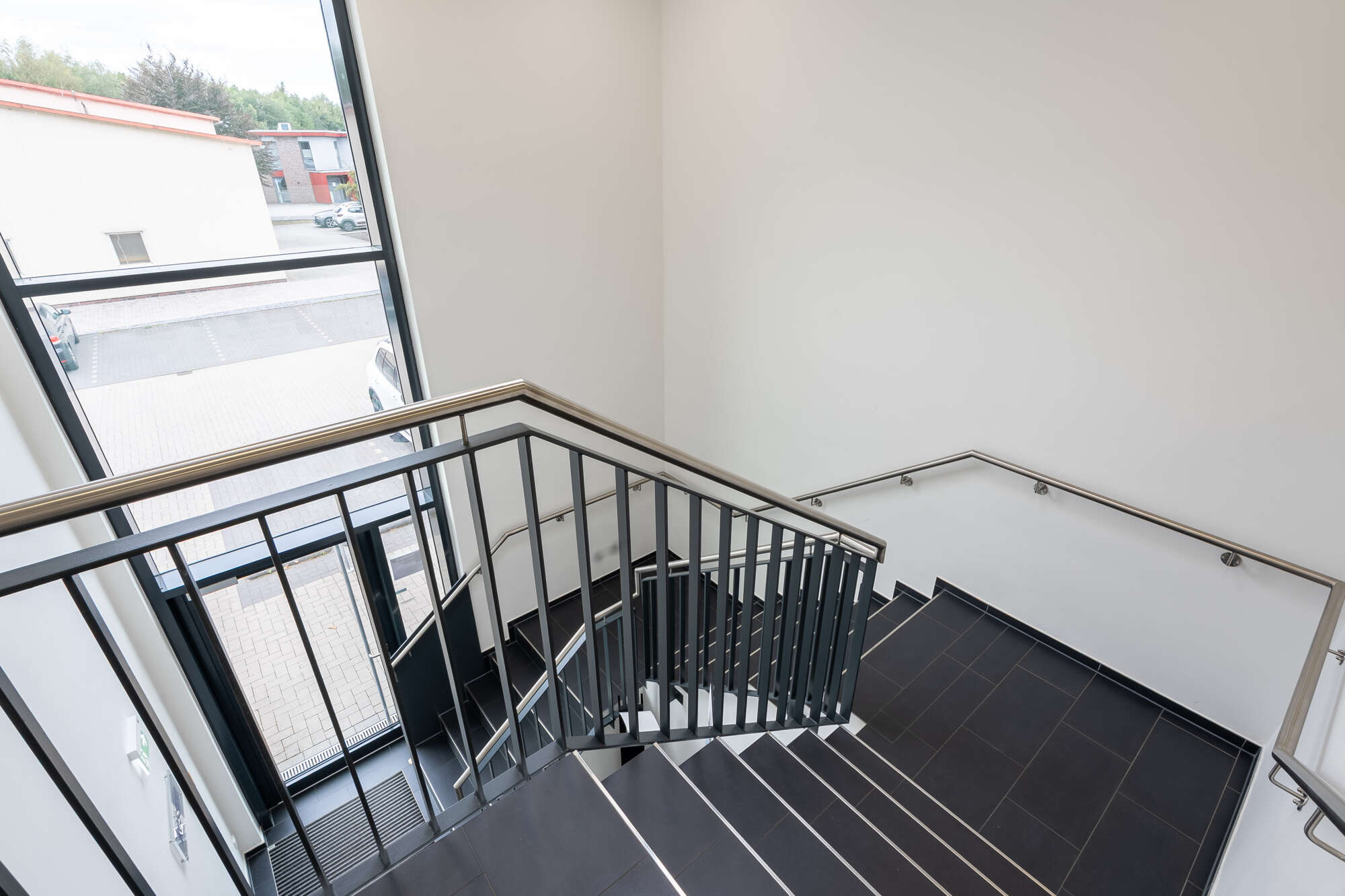 Über ein ansprechend gestaltetes Treppenhaus erhalten Sie Zugang zur ersten Etage des Bürogebäudes. Auf einer 150 m² großen Fläche bietet diese Einheit ein offenes Raumkonzept mit individuellen Gestaltungsmöglichkeiten.