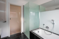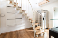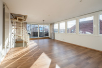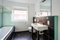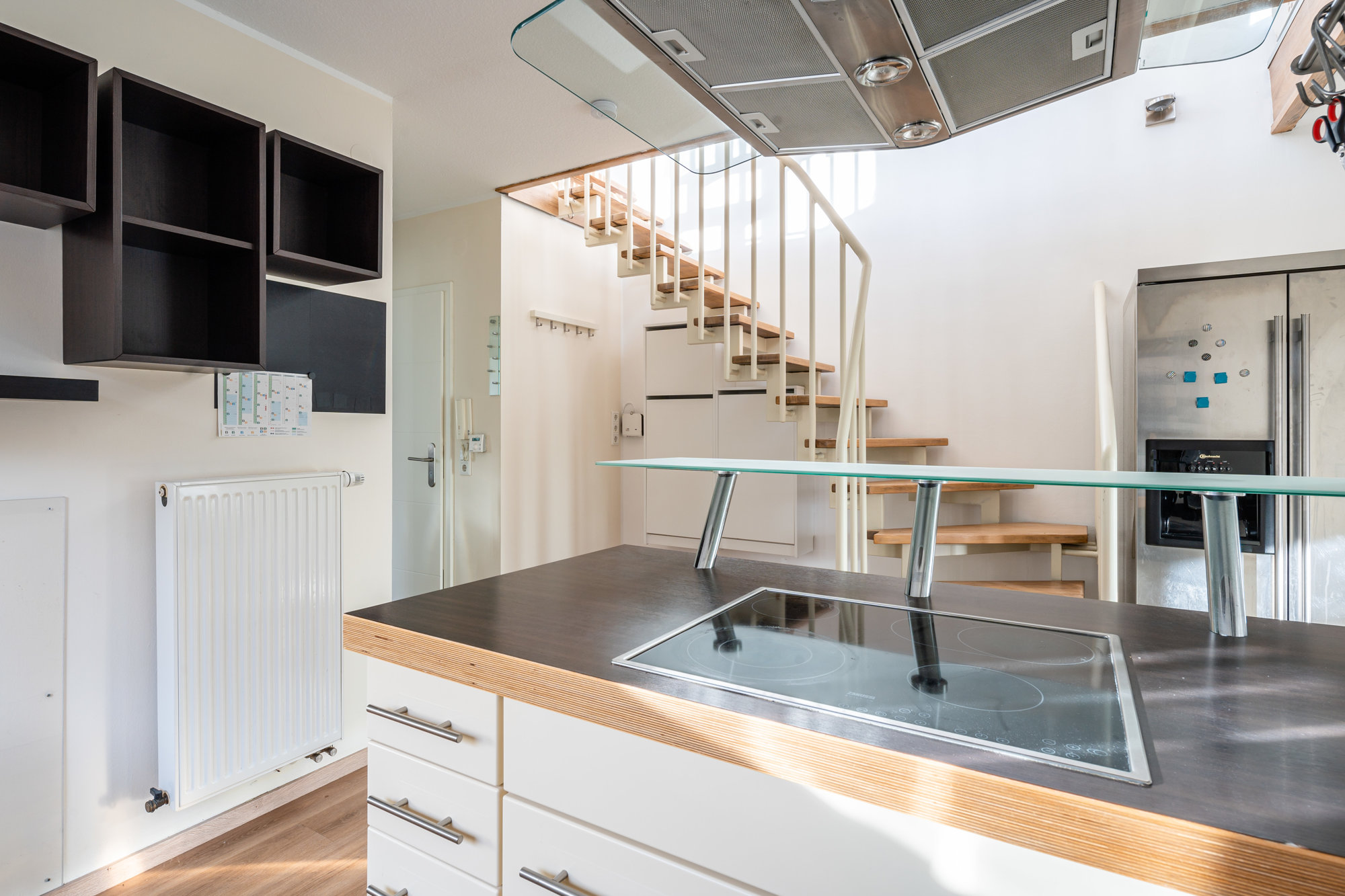 Auf der Hauptwohnebene befinden sich die moderne Einbauküche, zwei gut geschnittene Zimmer, sowie das geschmackvolle Badezimmer, ausgestattet mit Dusche, Badewanne, WC und Waschtisch. Eine stilvolle Holztreppe führt Sie in die darüberliegende Etage.