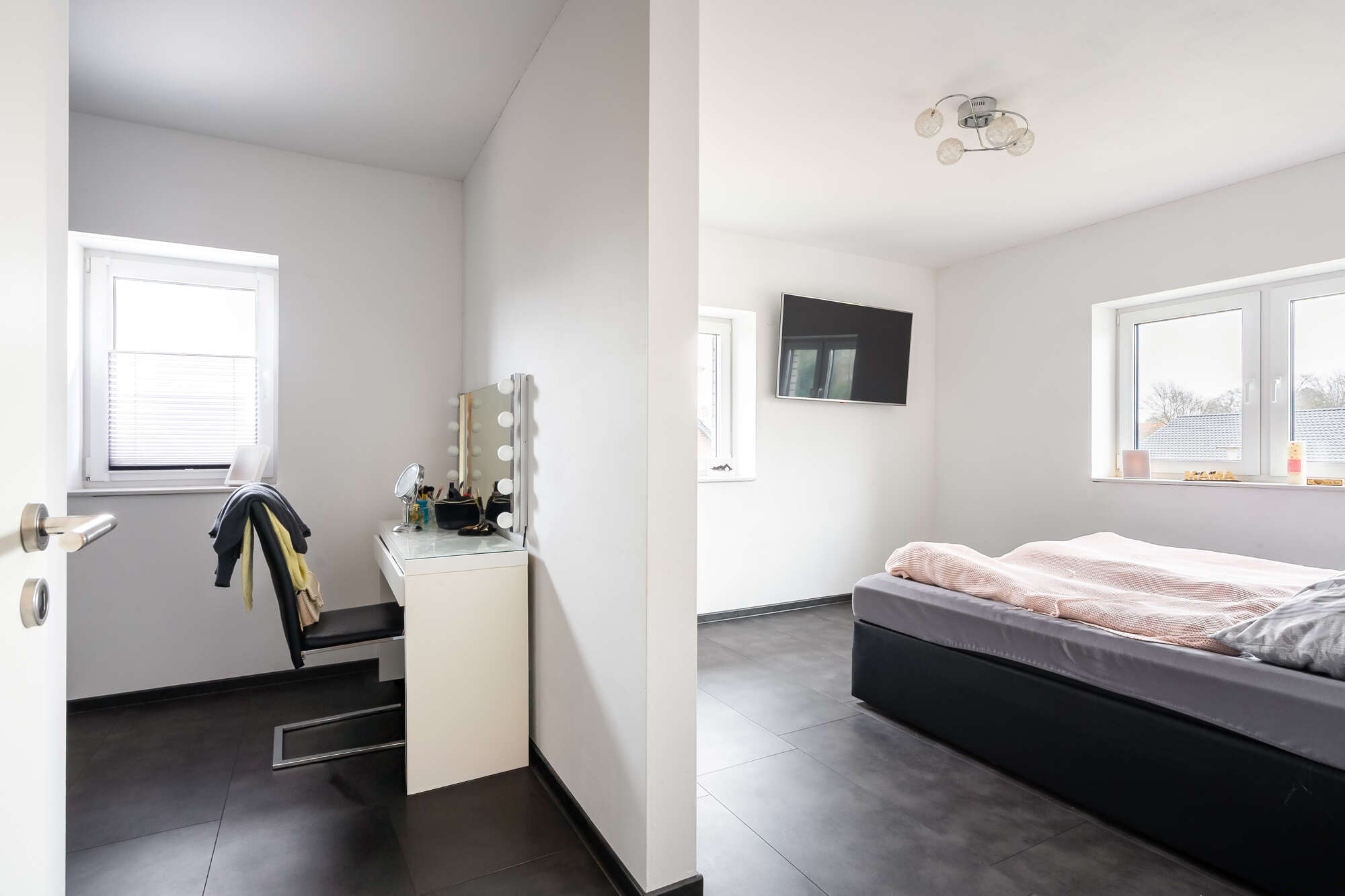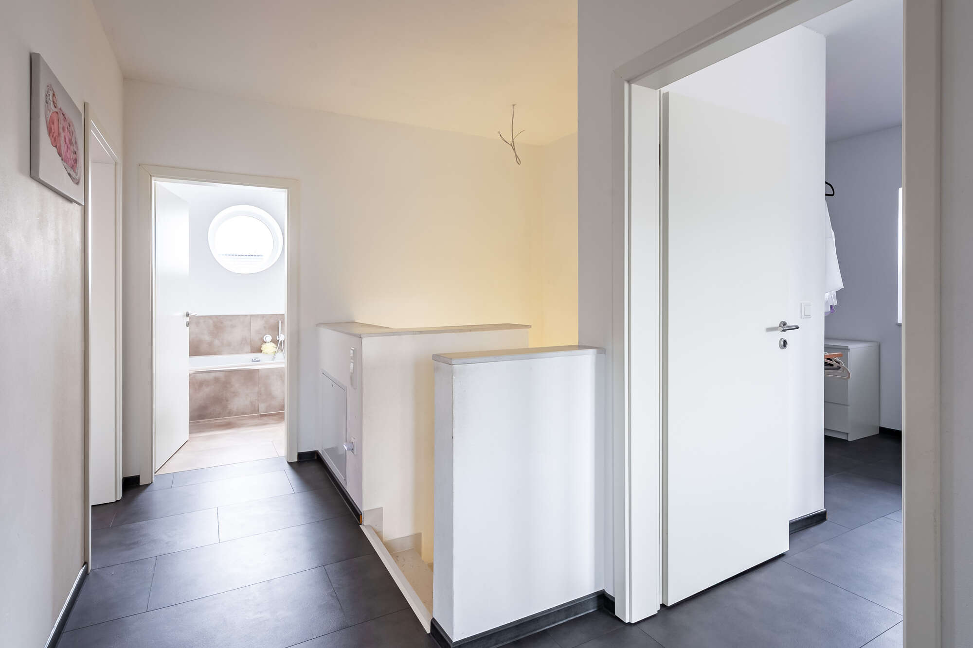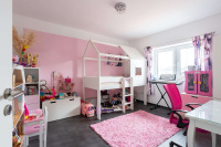 Das Obergeschoss bietet einen durchdachten Rückzugsbereich für die Familie. Hier befinden sich das Hauptschlafzimmer mit angrenzender Ankleide, zwei Kinderzimmer sowie ein weiteres Zimmer, das flexibel als Büro, Hobby- oder Gästezimmer genutzt werden kann. Zusätzliche Staufläche steht auf dem Dachboden zur Verfügung.
