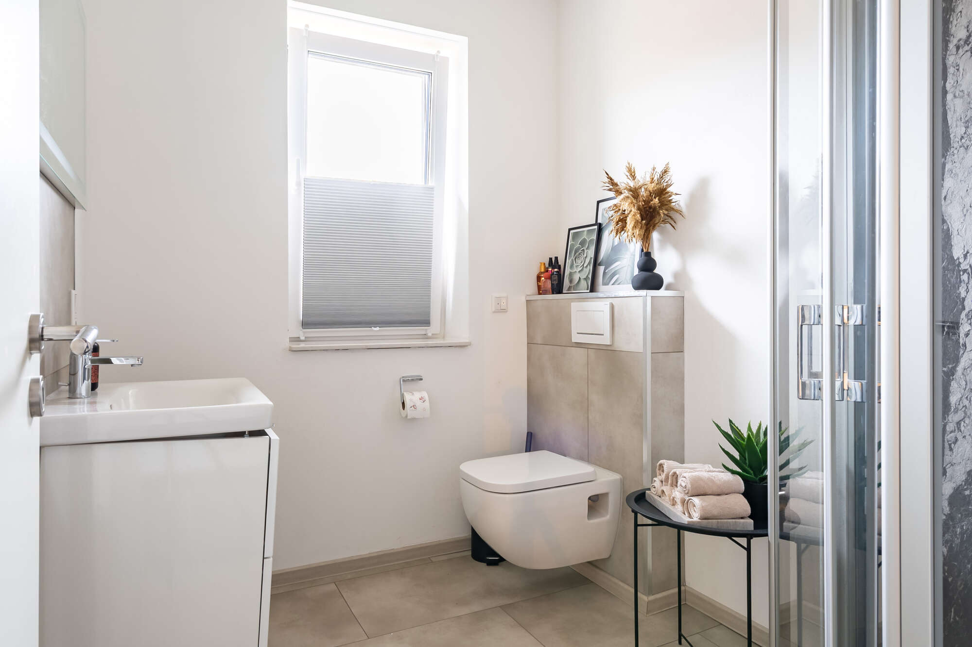 Ergänzt wird das Erdgeschoss durch ein Gästezimmer, ein Badezimmer mit Dusche sowie einen großzügigen Hauswirtschaftsraum mit direktem Zugang zur Doppelgarage.