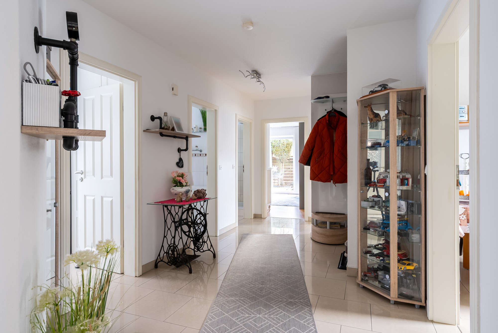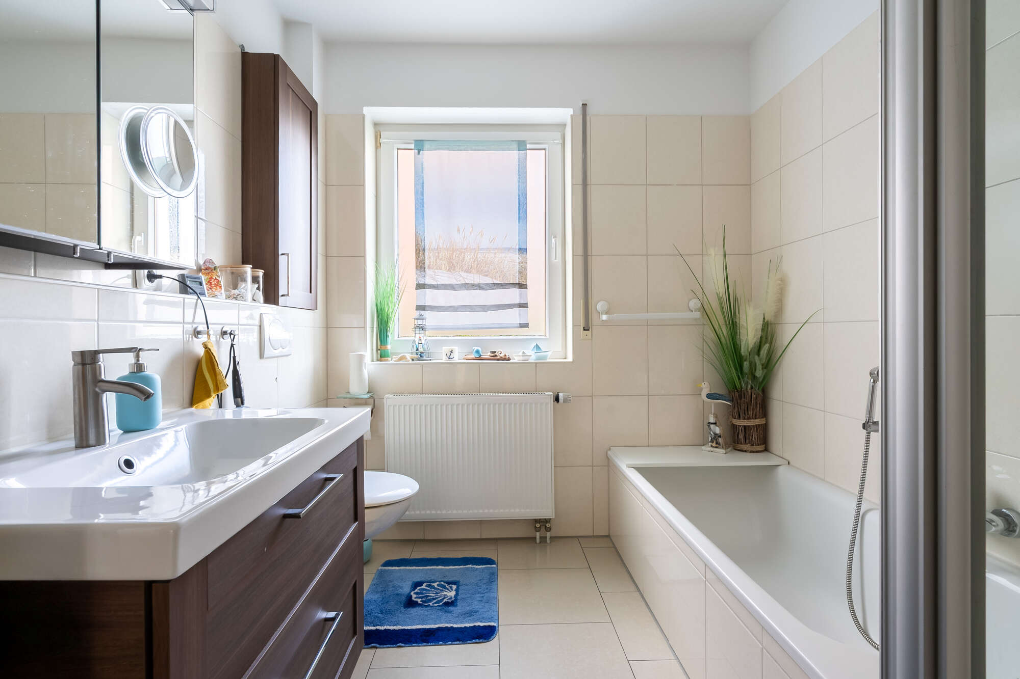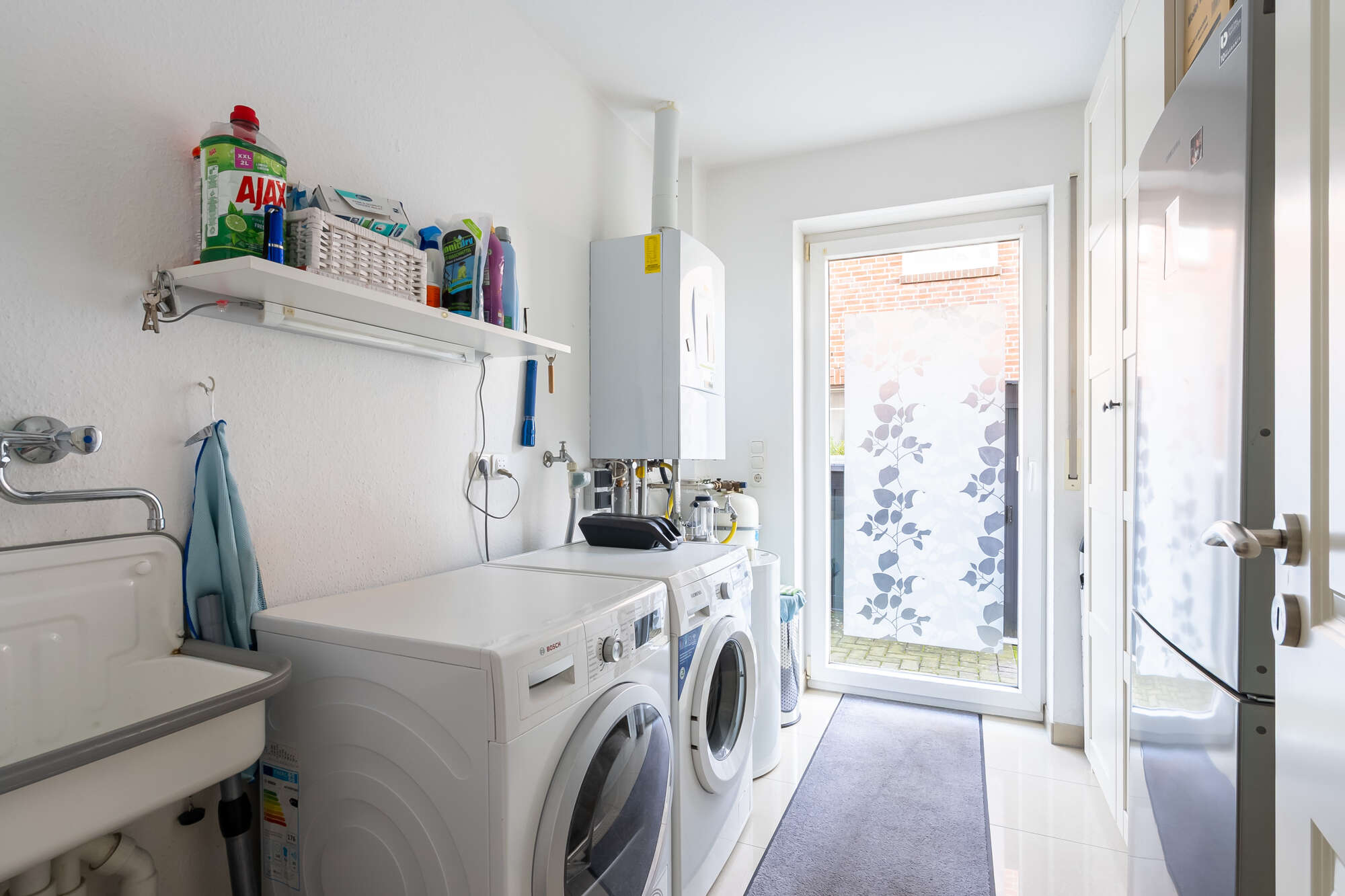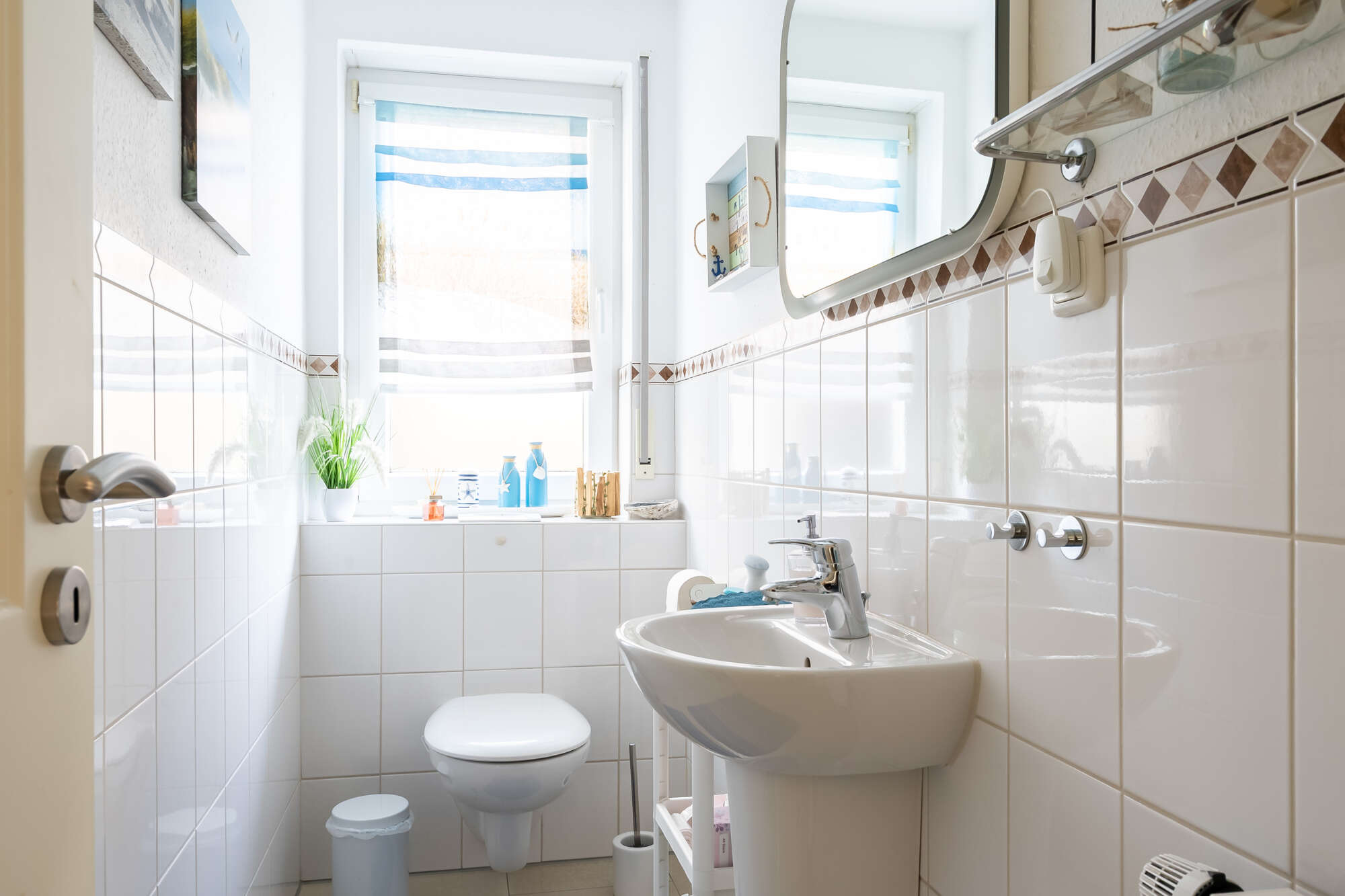 Auf der linken Seite des Flurs befinden sich der Hauswirtschaftsraum mit Waschmaschinenanschluss und ein separates Gäste-WC, sowie das Badezimmer. Dieses ist funktional und komfortabel ausgestattet und verfügt sowohl über eine Badewanne als auch über eine Dusche.