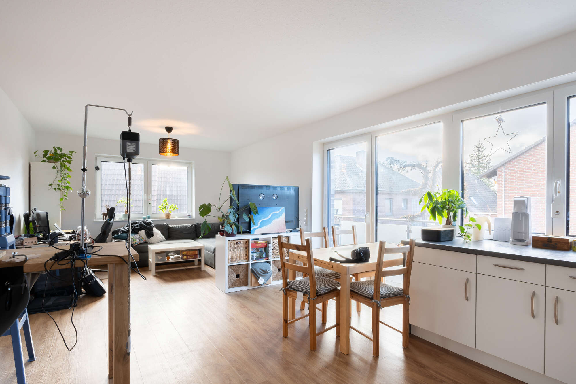 Großzügige Fensterfronten sorgen den ganzen Tag über für eine helle und freundliche Atmosphäre und ermöglichen den direkten Zugang zum Balkon, der zum Entspannen einlädt.