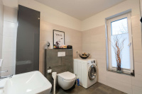 • Badezimmer: Modern gestaltet mit ebenerdiger Dusche, Fenster und hochwertigen Armaturen - hell und freundlich.