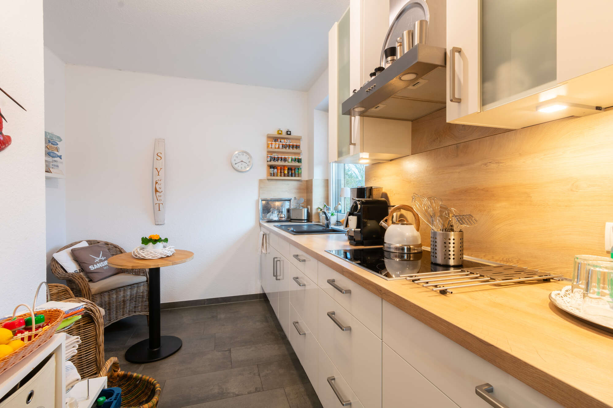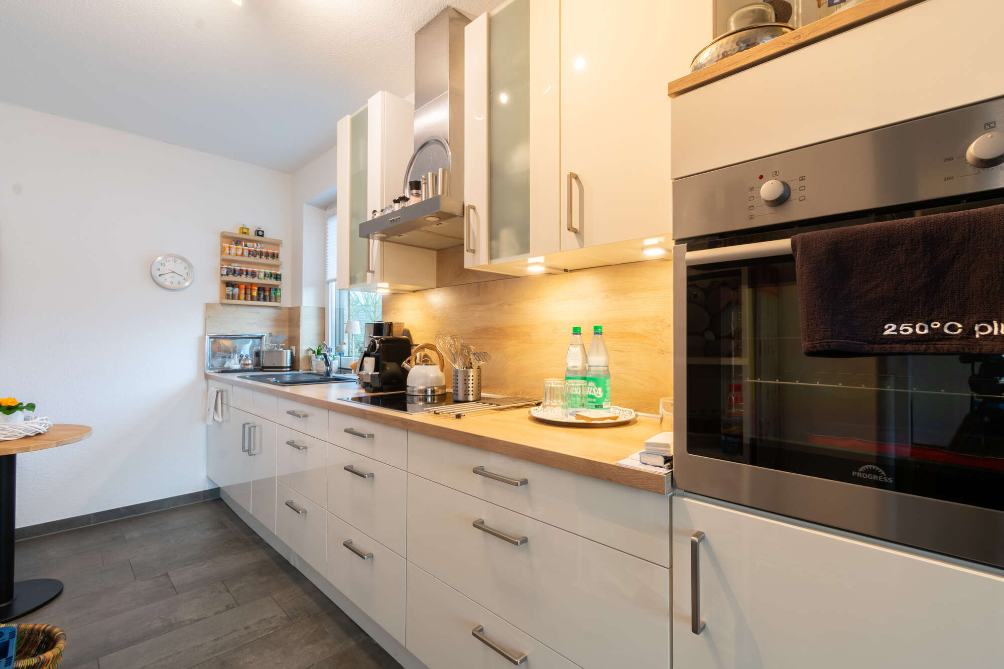 • Einbauküche: Im Mietpreis enthalten, komplett ausgestattet mit Kühl-/Gefrierkombination, Induktionsherd, Spülmaschine und weiteren Elektrogeräte.