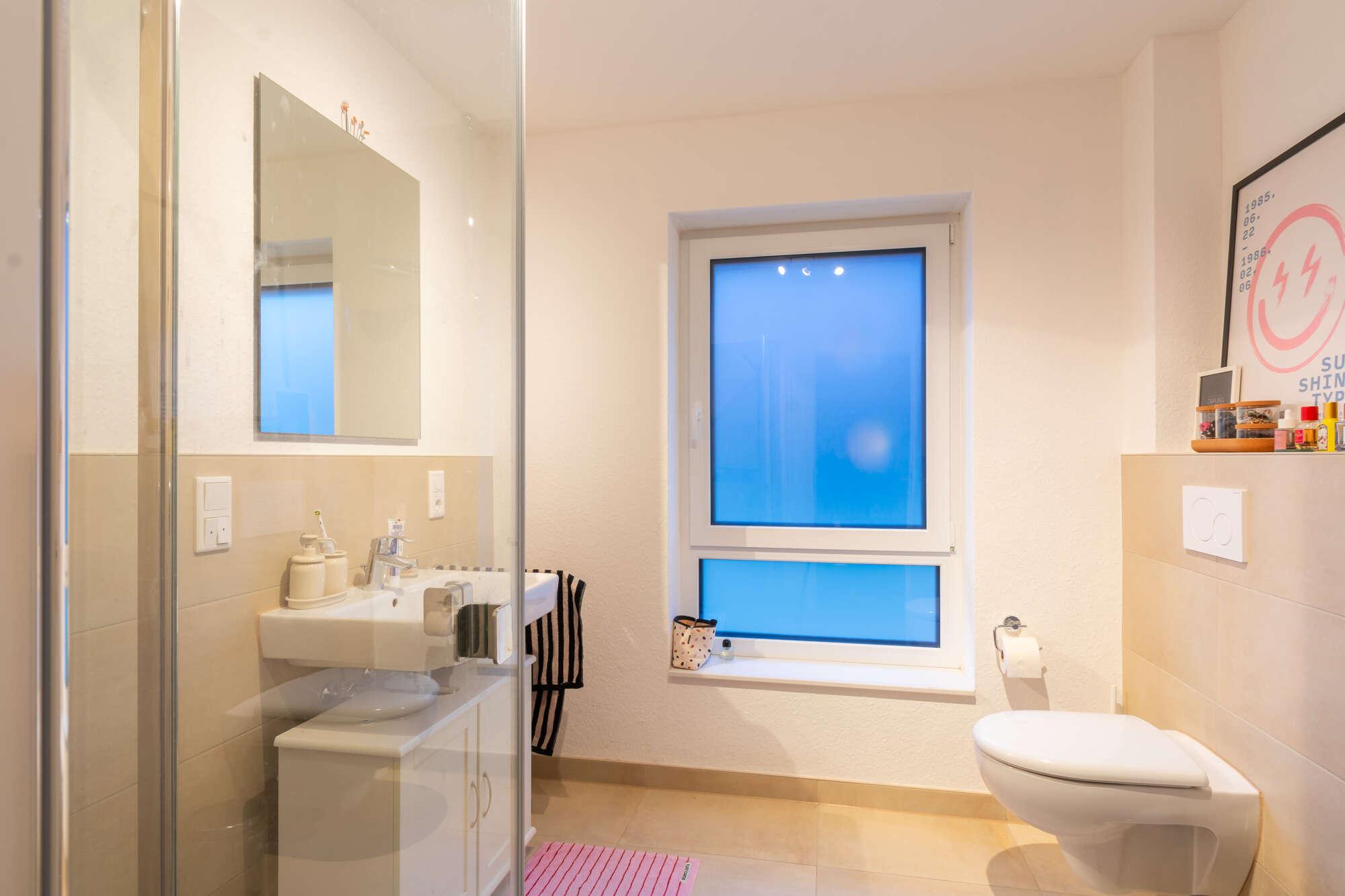 Das Badezimmer ist funktional geschnitten und verfügt über ein Fenster, das für Tageslicht und eine natürliche Belüftung sorgt.