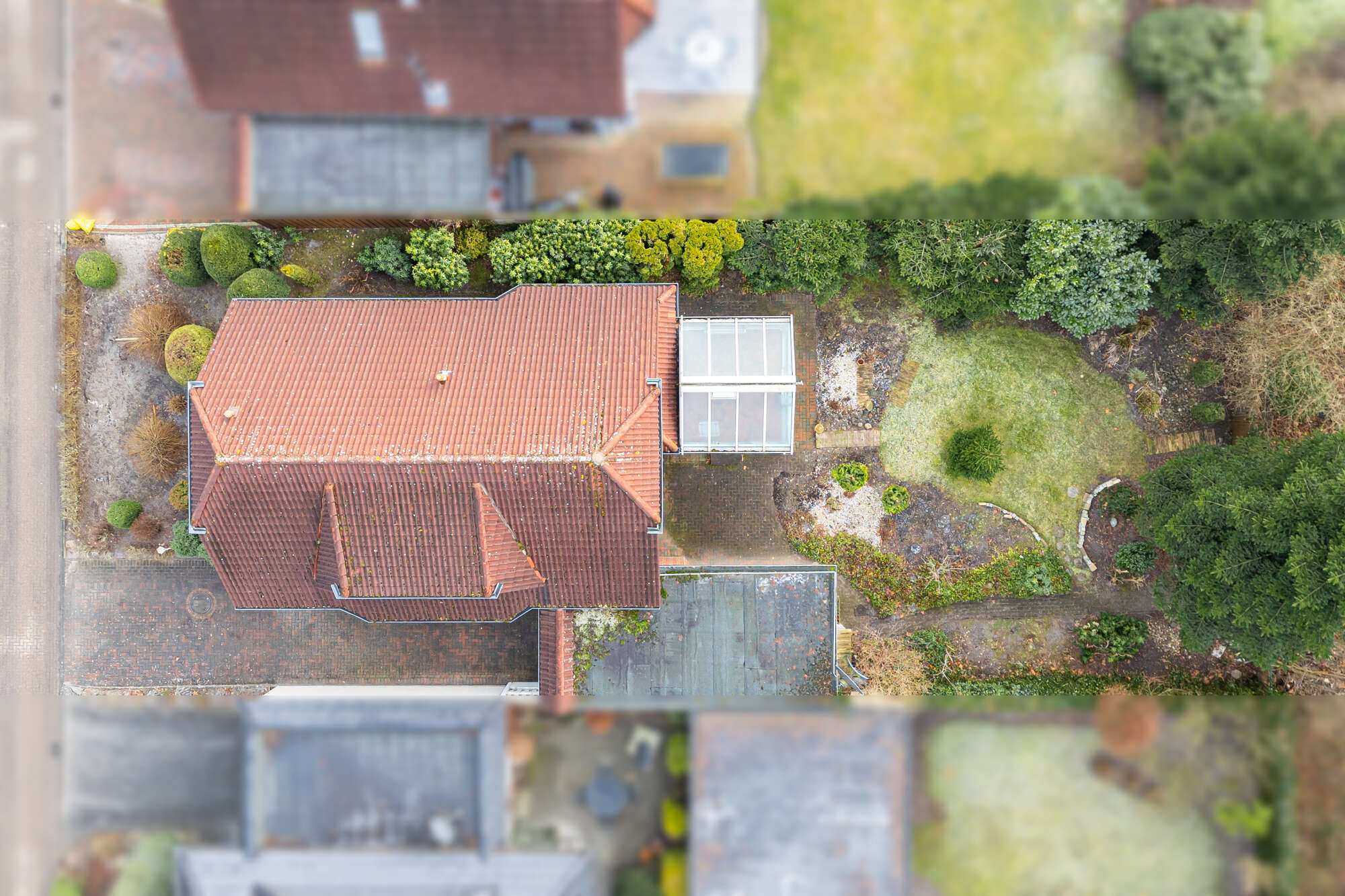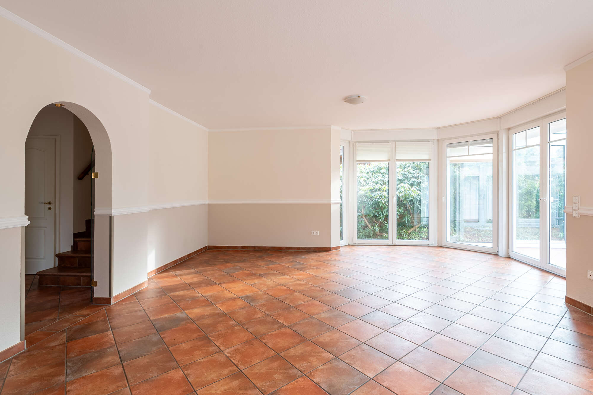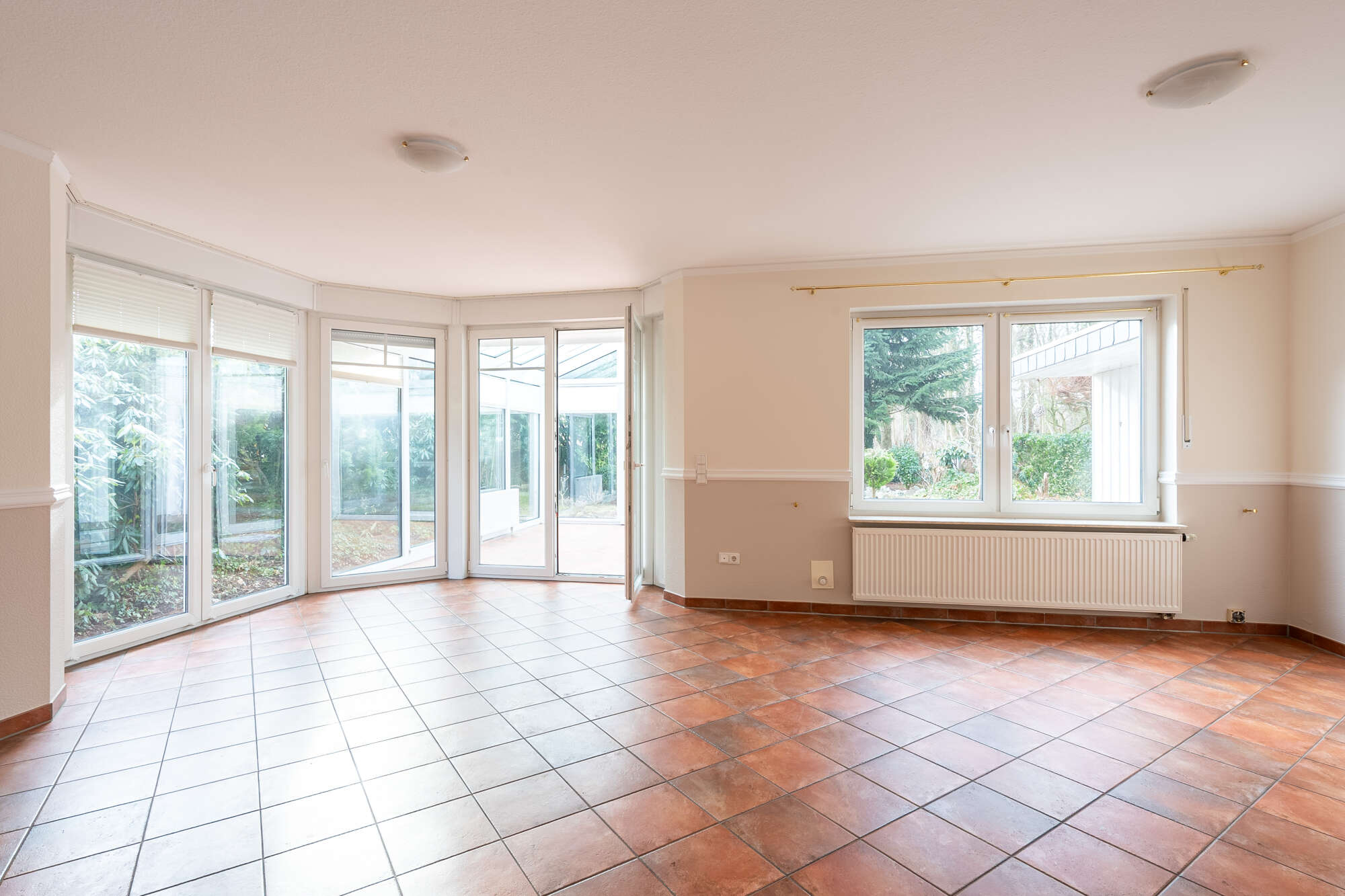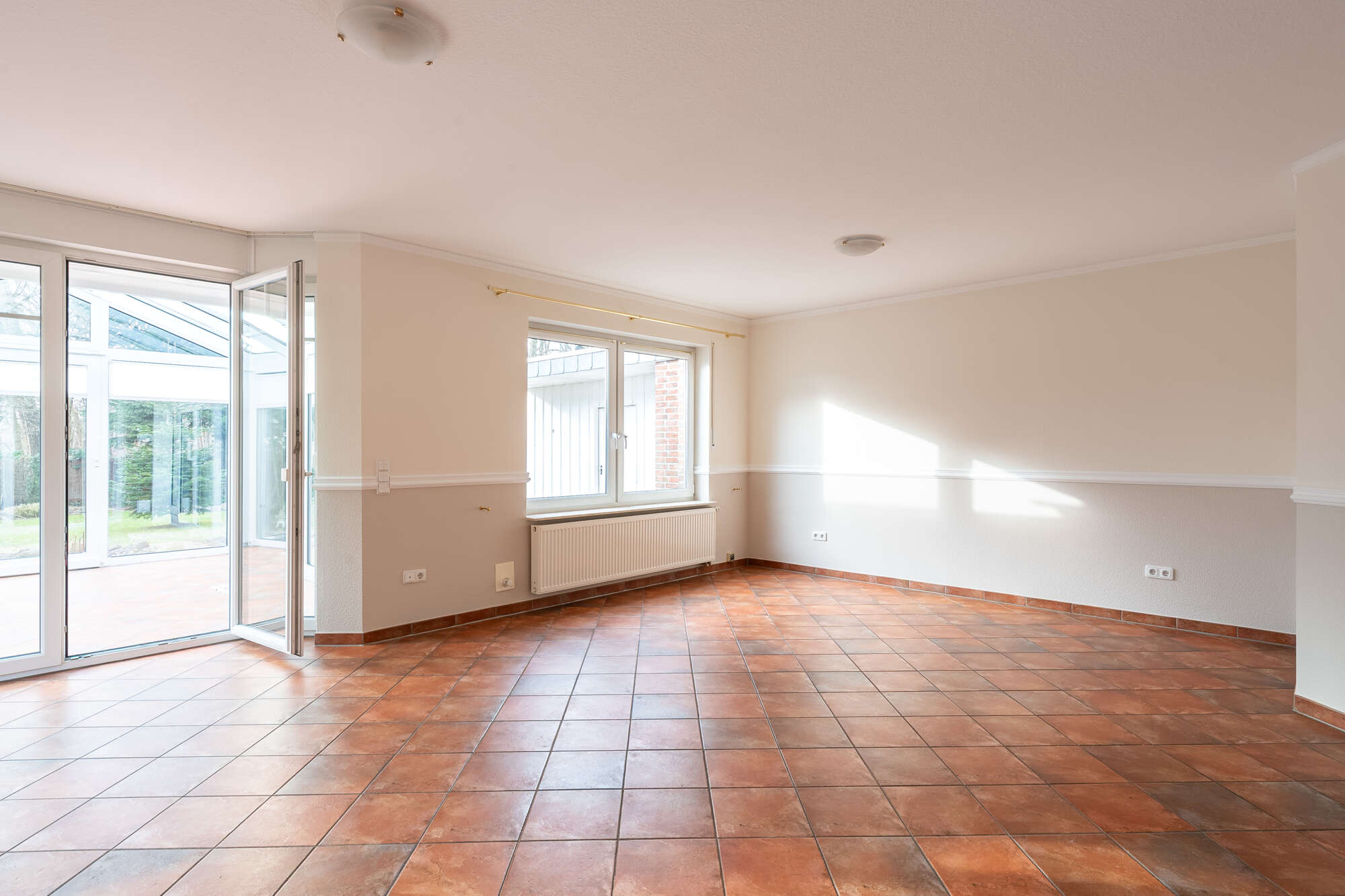 Das großzügige Wohnzimmer bildet das Herzstück des Hauses und bietet direkten Zugang zum beheizten Wintergarten, der ganzjährig genutzt werden kann und einen schönen Übergang in den Garten schafft.