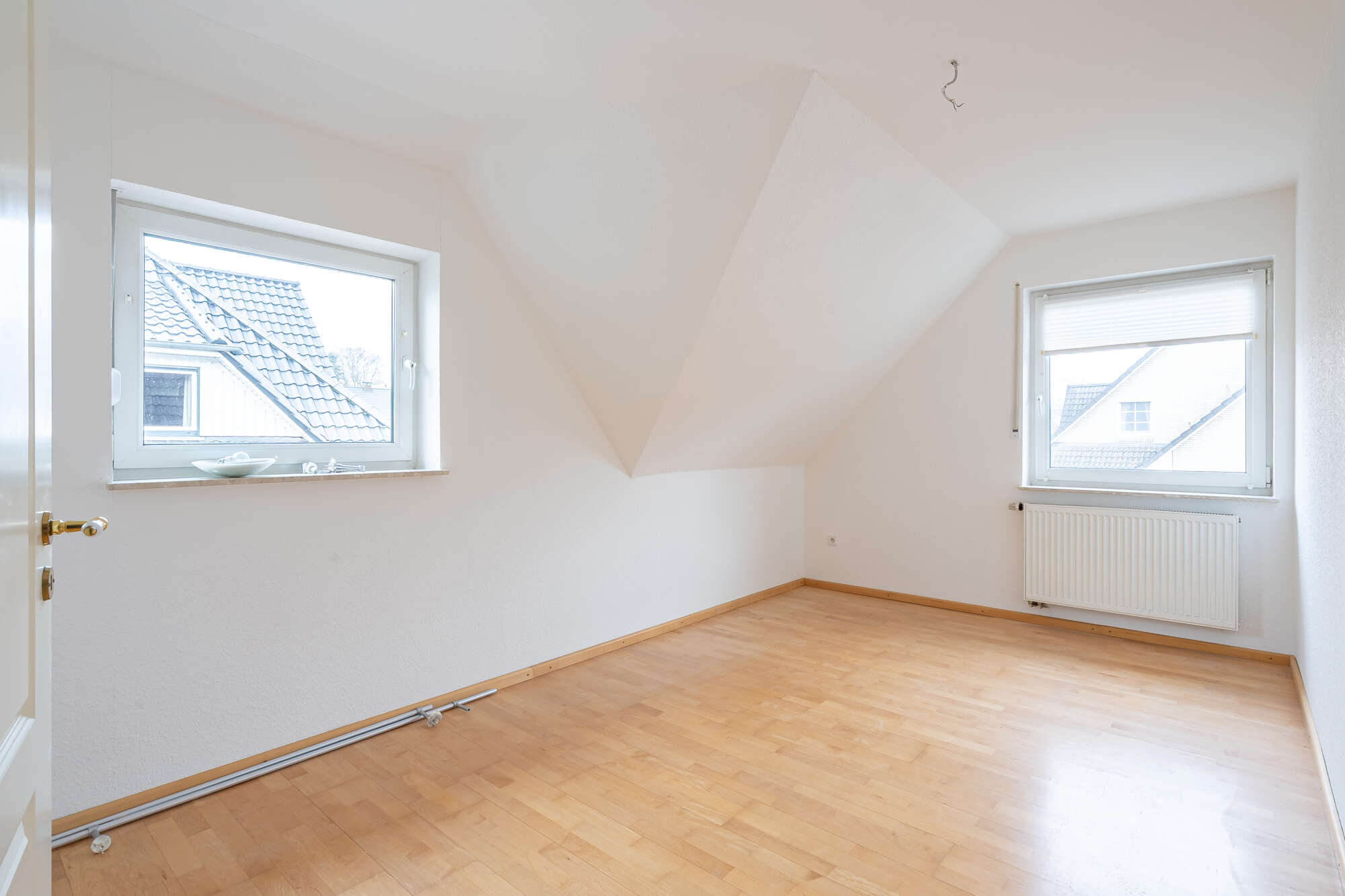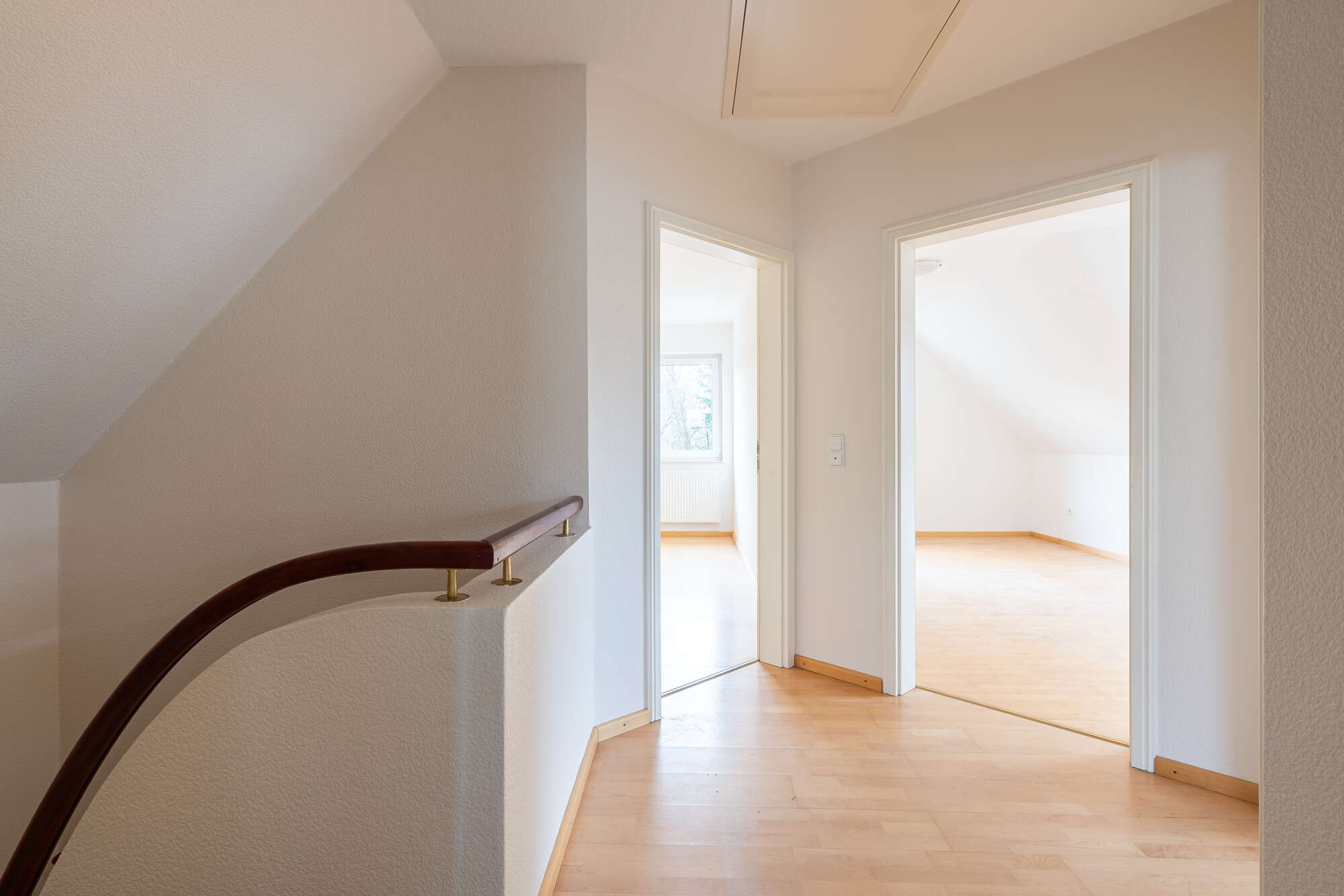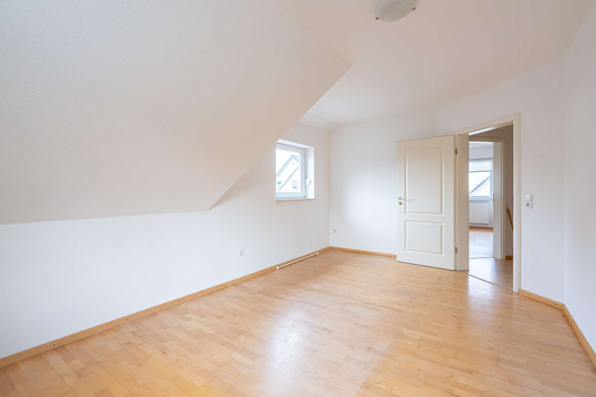 Im Dachgeschoss gelangen Sie ebenfalls über einen Flur in alle Räume. Hier stehen ein Schlafzimmer, zwei weitere individuell nutzbare Zimmer – ideal als Kinder-, Gäste- oder Arbeitszimmer – sowie ein Badezimmer mit Badewanne und Dusche zur Verfügung.