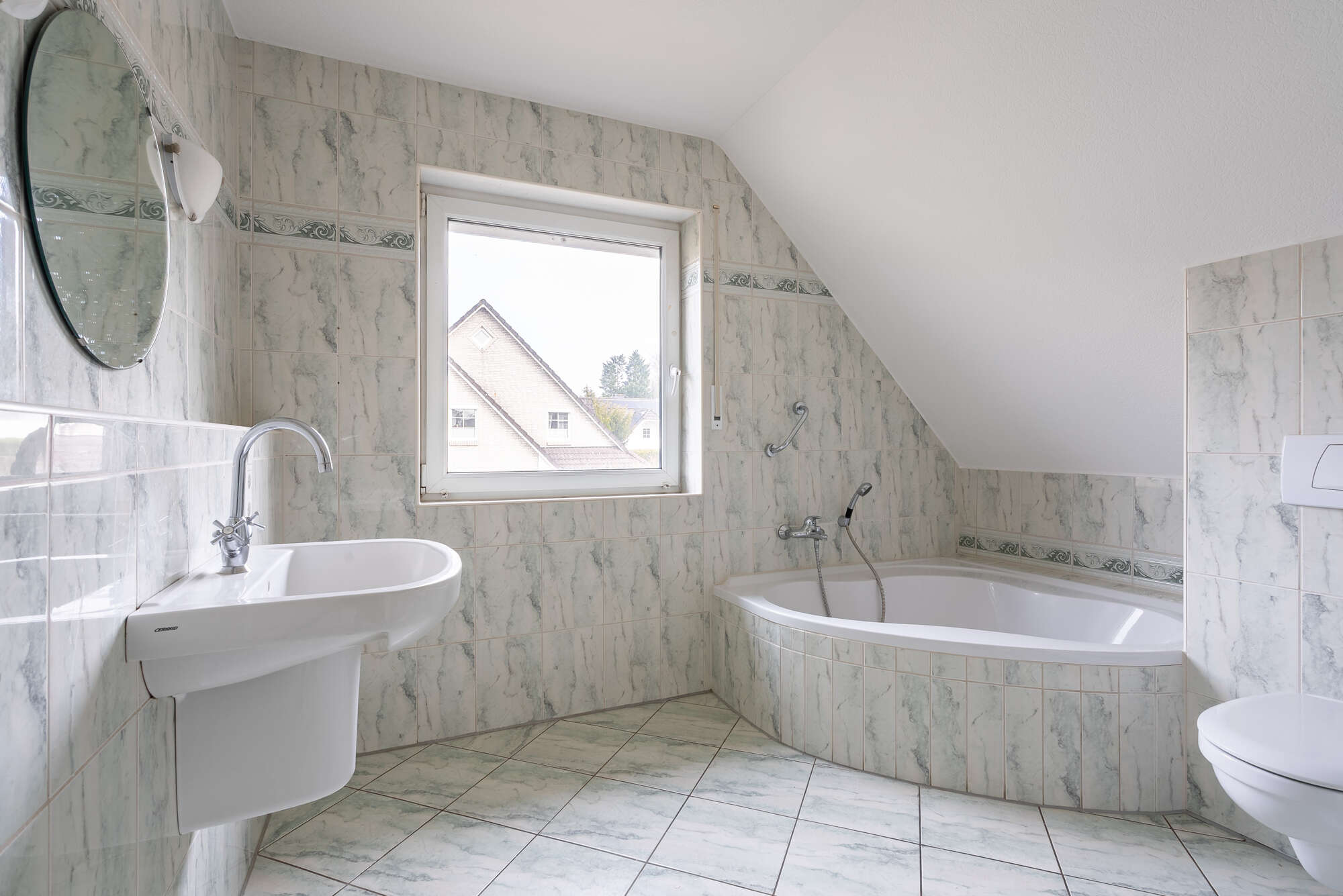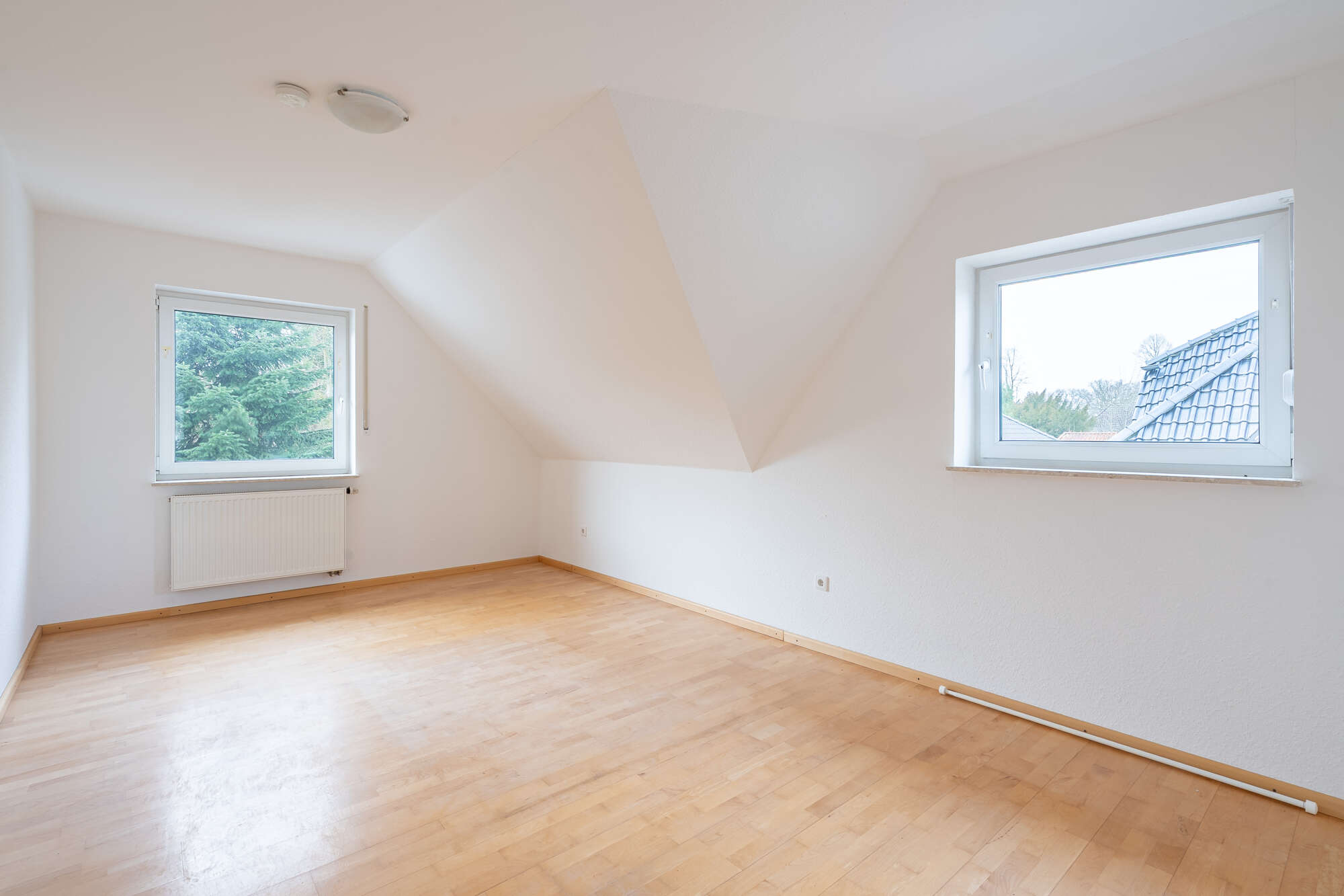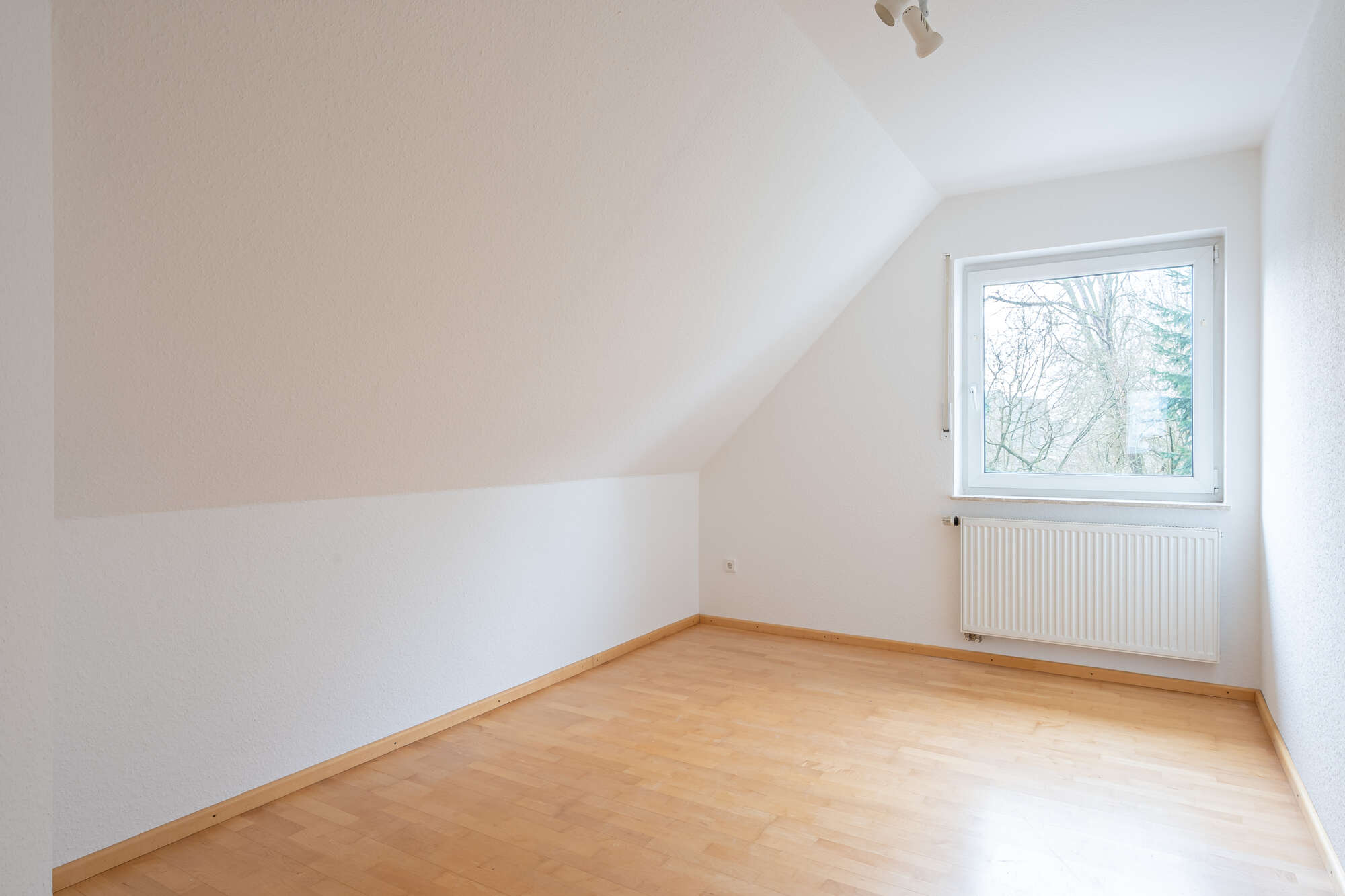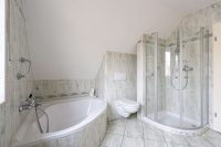 Im Dachgeschoss gelangen Sie ebenfalls über einen Flur in alle Räume. Hier stehen ein Schlafzimmer, zwei weitere individuell nutzbare Zimmer – ideal als Kinder-, Gäste- oder Arbeitszimmer – sowie ein Badezimmer mit Badewanne und Dusche zur Verfügung.
