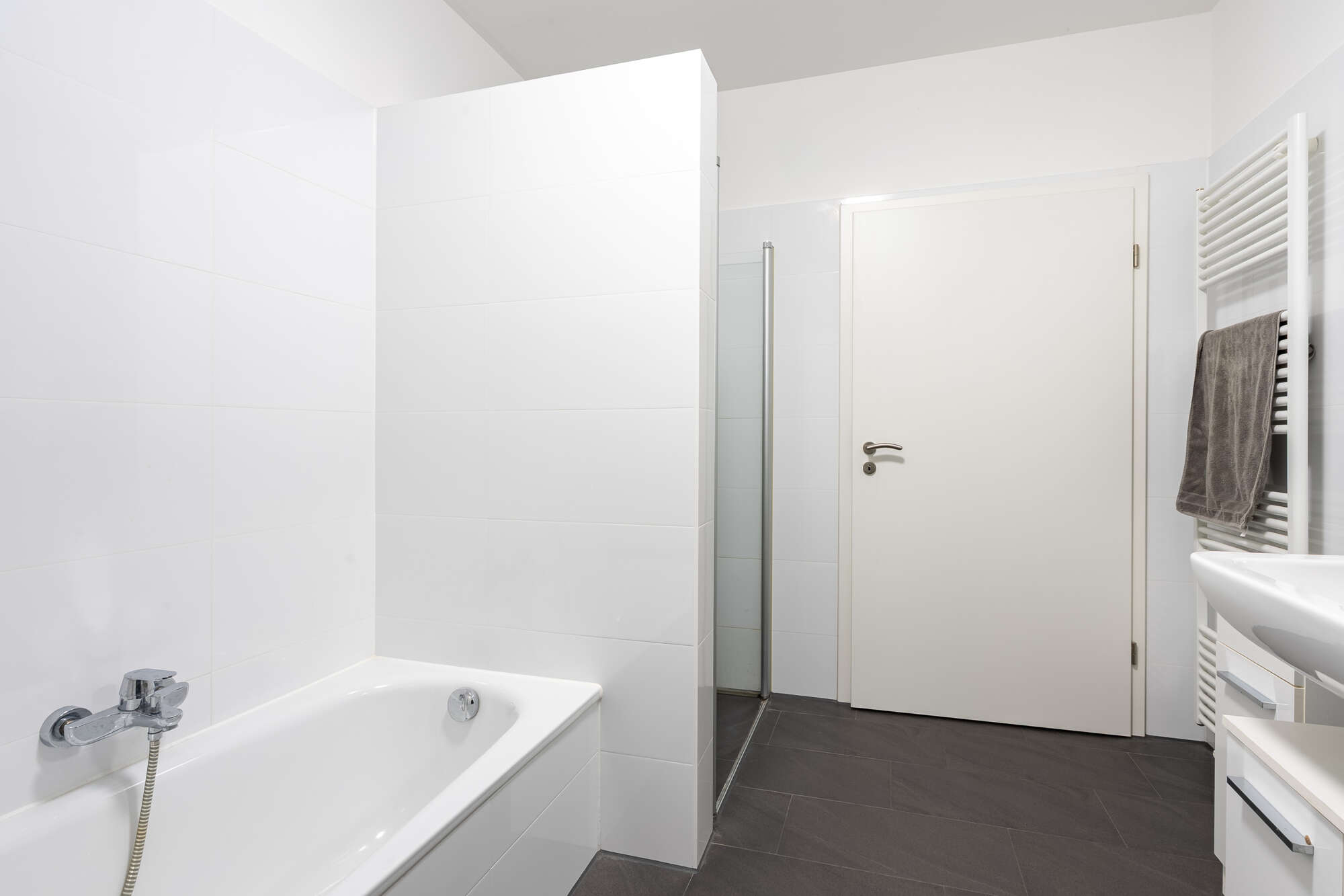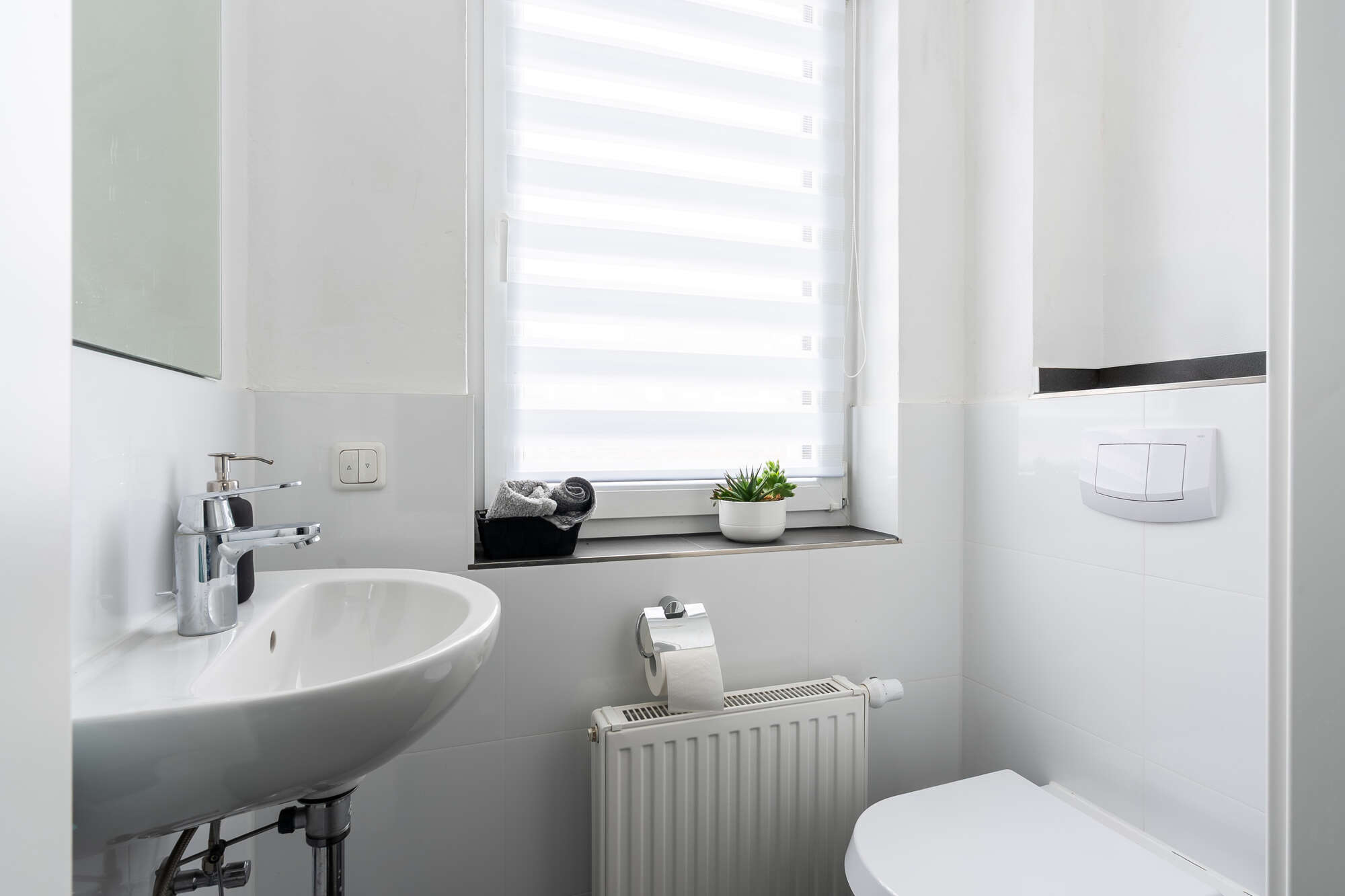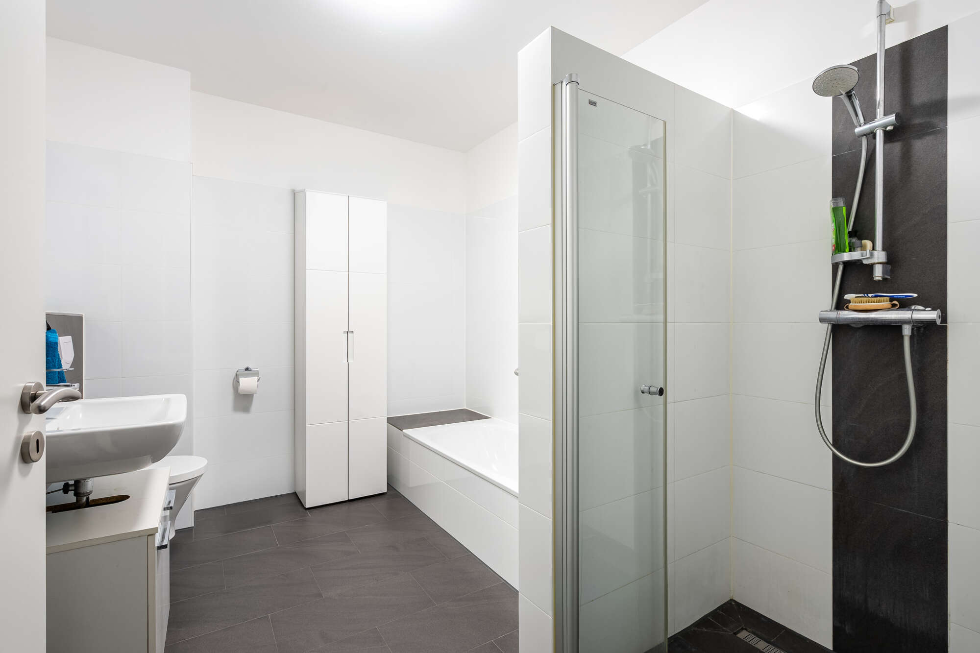 Neben einem praktischen Gäste-WC stehen Ihnen ein gemütliches Schlafzimmer sowie ein großzügiges Badezimmer zur Verfügung, das sowohl mit einer Badewanne als auch mit einer Dusche ausgestattet ist.