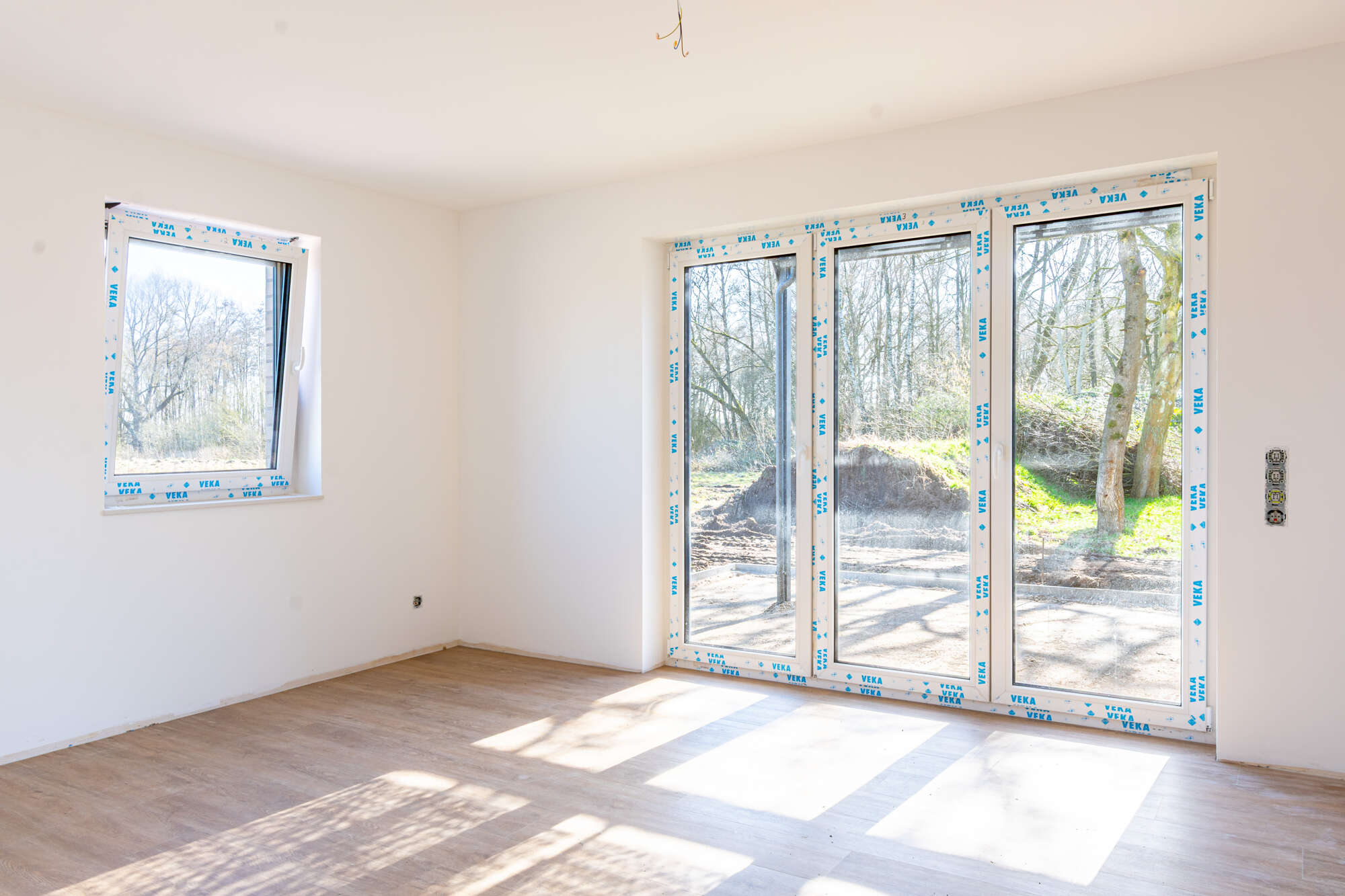 Große Fenster sorgen für viel Tageslicht und schaffen eine freundliche, warme Atmosphäre. Der direkte Zugang zur Terrasse erweitert den Wohnraum ins Freie und macht sie zum idealen Ort für den ersten Kaffee am Morgen oder ein Glas Wein am Abend.