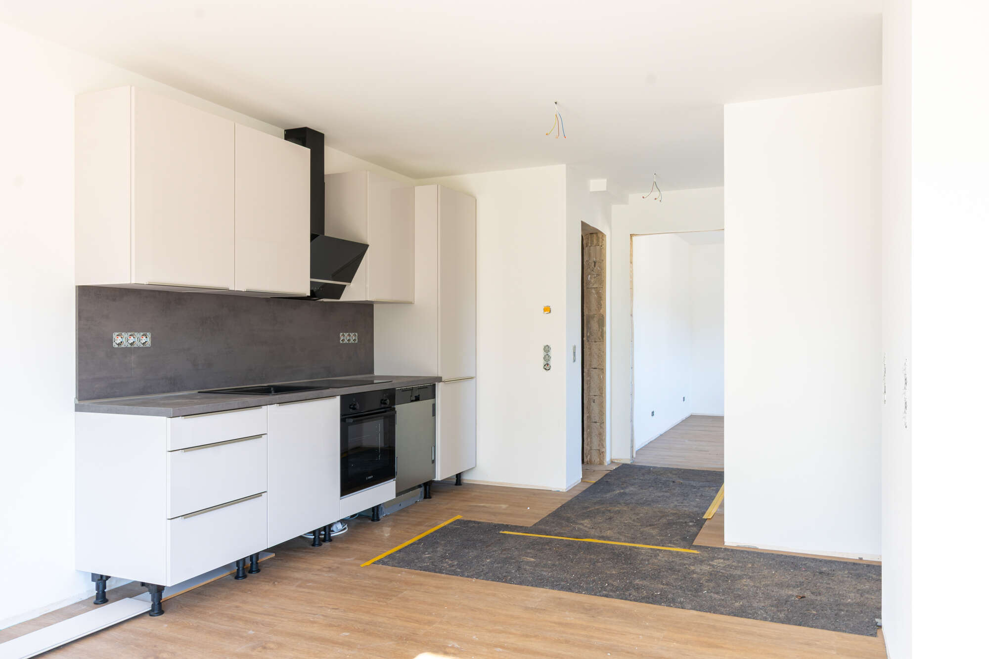 Der offen gestaltete Wohn- und Essbereich mit integrierter Küche bildet den lebendigen Mittelpunkt der Wohnung. Hier genießen Sie gemeinsame Kochabende, entspannte Stunden auf dem Sofa oder gesellige Abende mit Freunden.