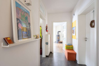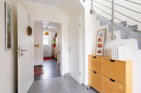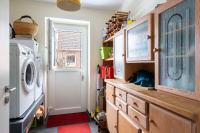 Zusätzlich steht ein Hauswirtschaftsraum mit separatem Zugang zum Außenbereich zur Verfügung. Der Raum bietet praktischen Stauraum und ist mit einem Waschmaschinenanschluss ausgestattet. Zudem verfügt der Hauswirtschaftsraum über ein Podest für Waschmaschine und Trockner sowie über ein großes Waschbecken.