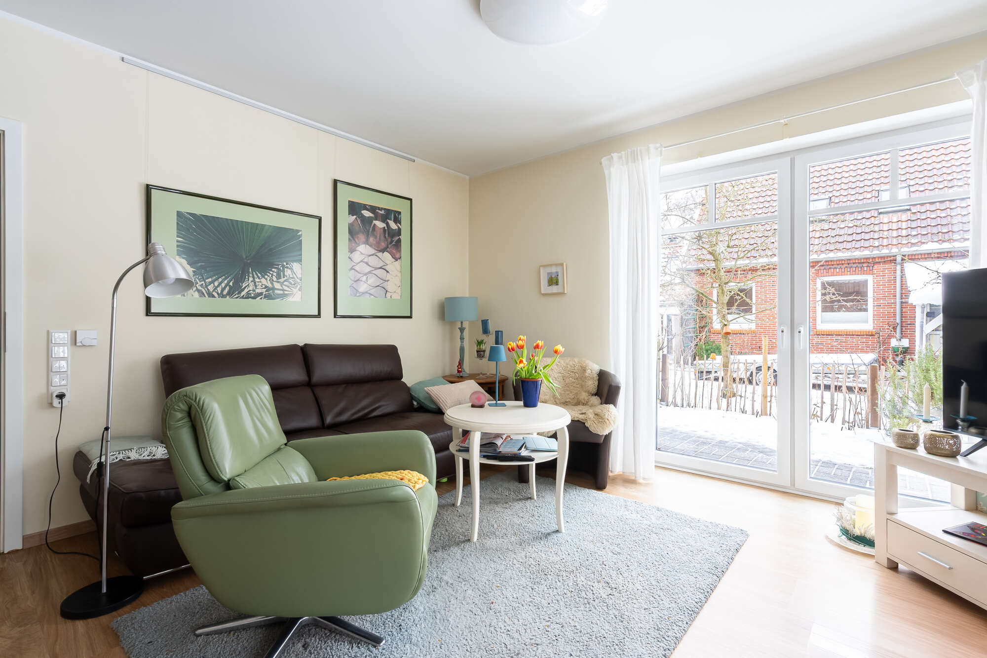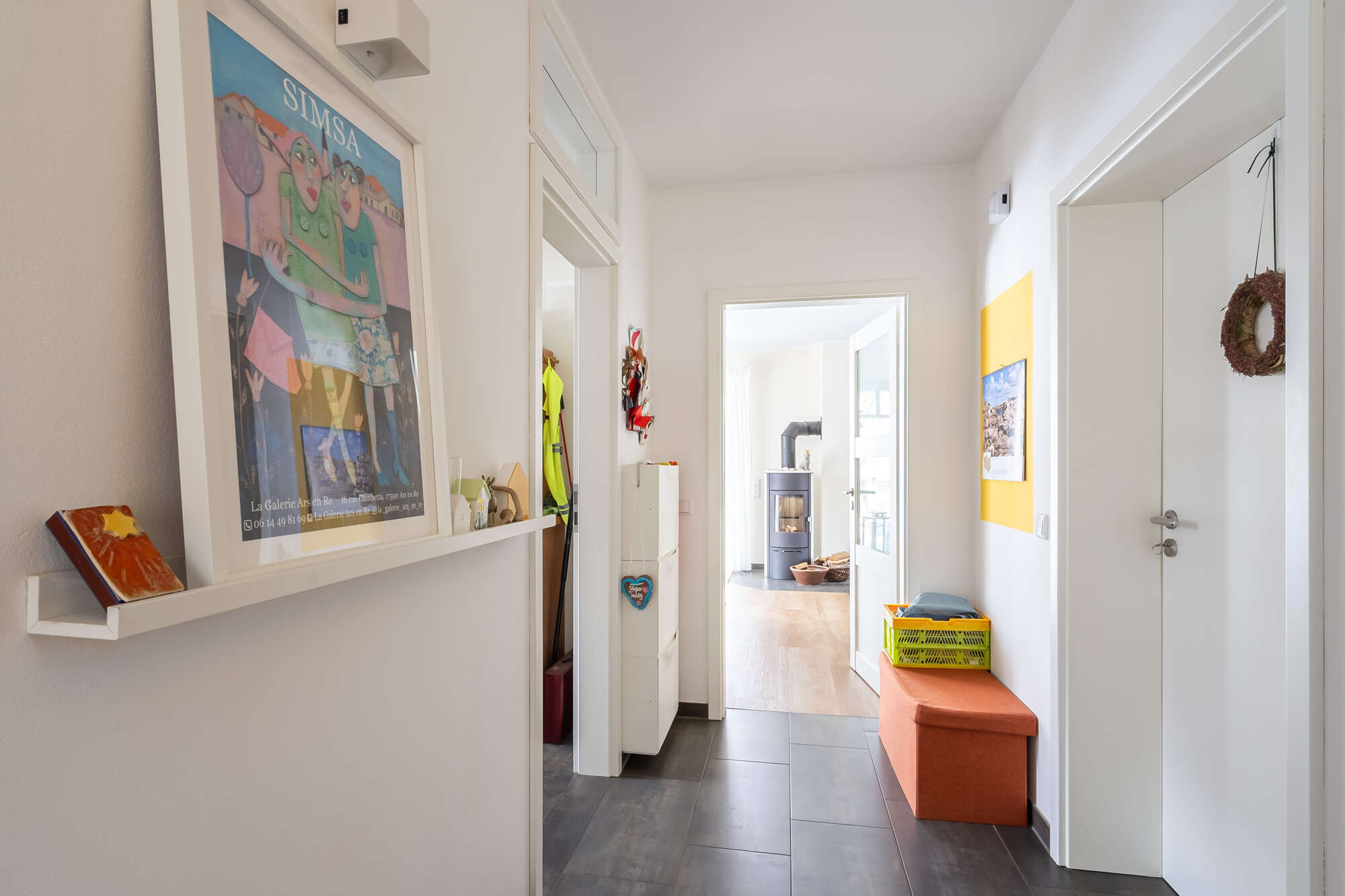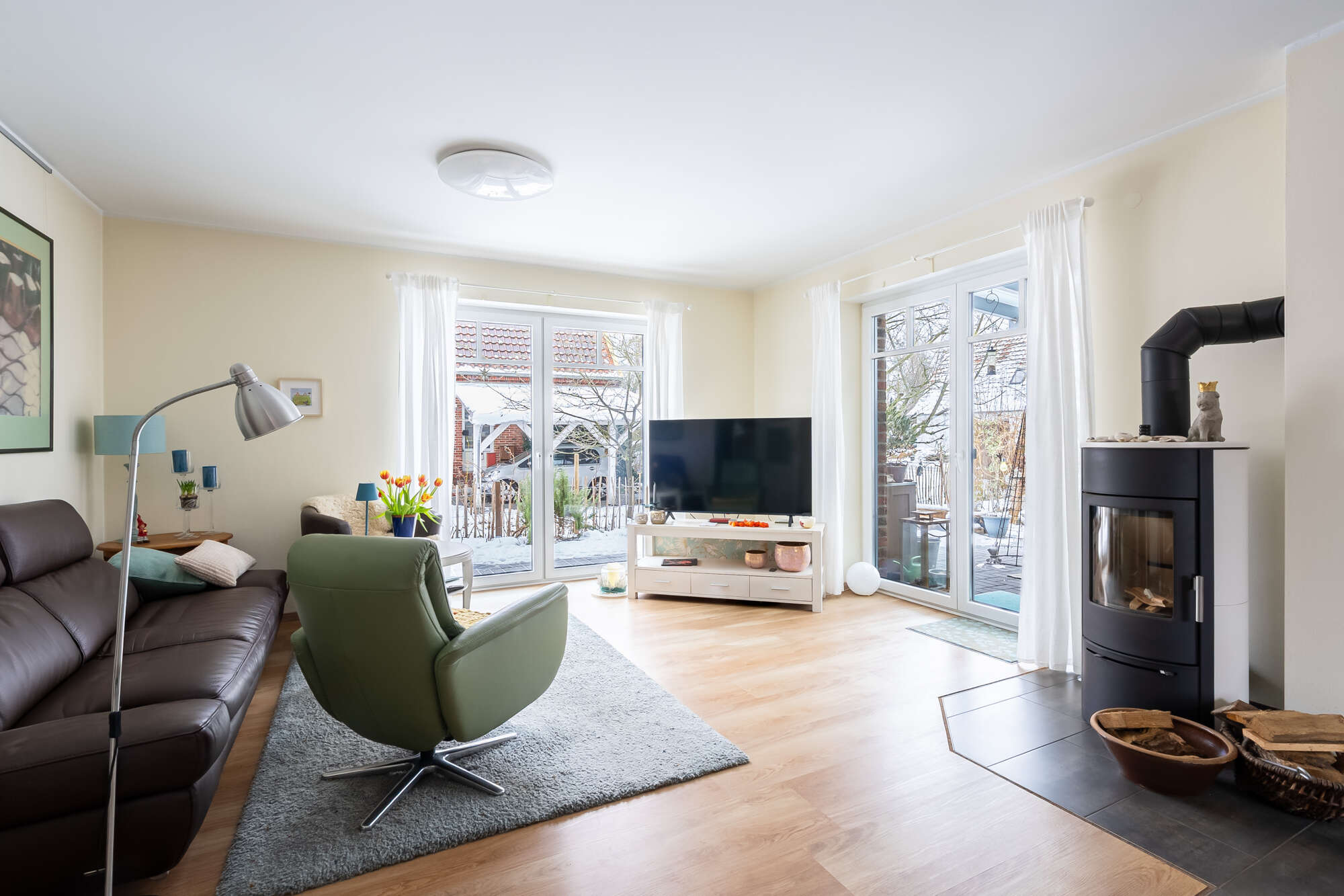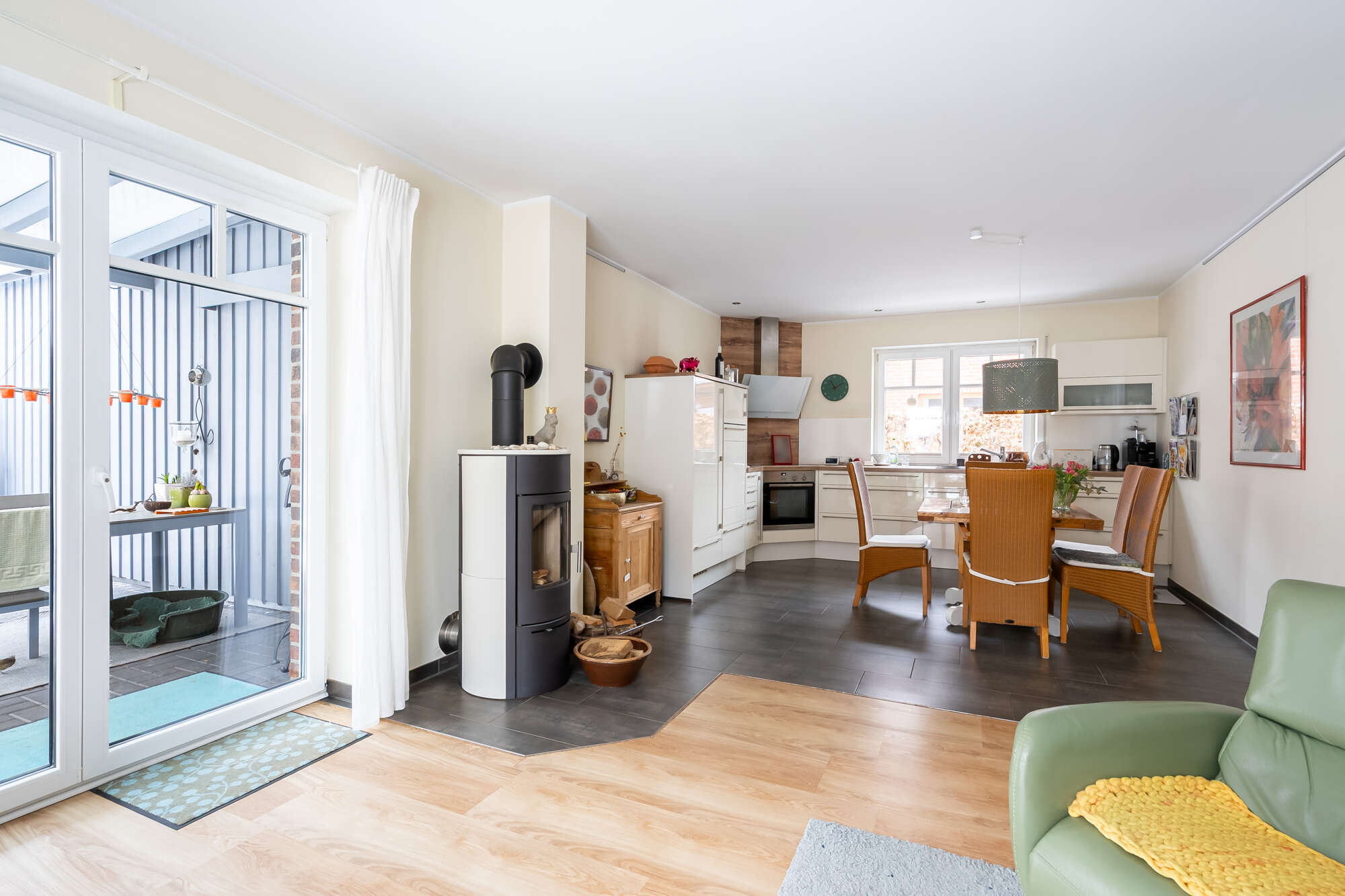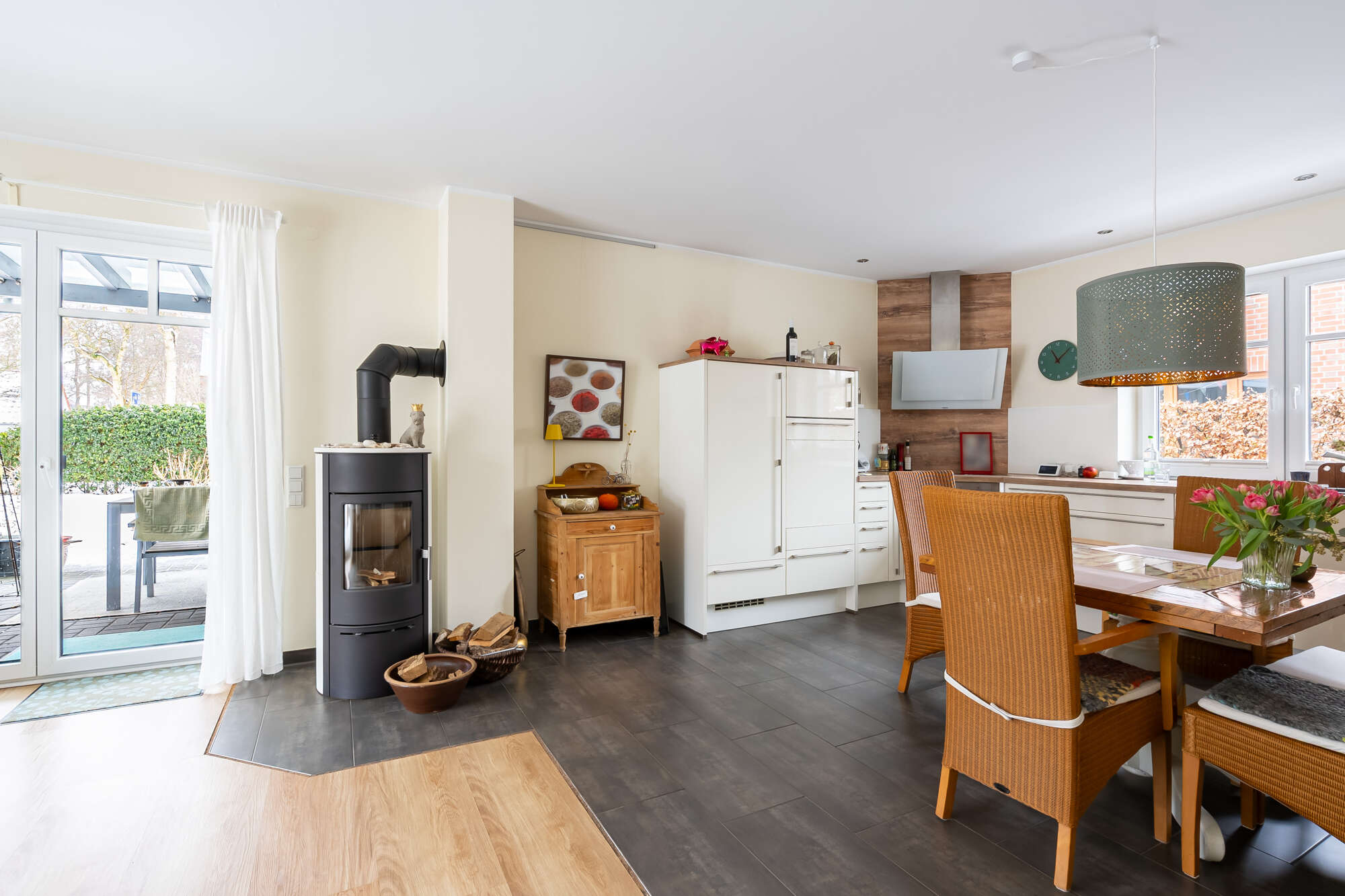 Vom Flur aus lassen sich alle Räume komfortabel erreichen. Über zwei Bereichen des Flurs sind Oberlichter integriert, die den innenliegenden Flur mit zusätzlichem Tageslicht versorgen. Das Herzstück der Immobilie bildet der offene Wohn- und Essbereich mit moderner Einbauküche und großen Flügeltüren, die für einen herrlichen Lichteinfall sorgen. Vom Wohnbereich gelangt man elegant auf die überdachte Terrasse und den gemütlichen Gartenbereich.