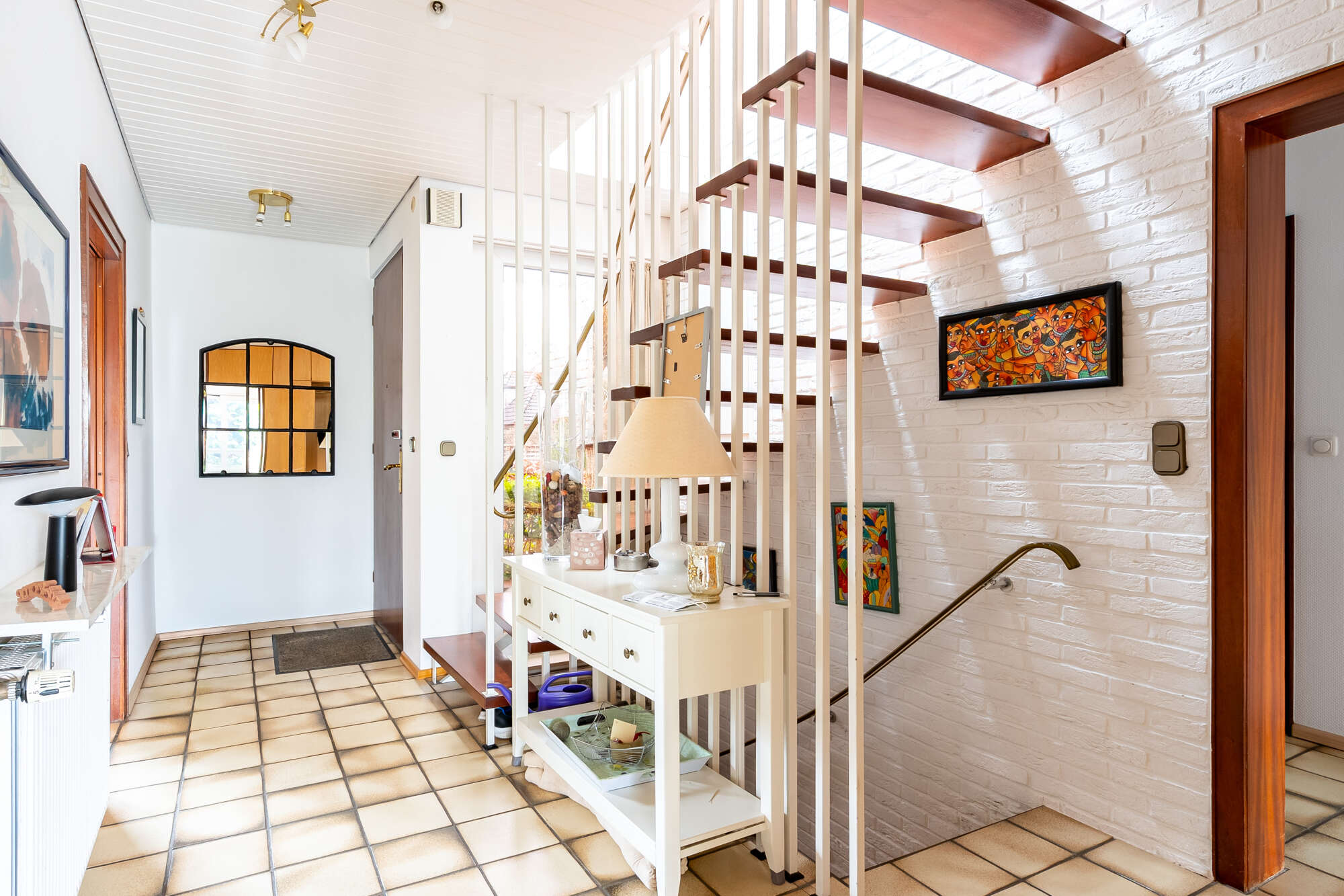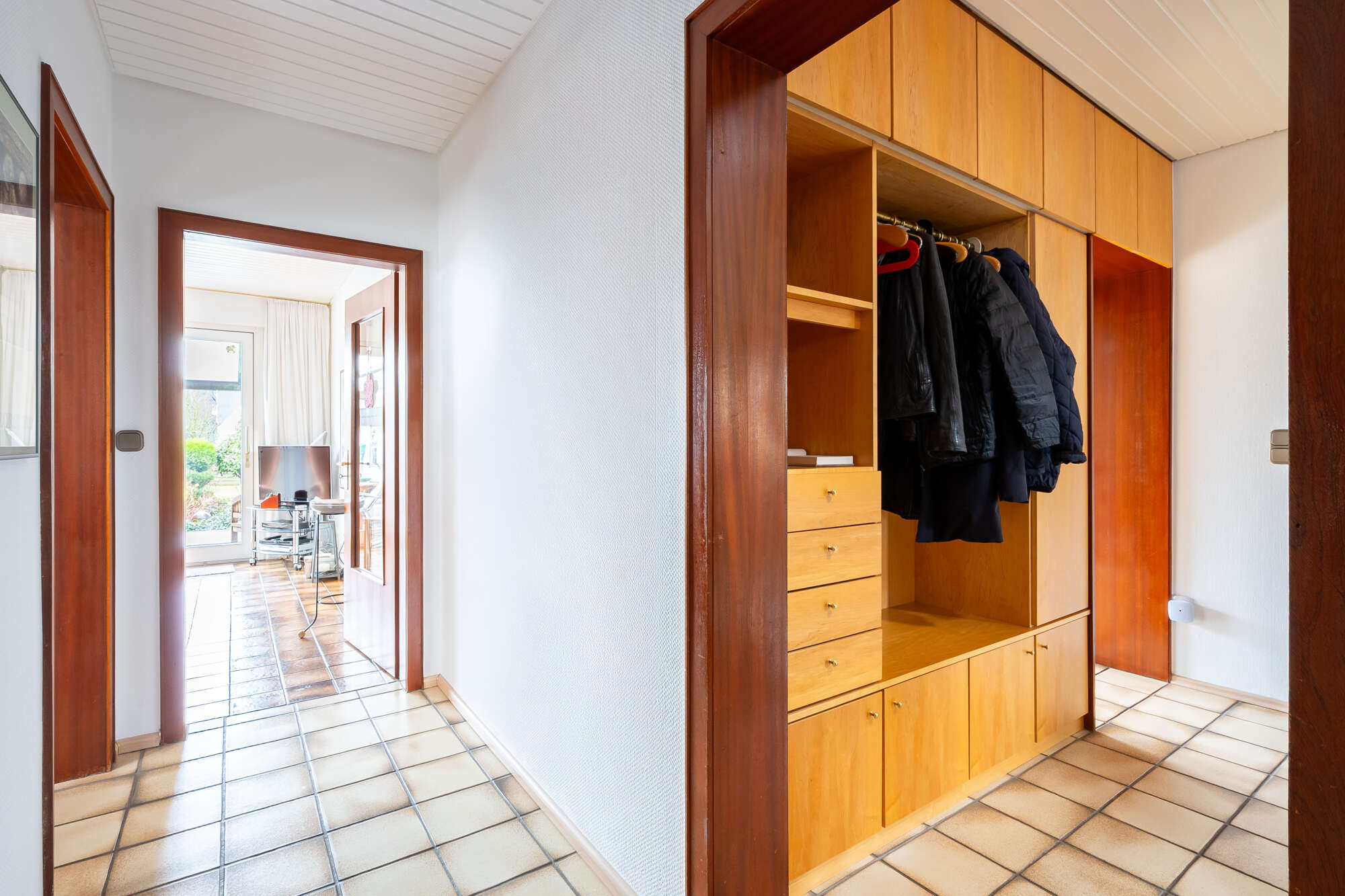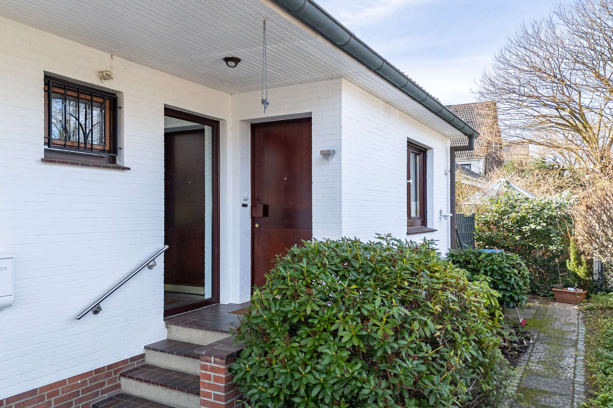 Bereits der überdachte Eingangsbereich bietet einen geschützten und einladenden Empfang. Beim Betreten des Hauses gelangen Sie in einen großzügigen, langen Flur mit viel Platz für Garderobe und stilvolle Gestaltungsmöglichkeiten.