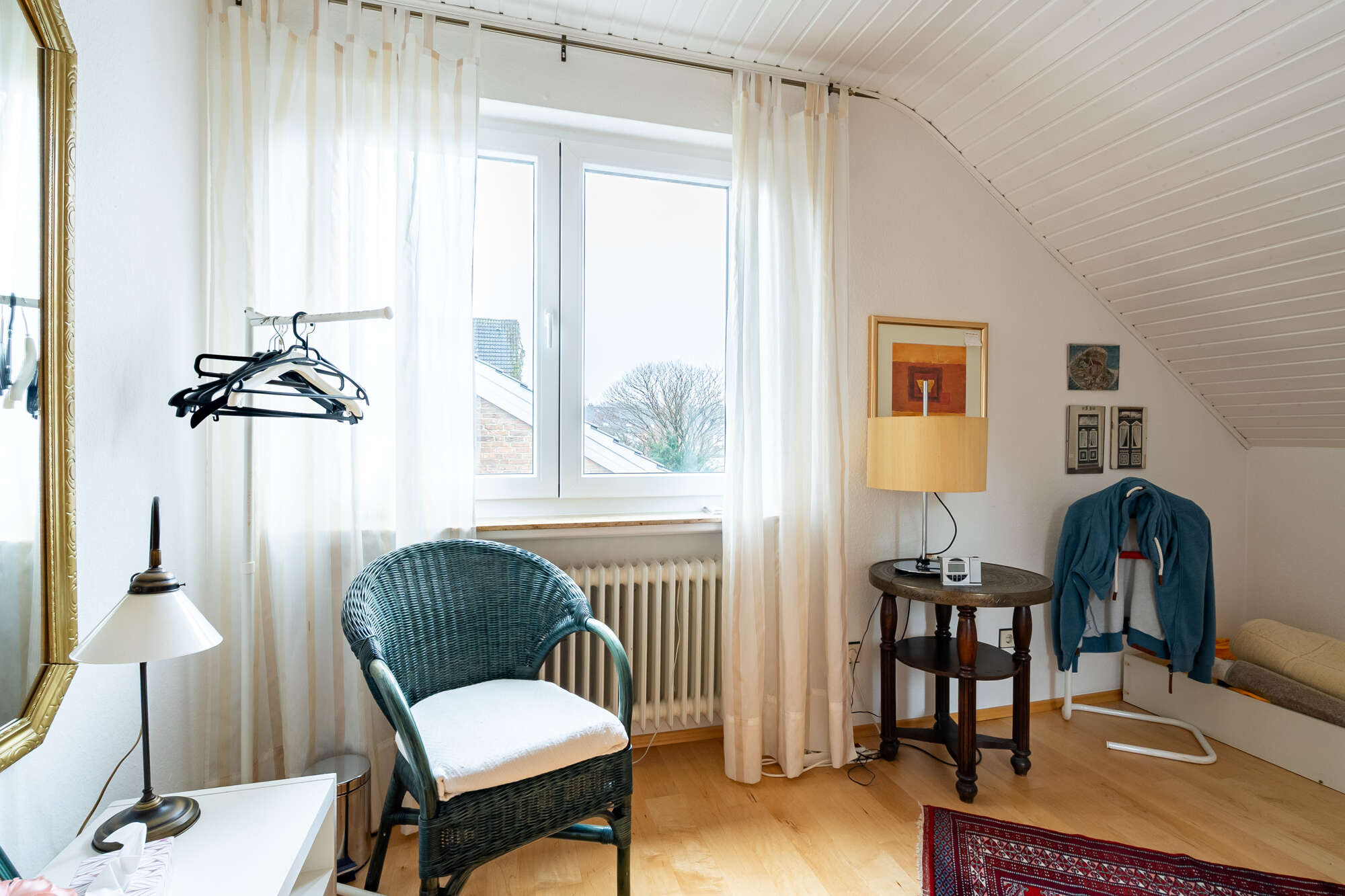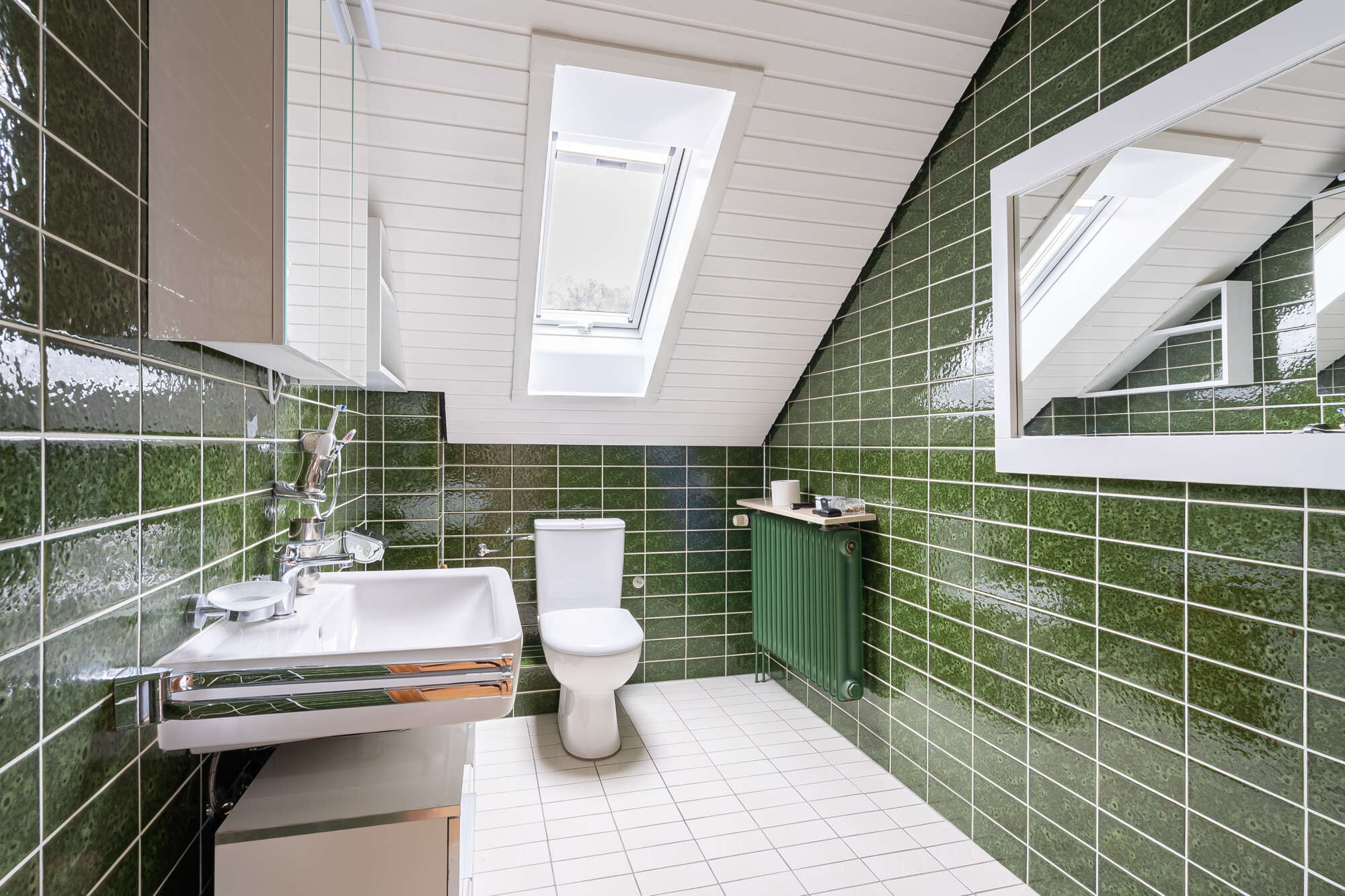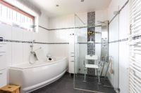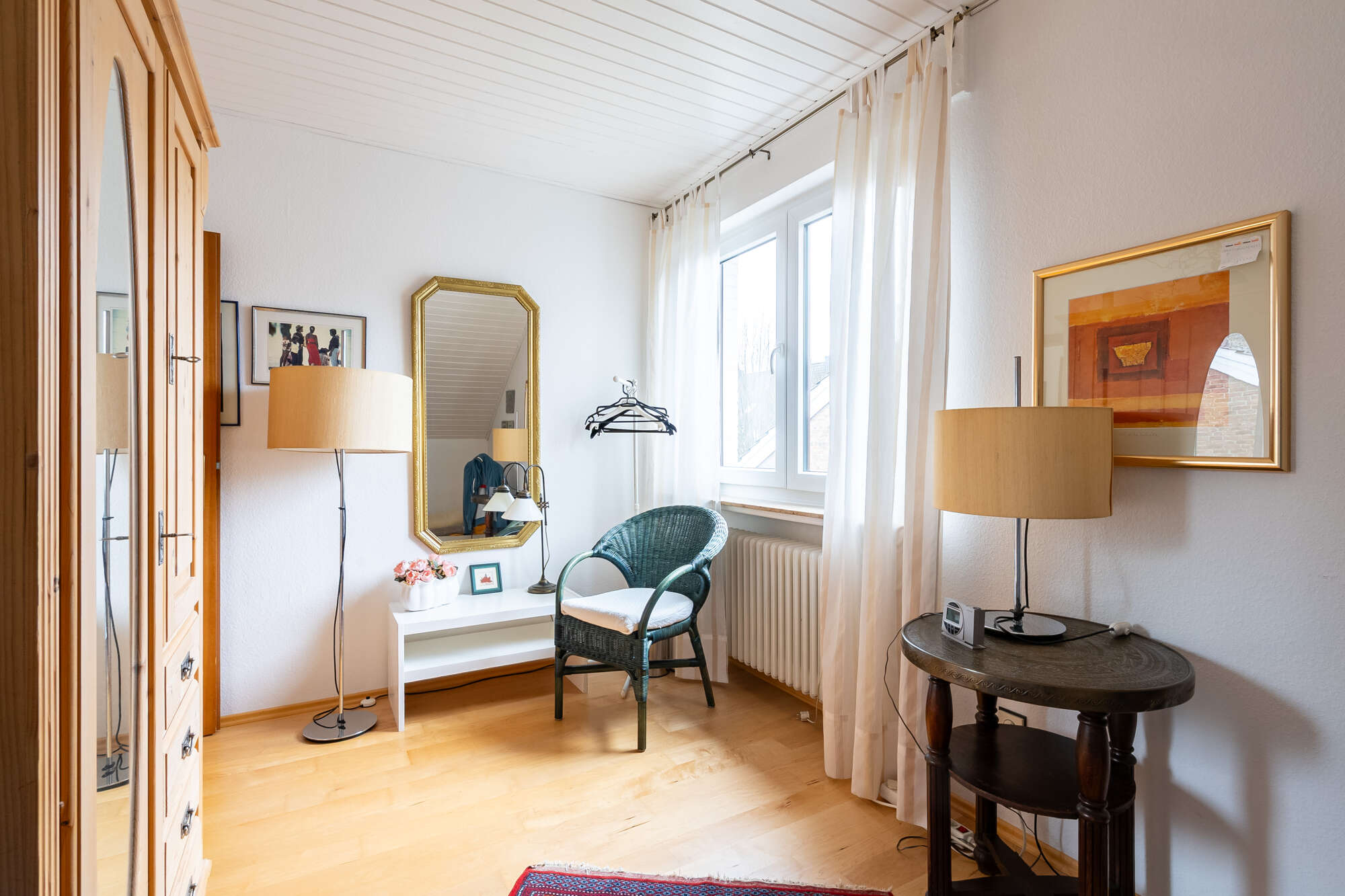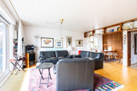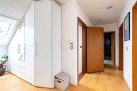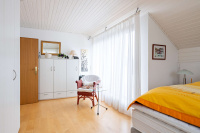 Auch das Obergeschoss präsentiert sich angenehm hell und eröffnet zahlreiche Gestaltungsmöglichkeiten. Das Badezimmer ist mit Dusche, Bidet und Waschtisch ausgestattet, zusätzlich steht ein separates WC zur Verfügung. Die Dachflächenfenster können teilweise manuell, teilweise elektrisch abgedunkelt werden.