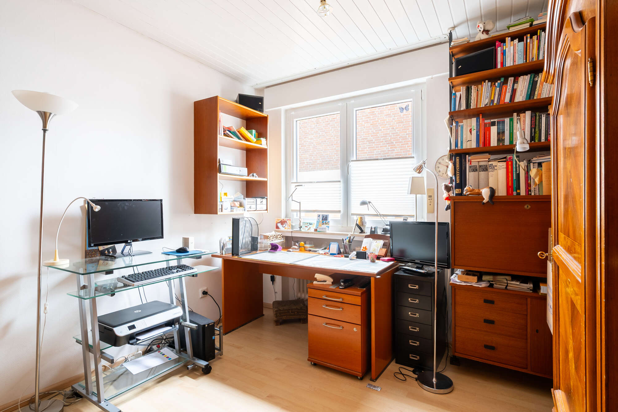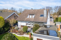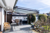 Komfort wird in diesem Haus großgeschrieben: Sämtliche Jalousien sind elektrisch betrieben, verfügen über Zeitschaltuhren und einen Sonnensensor – bei starker Sonneneinstrahlung fahren sie automatisch herunter. Auch die Markise auf der Terrasse ist elektrisch steuerbar. Im Erdgeschoss befinden sich außerdem ein weiteres flexibel nutzbares Zimmer – ideal als Büro, Gäste- oder Schlafzimmer – ein Gäste-WC sowie ein großzügiges Badezimmer mit Badewanne, ebenerdiger Dusche, WC und Waschtisch.