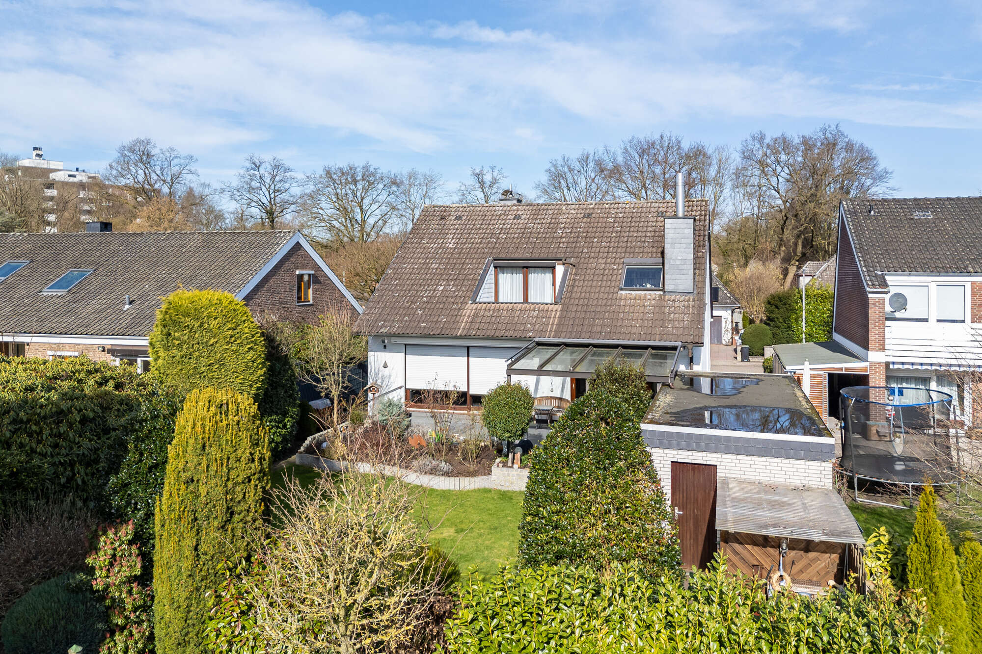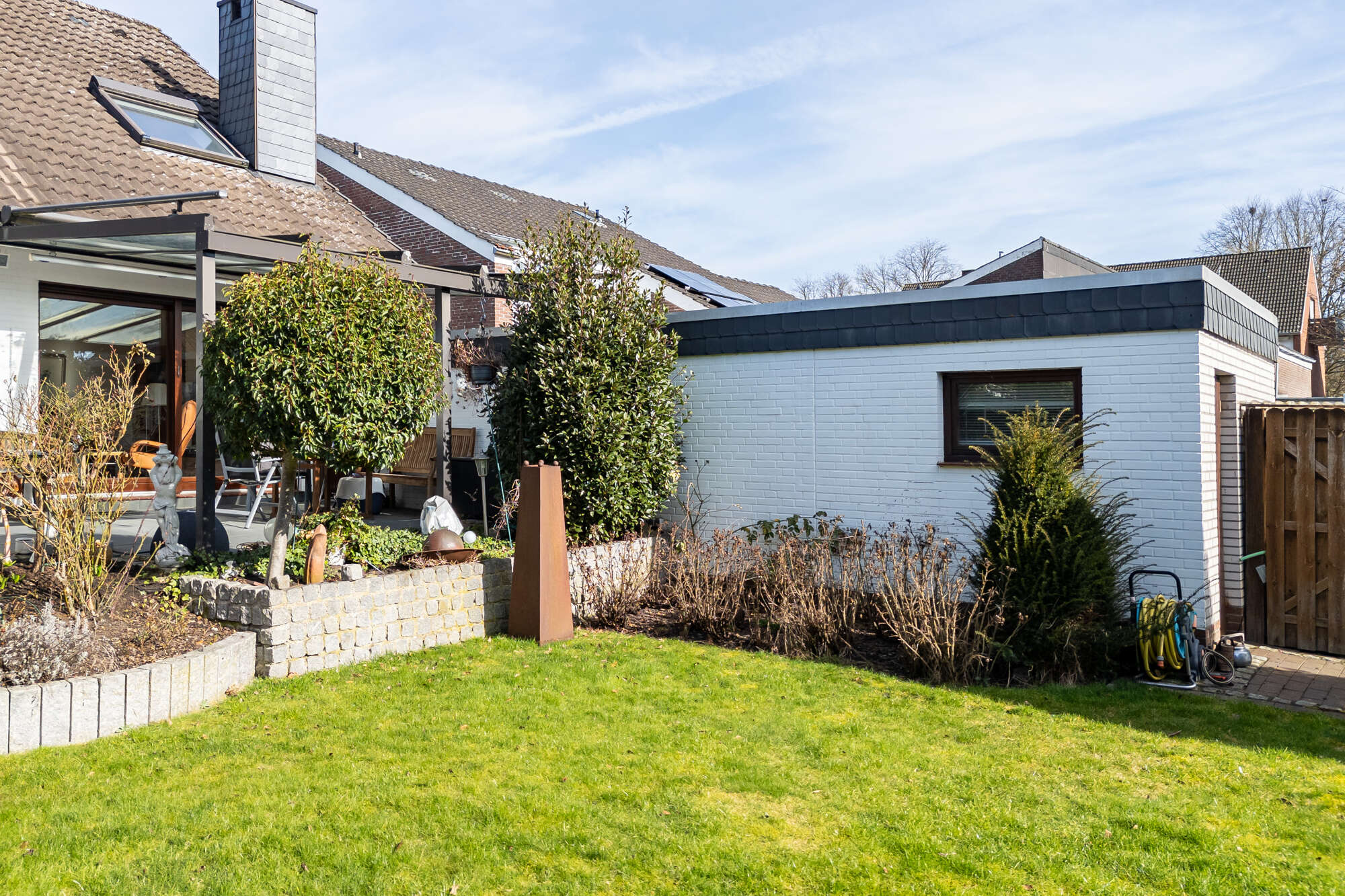 Auch der Außenbereich überzeugt auf ganzer Linie: Der Garten ist liebevoll und schön angelegt und bietet eine grüne Oase zum Entspannen und Genießen. Eine beeindruckende, große Tanne verleiht dem Grundstück besonderen Charakter und schafft eine idyllische Atmosphäre. Dank eines eigenen Brunnens zur Gartenbewässerung sind Sie zudem unabhängig vom Leitungswasser und können Ihre Außenanlage kostensparend pflegen.