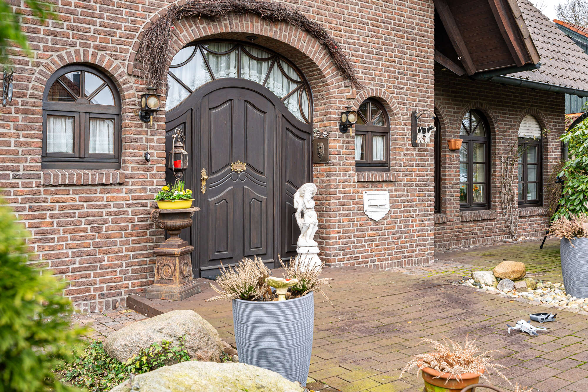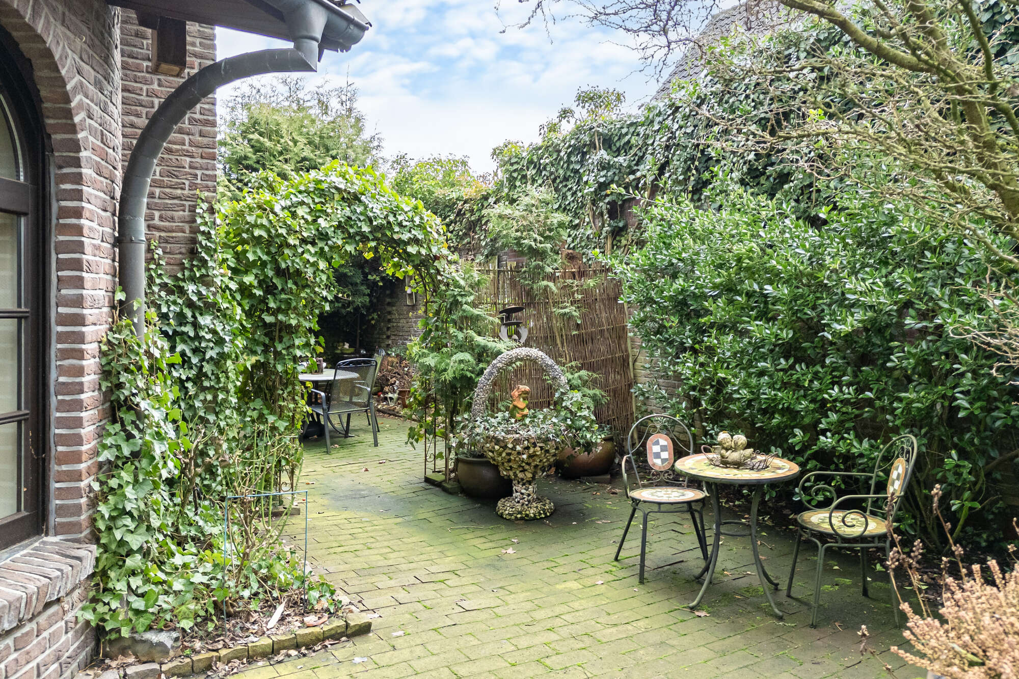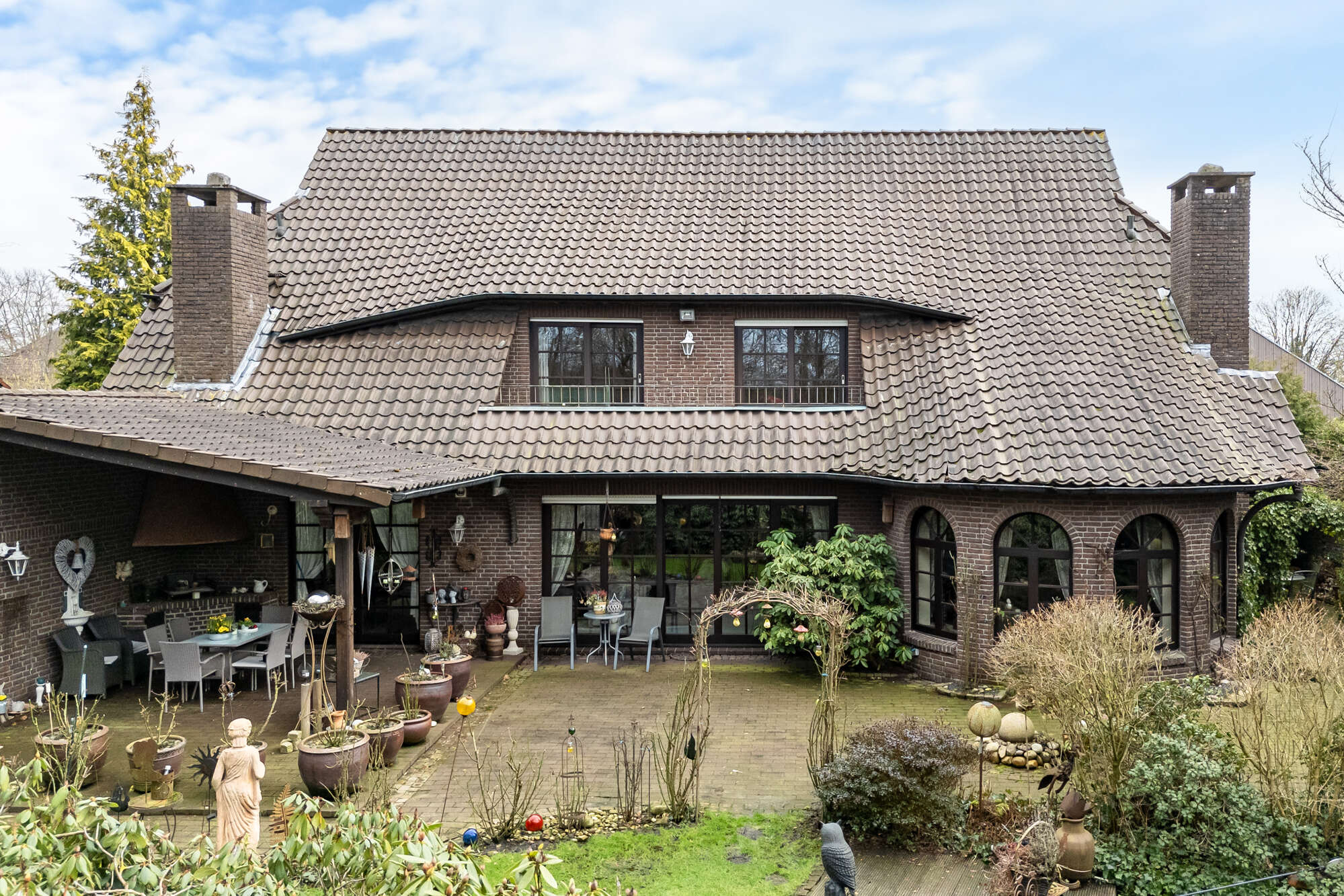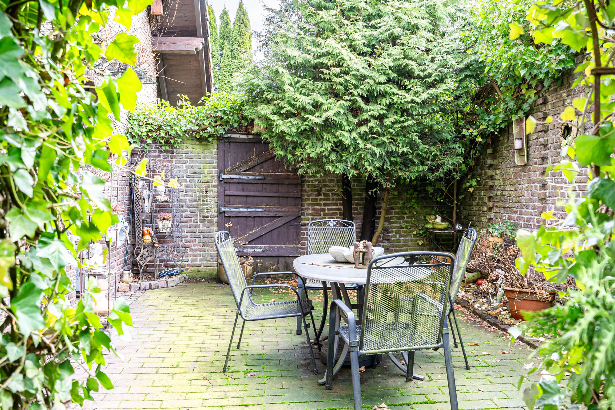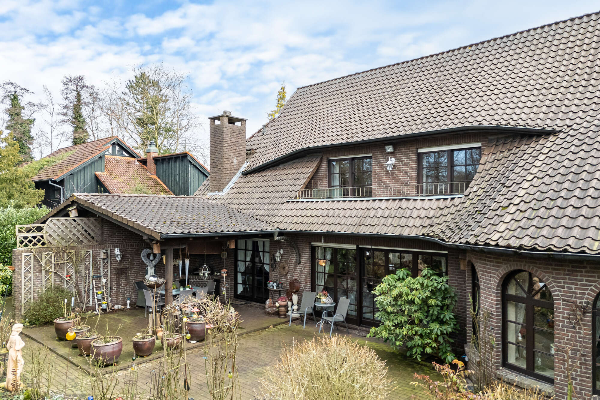 Der Außenbereich begeistert mit einem liebevoll gestalteten Garten, in dem sich Pflanzen, ein Teich und mehrere gemütliche Terrassen wiederfinden.