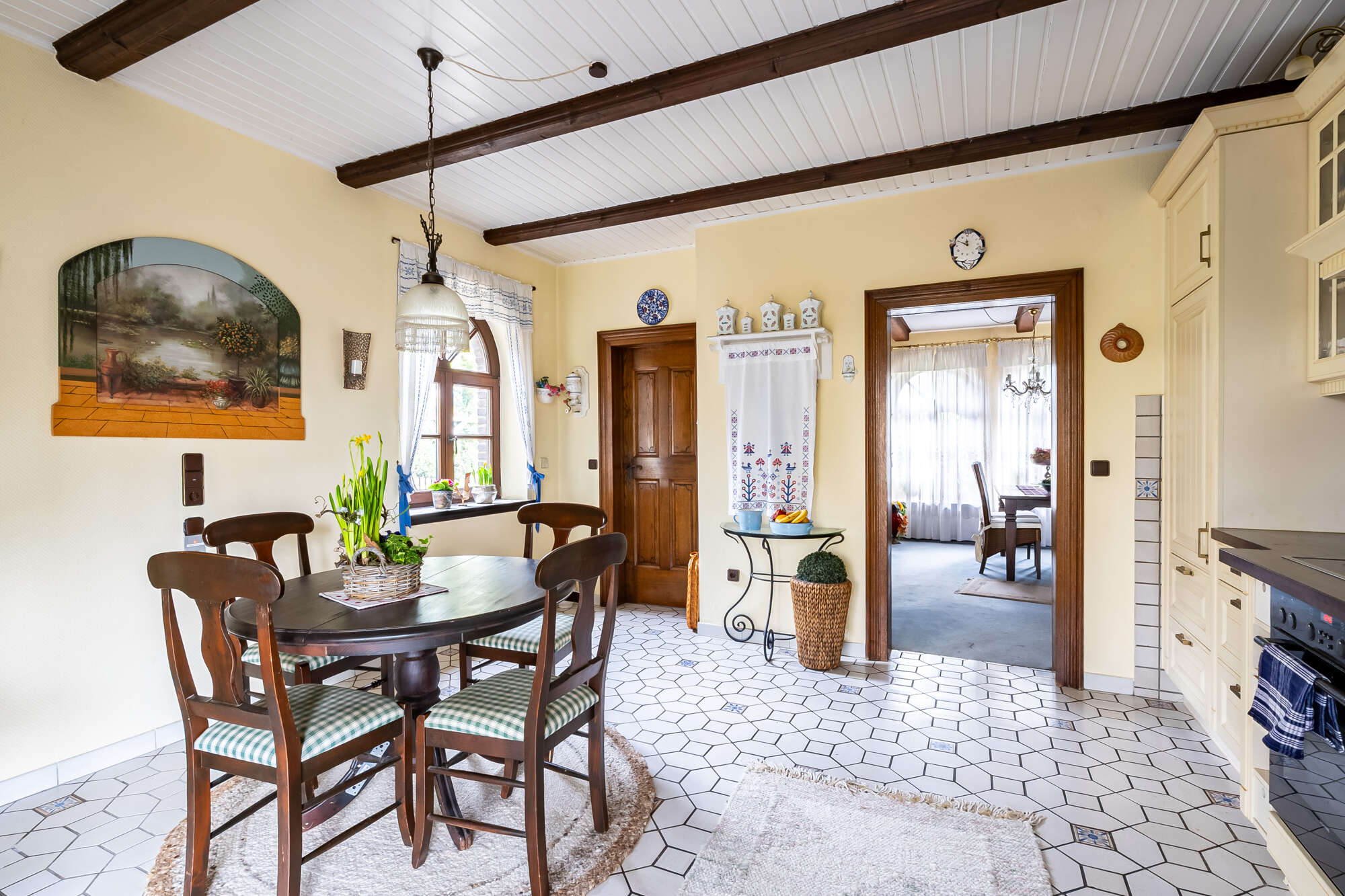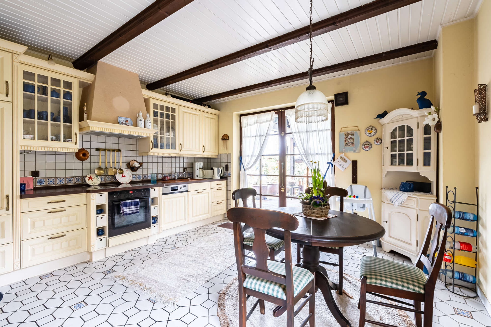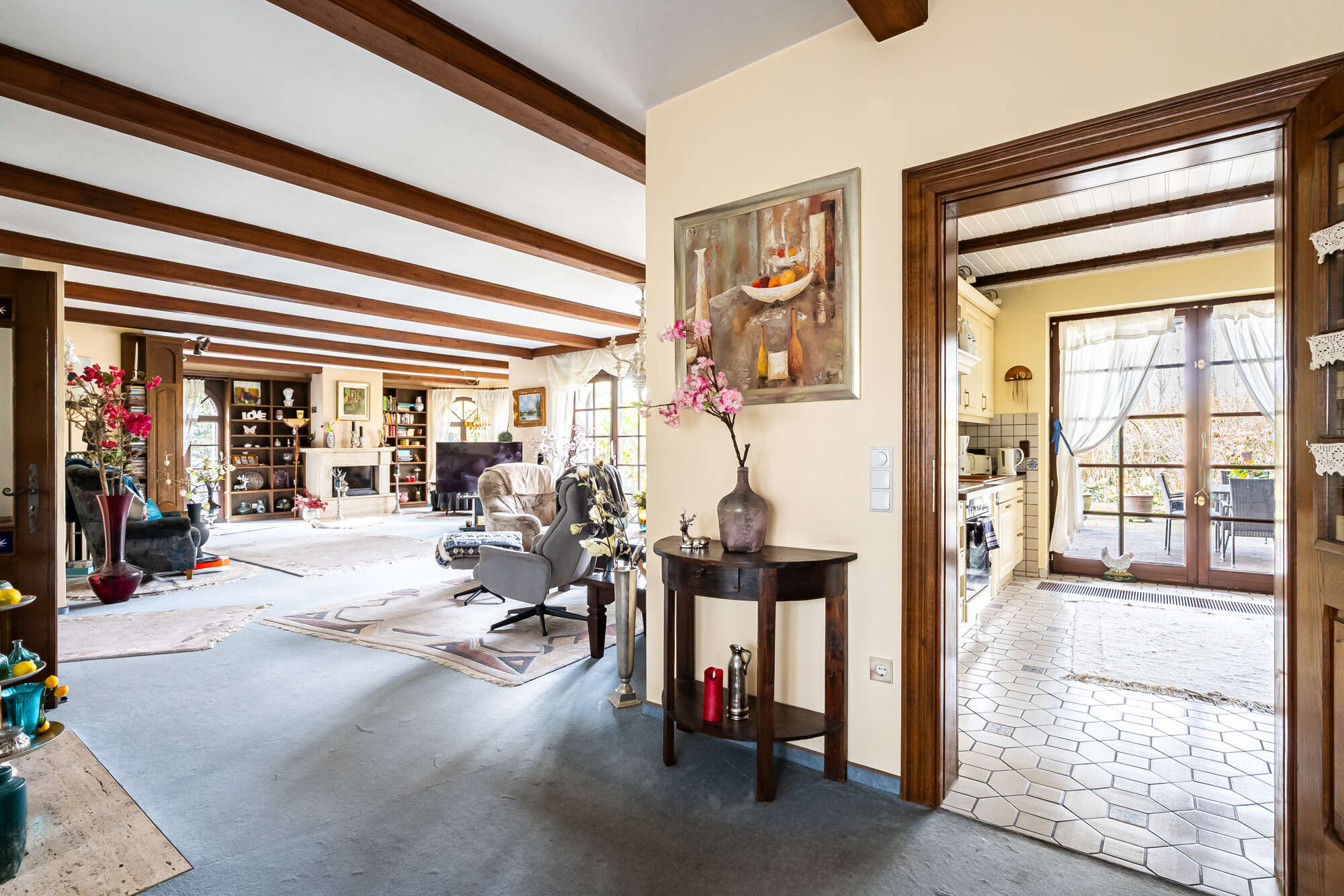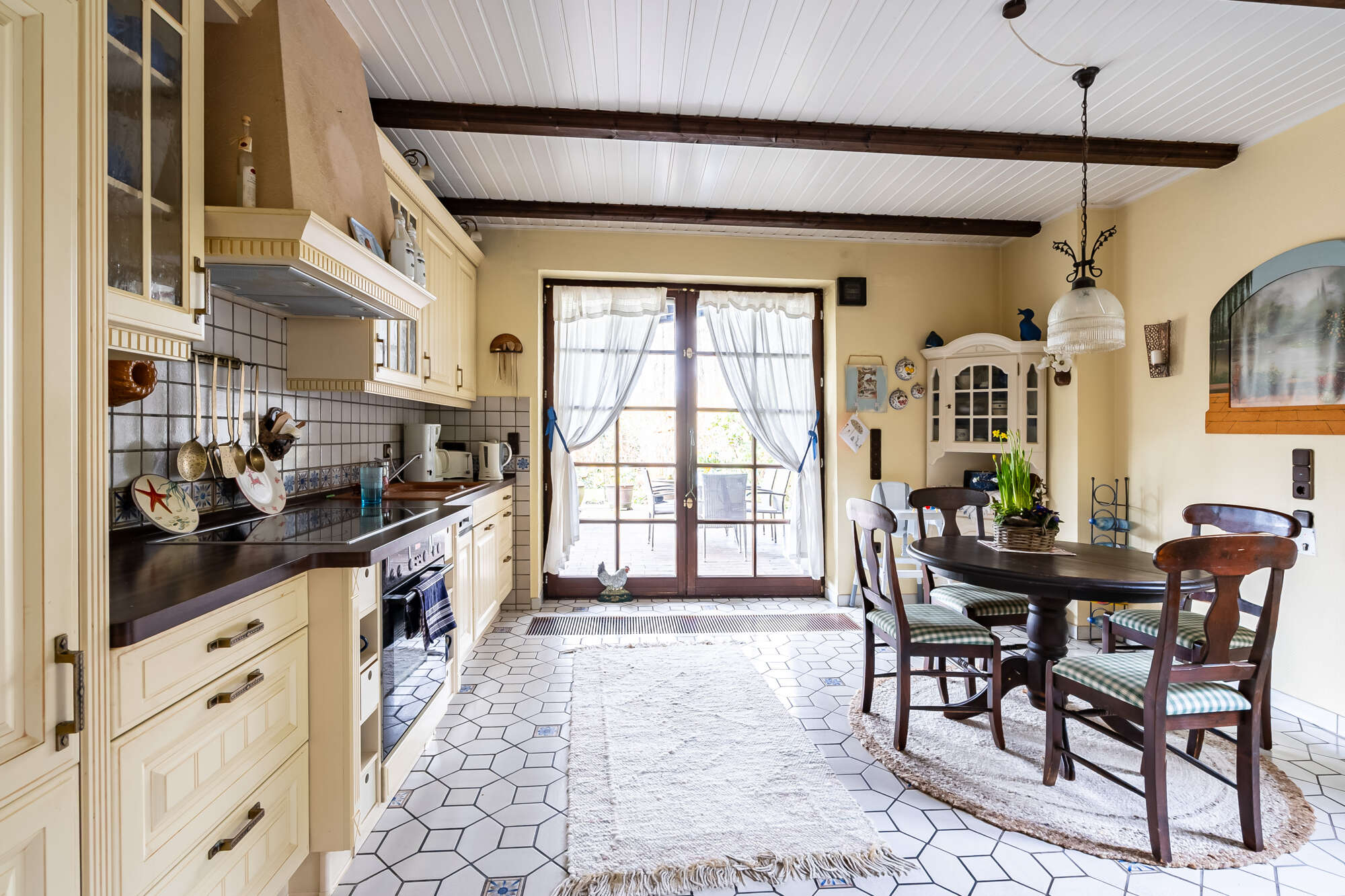 Die Küche ist mit einer Einbauküche ausgestattet und bietet ebenfalls Zugang zur überdachten Terrasse mit Blick in den Garten.