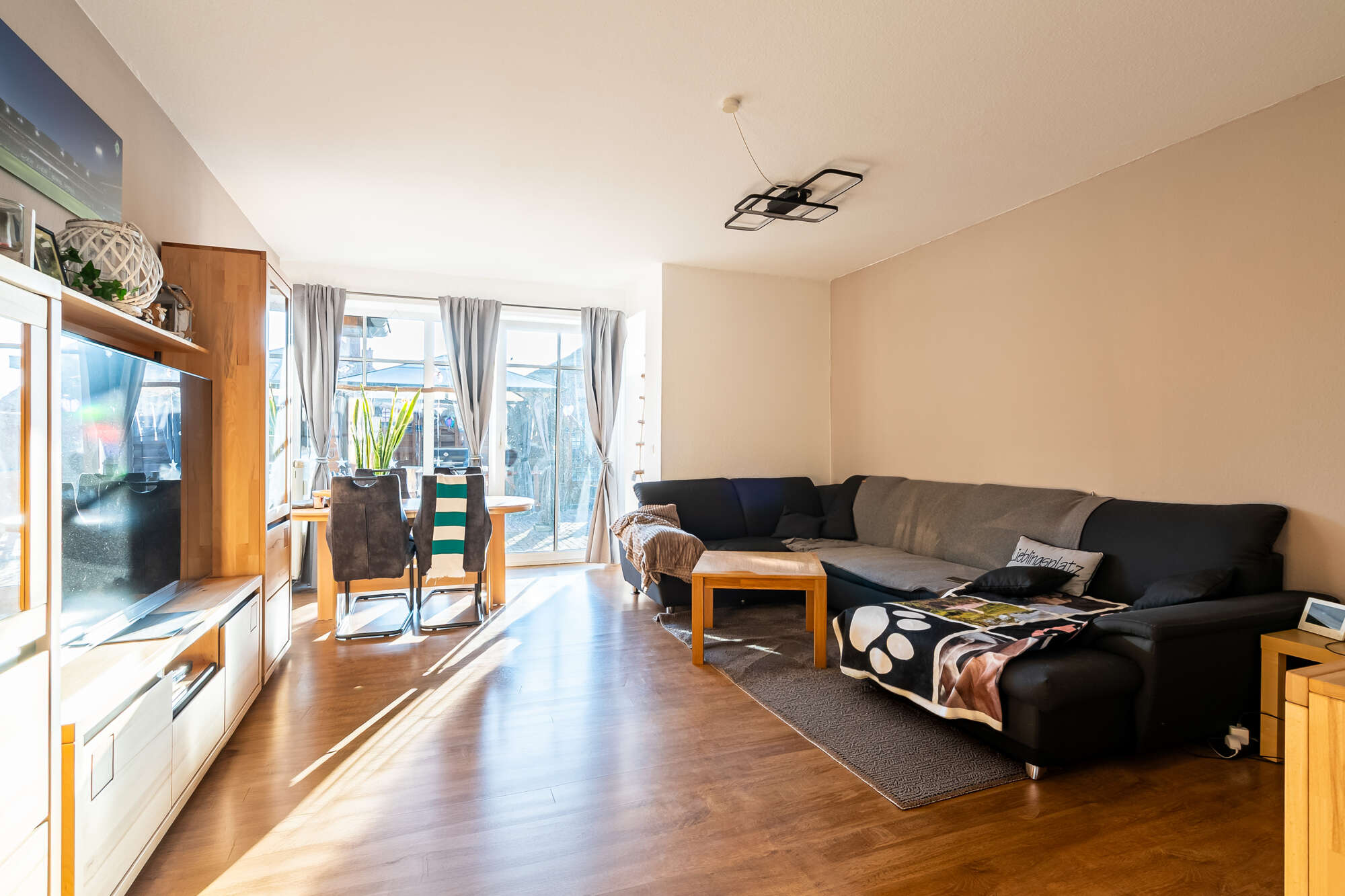 Der großzügige Wohnbereich wirkt offen und einladend und bietet direkten Zugang zur überdachten Terrasse. Dank der günstigen Sonnenausrichtung lassen sich hier helle Nachmittage und angenehme Abendstunden im Freien genießen – ideale Voraussetzungen für entspannte Momente mit Familie oder Freunden.