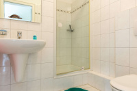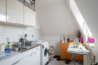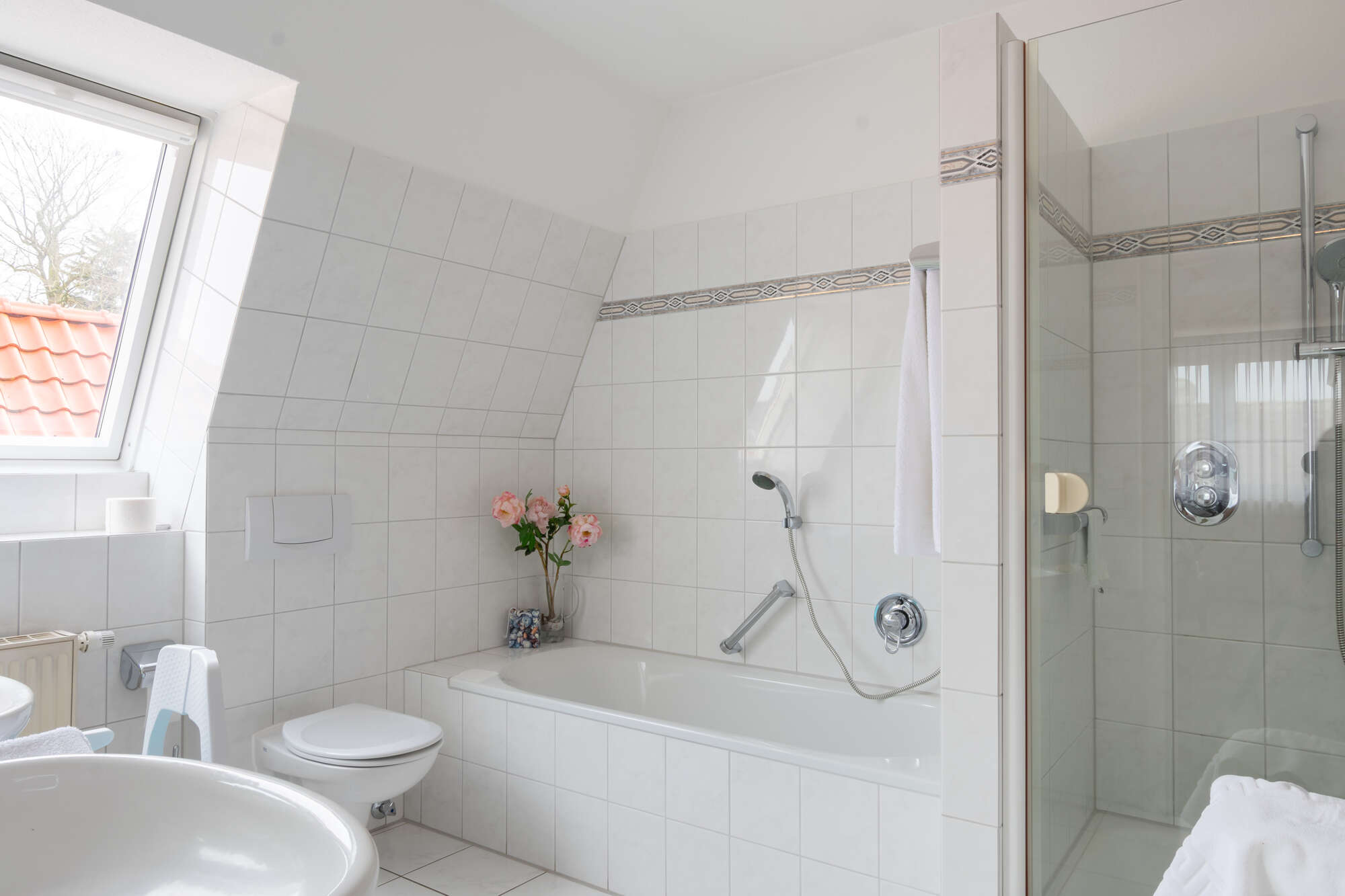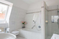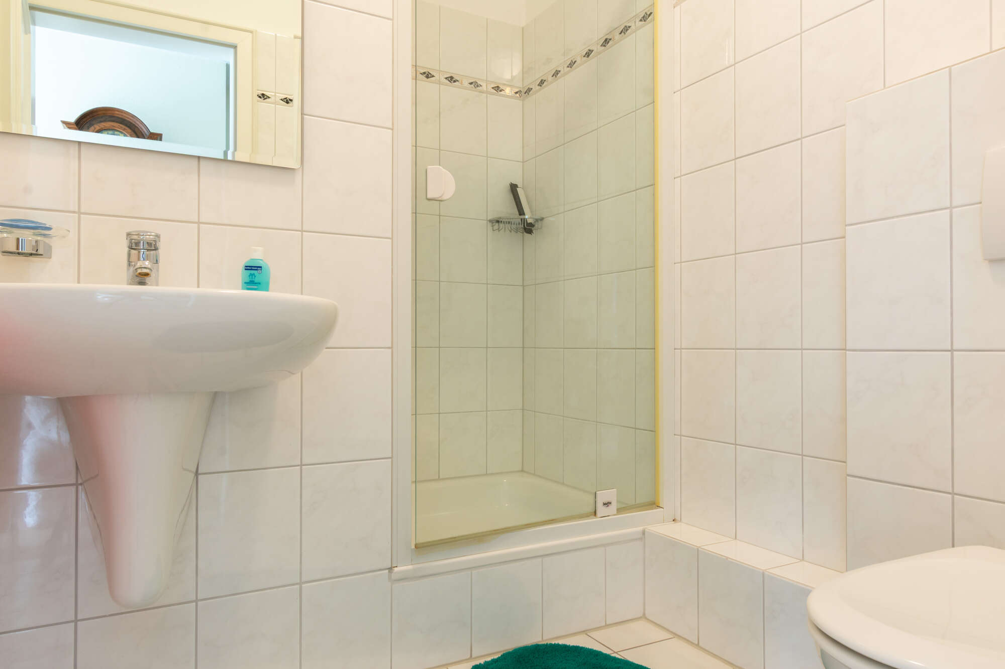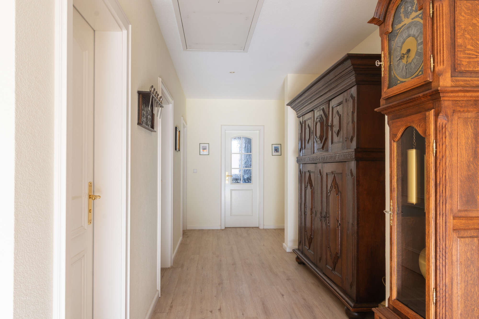 Ein Gäste WC mit integrierter Dusche ergänzt das Raumangebot auf praktische Weise. Über einen weiteren, längeren Flur erreichen Sie die übrigen Räume der Wohnung. Das Badezimmer präsentiert sich komfortabel und gut geschnitten. Der geräumige Hauswirtschaftsraum mit Fenster sorgt für zusätzliche Funktionalität und angenehme Lichtverhältnisse.