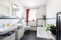 Das Badezimmer ist modern ausgestattet und verfügt sowohl über eine Dusche als auch über eine Badewanne. Ergänzt wird das Raumangebot durch ein separates Gäste-WC. Ein Hauswirtschaftsraum innerhalb der Wohnung bietet zusätzliche Abstell- und Lagermöglichkeiten.