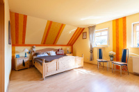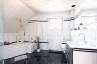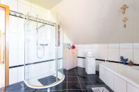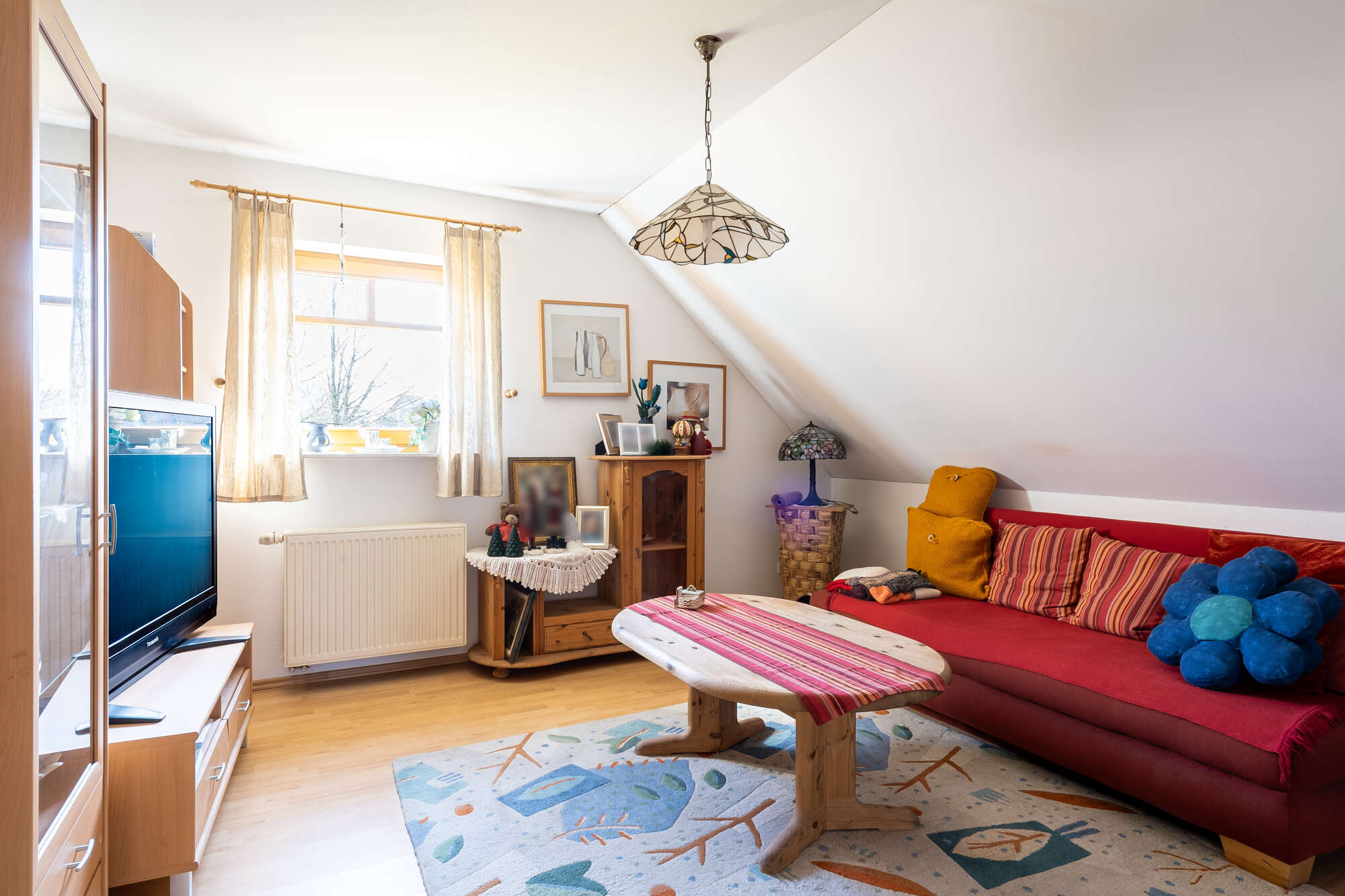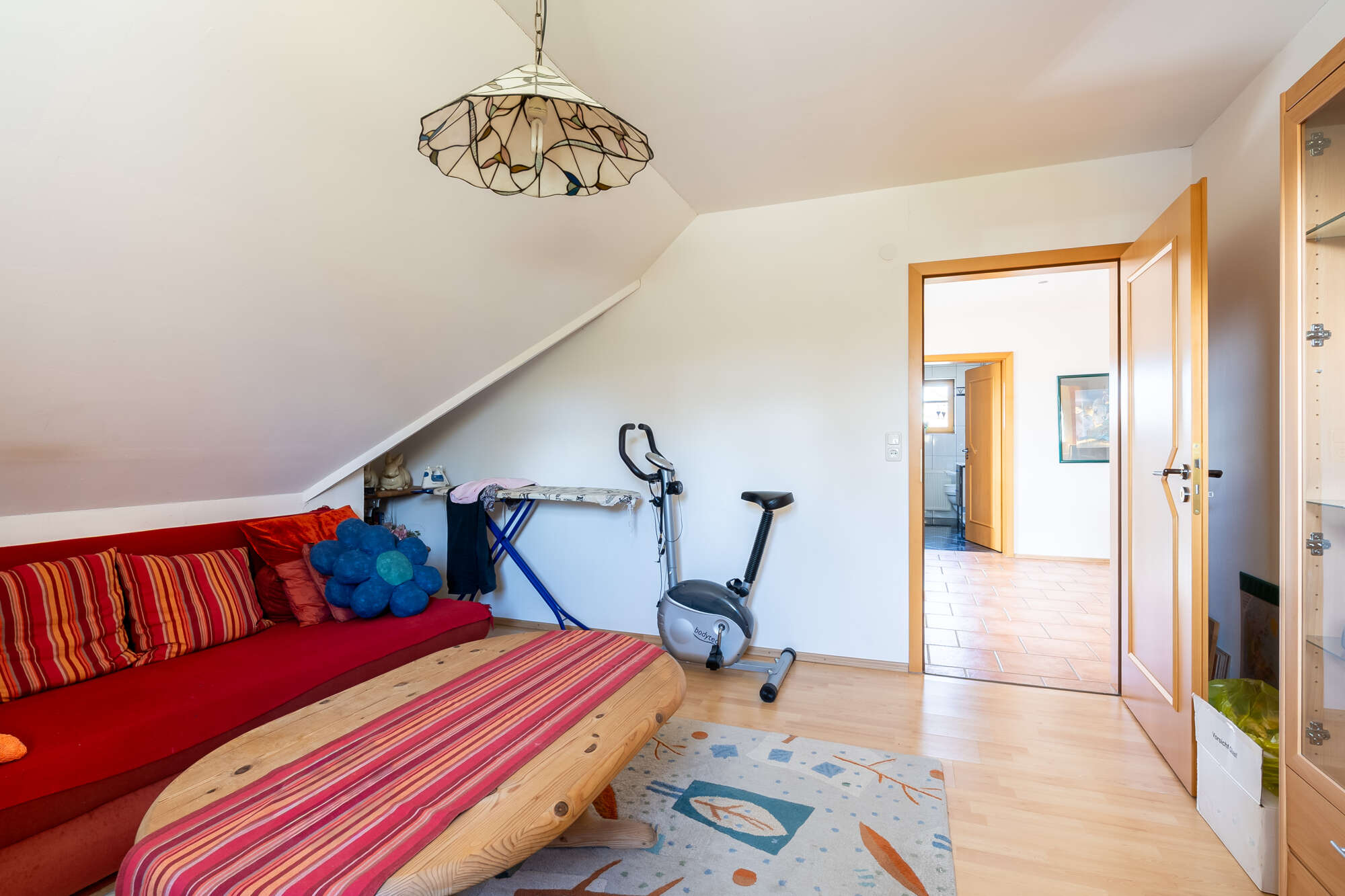 Im Erdgeschoss der Einliegerwohnung befinden sich Küche mit Einbauküche und angrenzendem Abstellraum, Esszimmer mit Zugang zur Terrasse sowie ein Badezimmer mit Dusche. Im Dachgeschoss stehen ein Schlafzimmer, ein Wohnzimmer sowie ein weiteres Badezimmer mit Dusche zur Verfügung.
