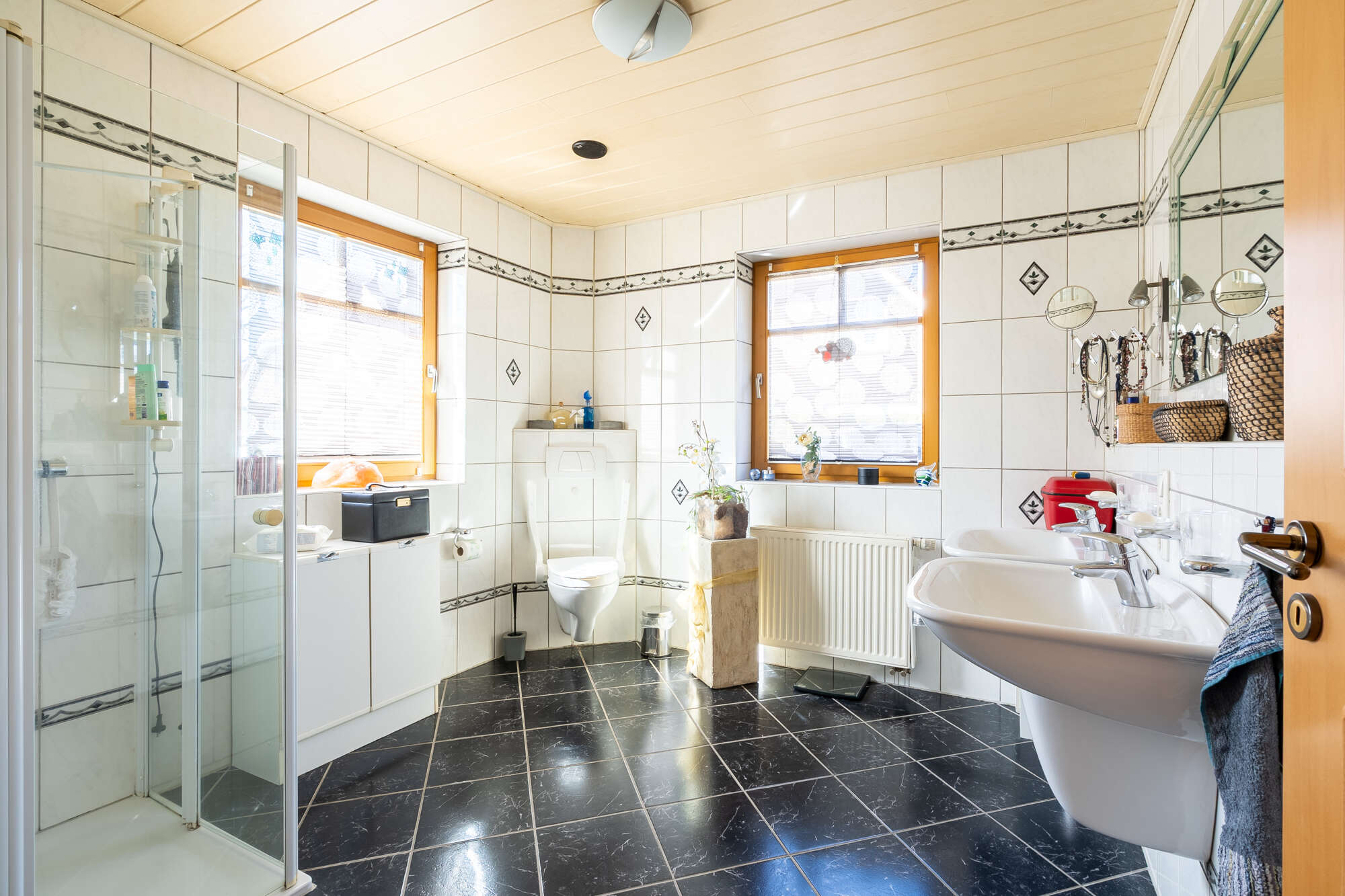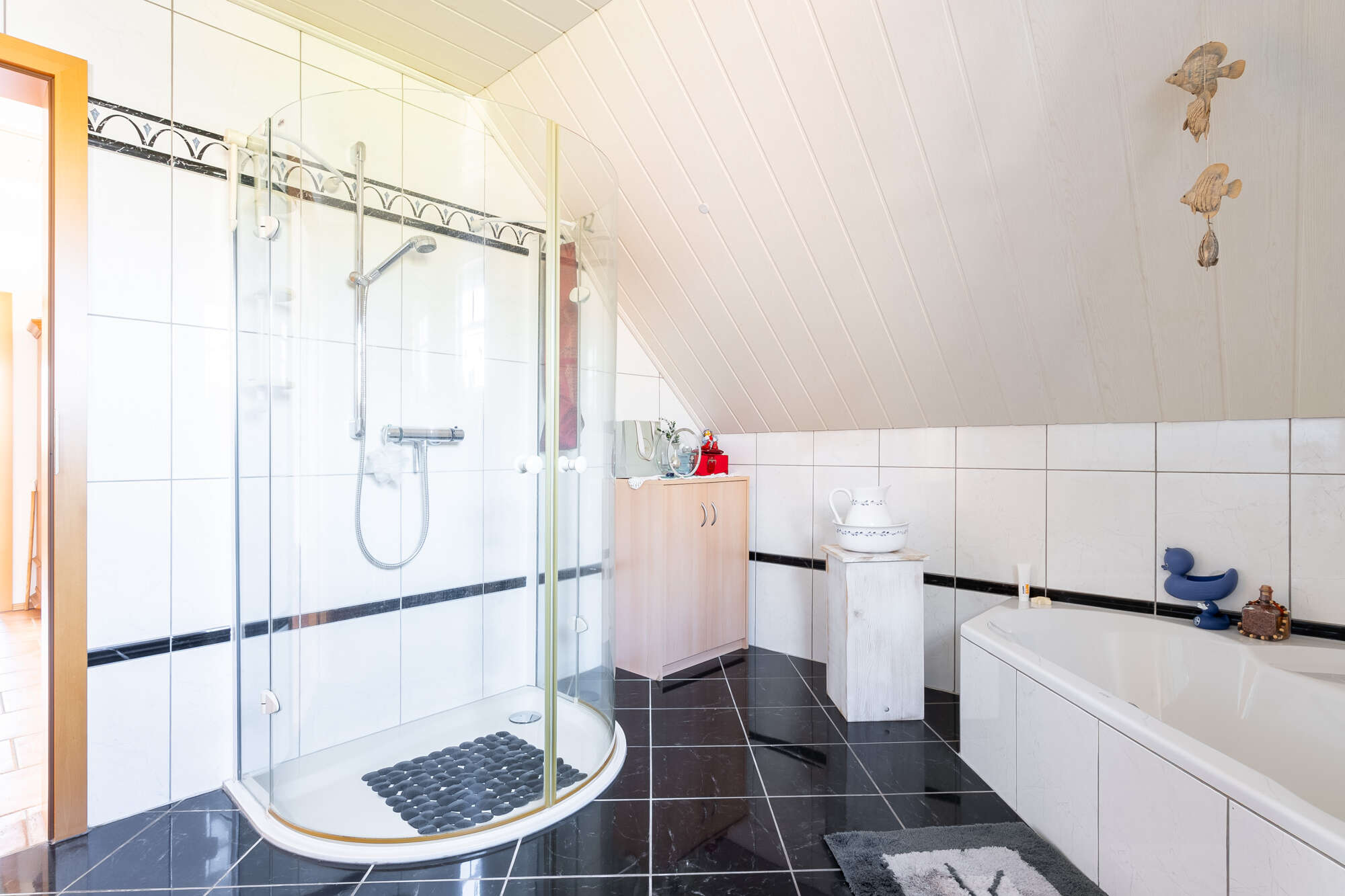Das Obergeschoss bietet ebenfalls eine komfortable Aufteilung über den Flur. Hier befinden sich ein Badezimmer mit Dusche, Badewanne und Fußbodenheizung, ein Schlafzimmer mit angrenzendem Ankleidezimmer sowie zwei weitere flexibel nutzbare Zimmer – ideal als Kinder-, Gäste- oder Arbeitszimmer.