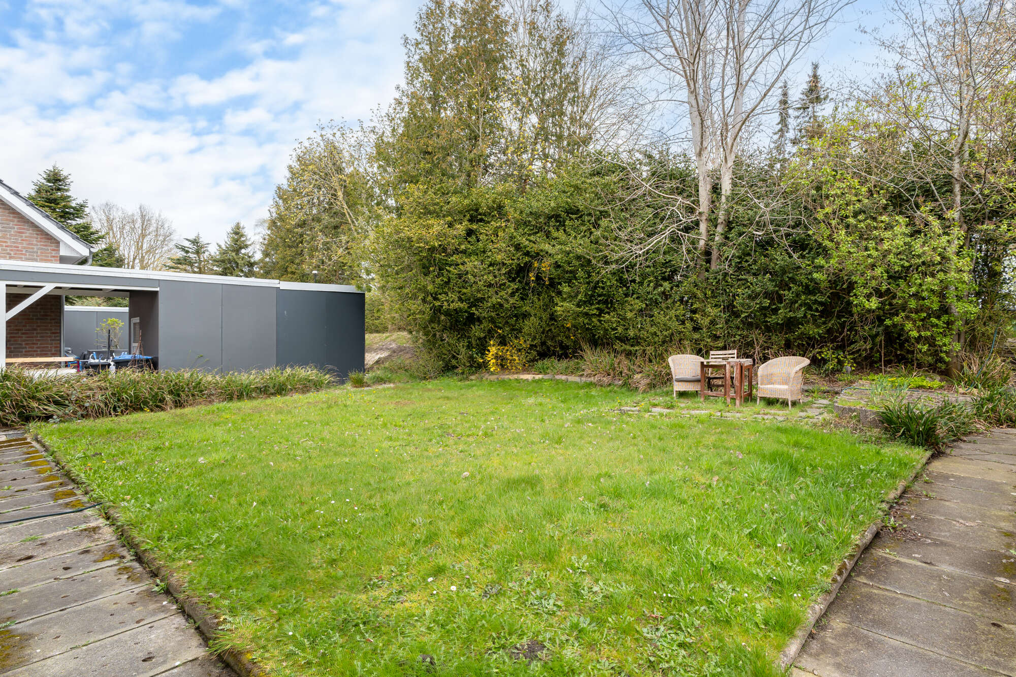 Eine Rasenfläche mit angrenzender Hecke hinter dem Haus gehört zur Oberwohnung. Der Rasen muss von den neuen Mietern gepflegt werden, das Schneiden der Hecke würde nach Absprache auch von den Eigentümern übernommen werden.